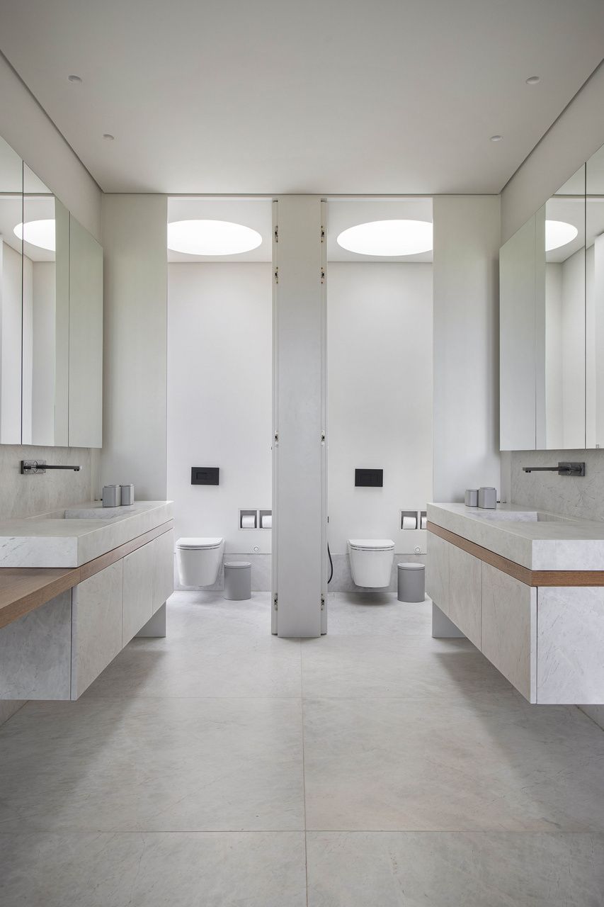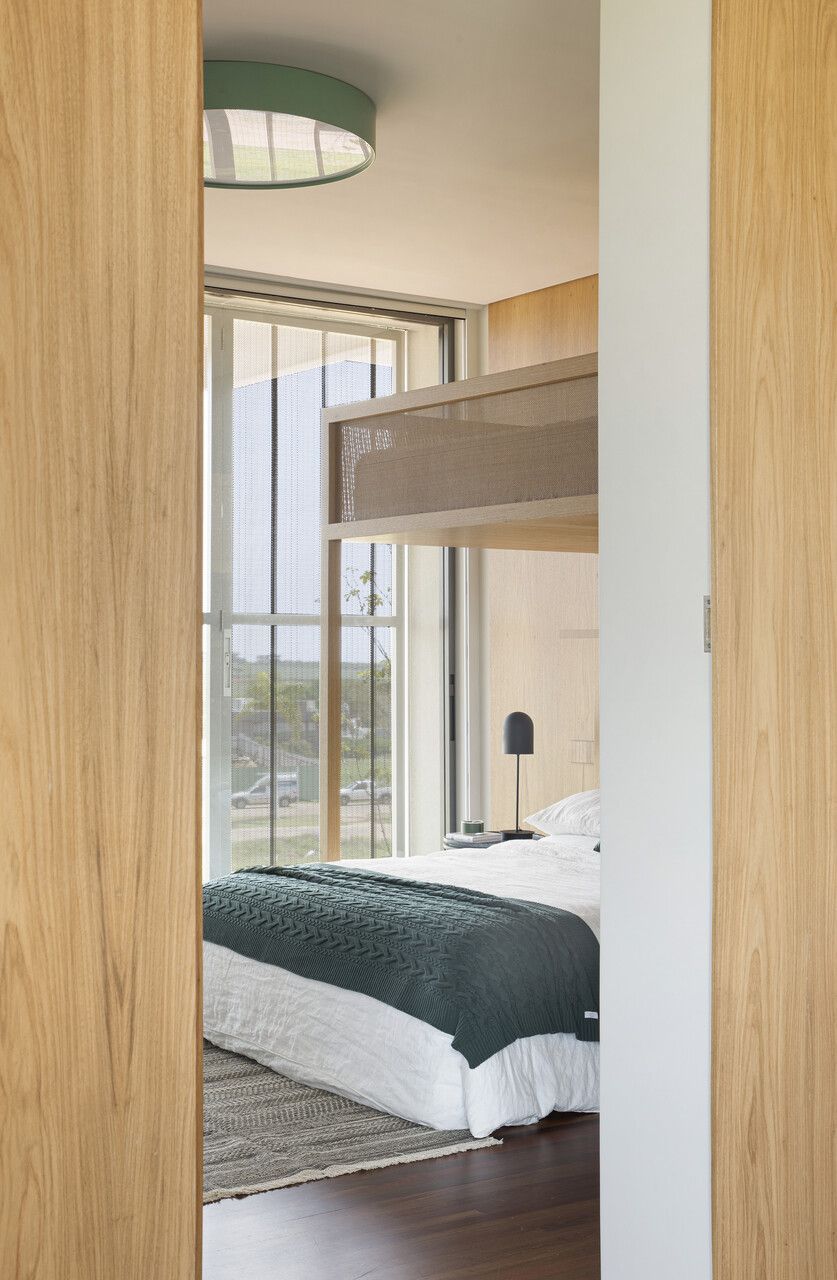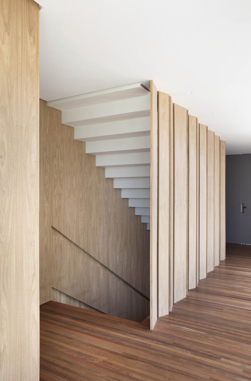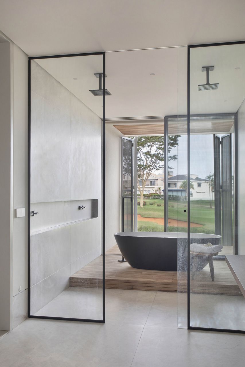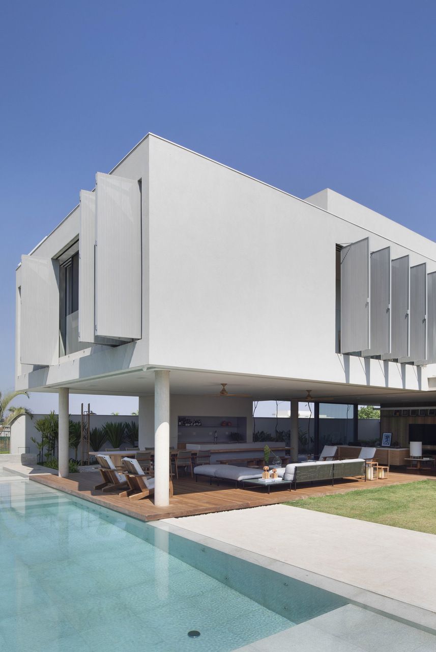 Com 797m² distribuídos em dois andares, a casa foi construída com concreto, vidro e madeira, combinando linhas retas e tons neutros. No térreo, ficam a área social, a cozinha e os espaços de serviço. No andar de cima, estão três suítes e um escritório que também pode ser usado como quarto de hóspedes. A parte superior da casa fica suspensa sobre pilotis aparentes, criando um visual leve.