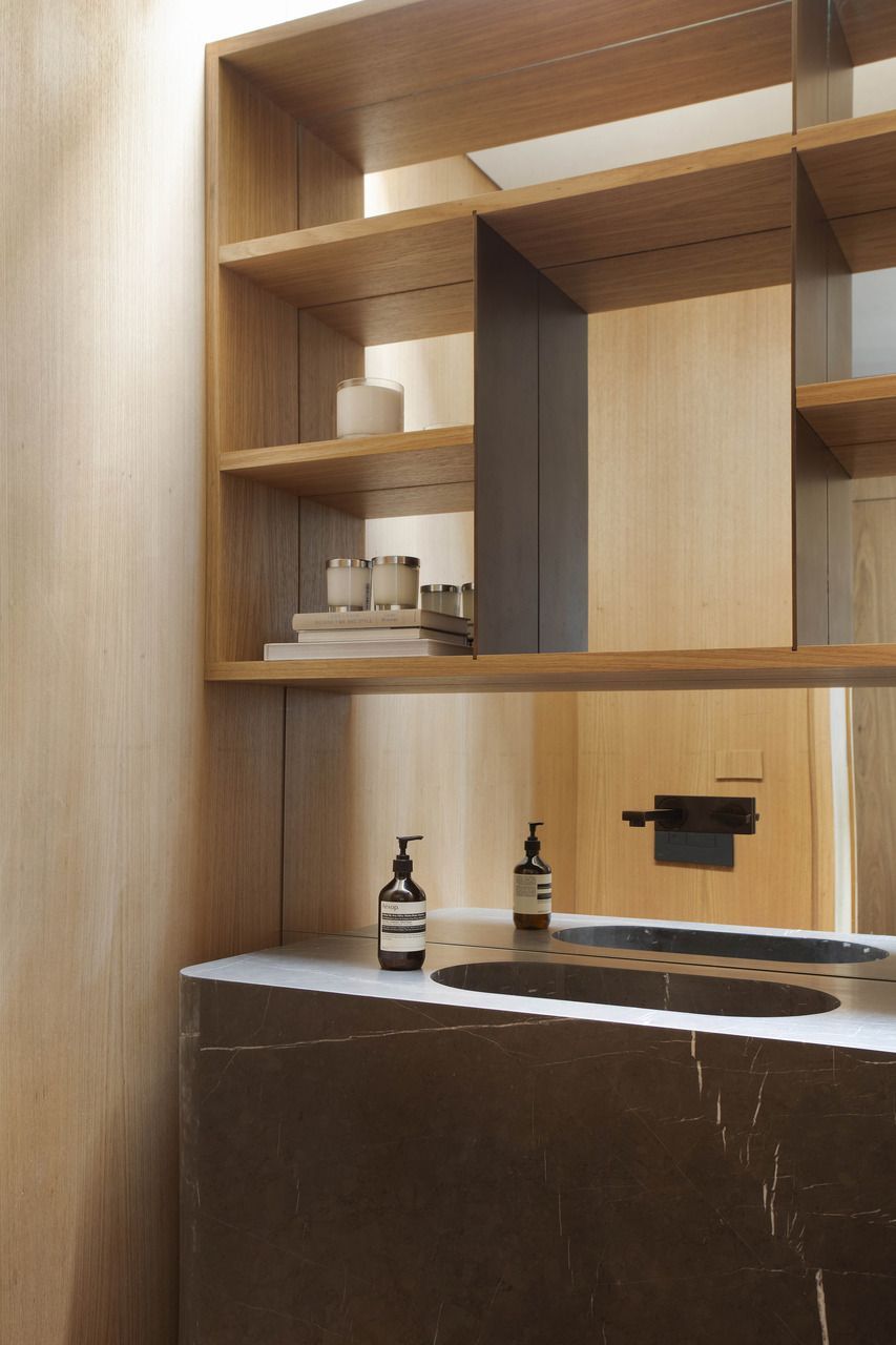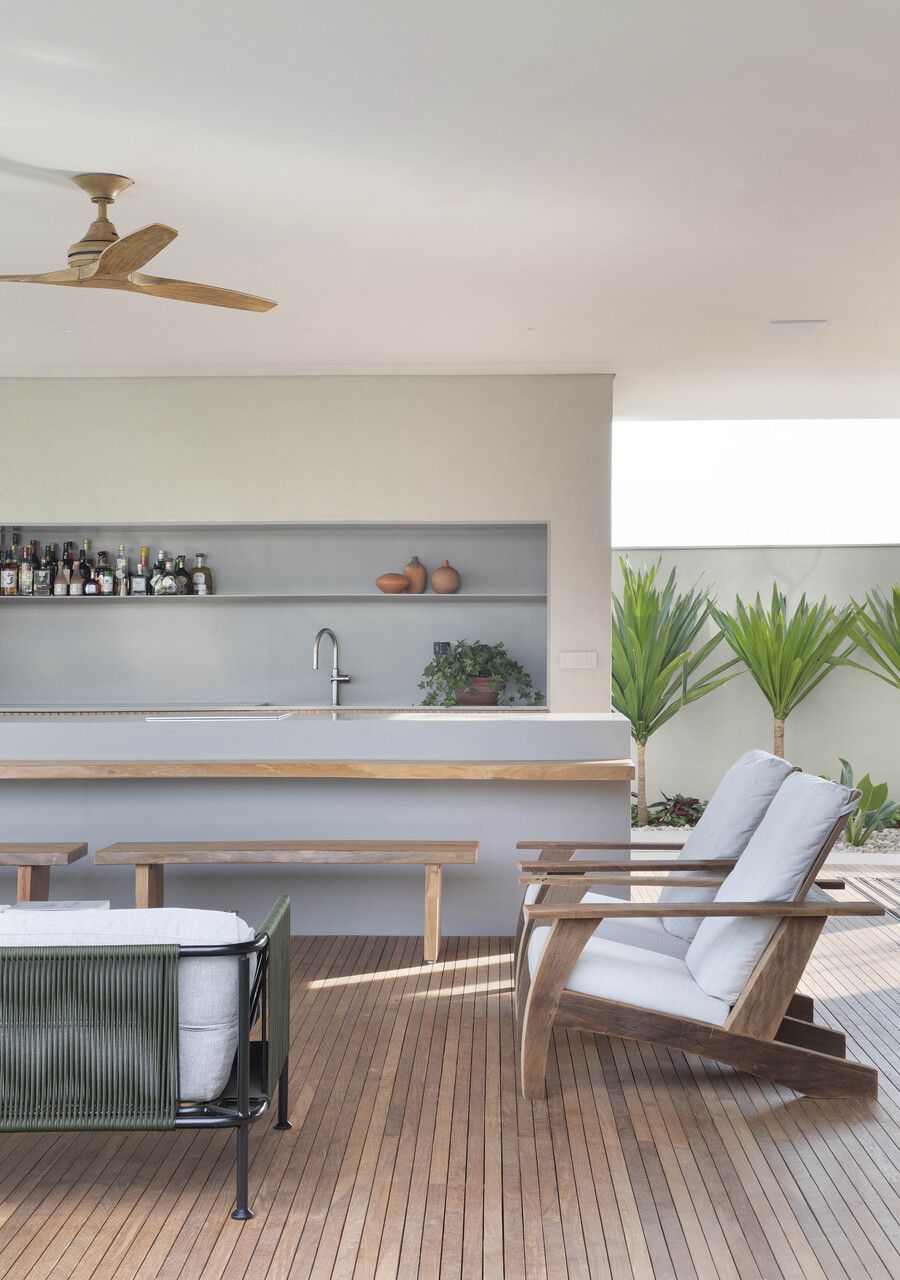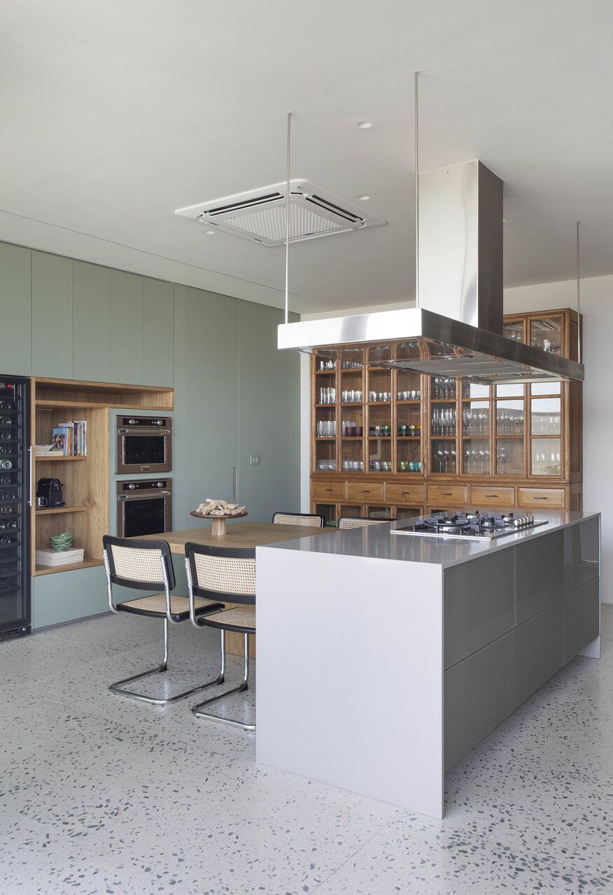Na parte externa, a piscina com borda infinita foi revestida com Quartzo Solidus Grigio Fosco. O banheiro da suíte principal tem mármore Branco Paraná levigado, com uma banheira sobre um deck de madeira voltada para a área externa. Já na cozinha, os destaques são o piso de granilite, a ilha de cocção em pedra sintética cinza claro e os armários em madeira e verde oliva.