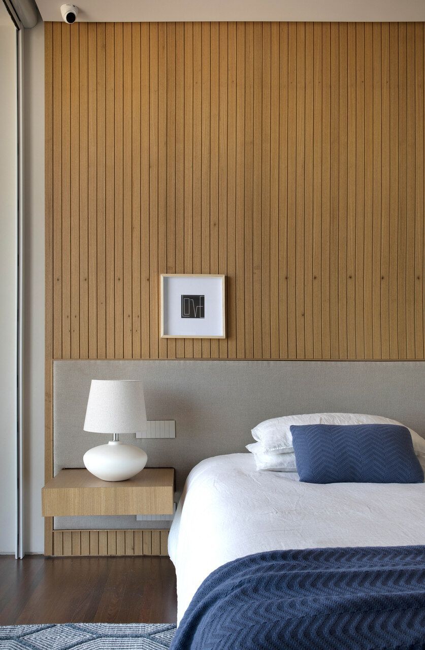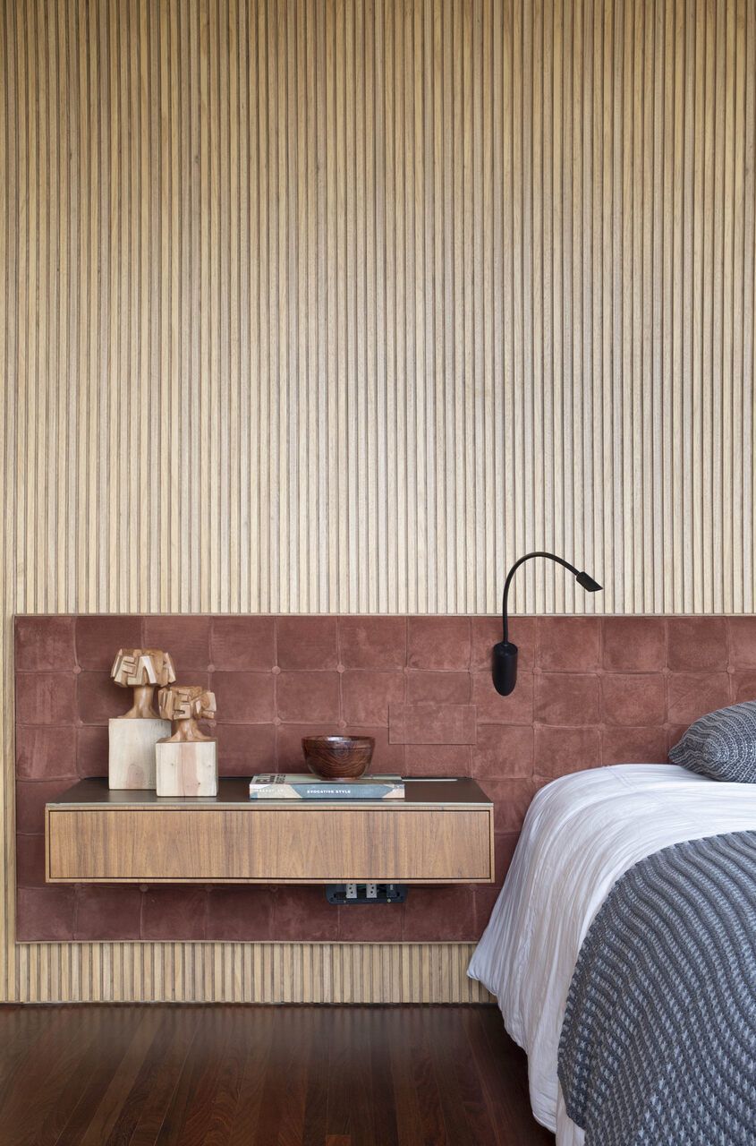 Poucos materiais foram usados para manter uma unidade visual. O piso de madeira Ipê está presente em toda a casa, desde a entrada até o deck da área gourmet. Para controlar a luz do sol e trazer conforto térmico, a fachada recebeu brises verticais móveis em chapa metálica perfurada, que também criam um jogo de luz e sombra ao longo do dia.