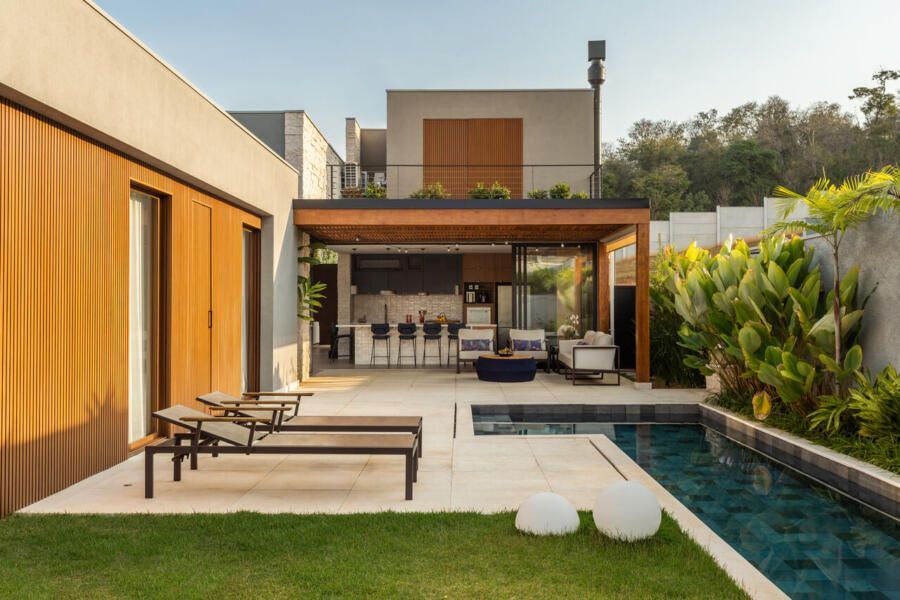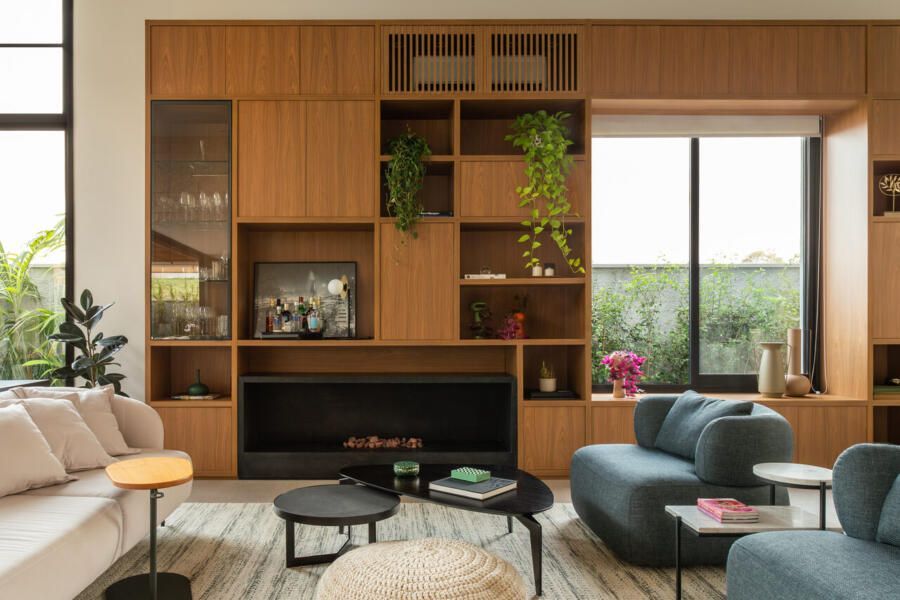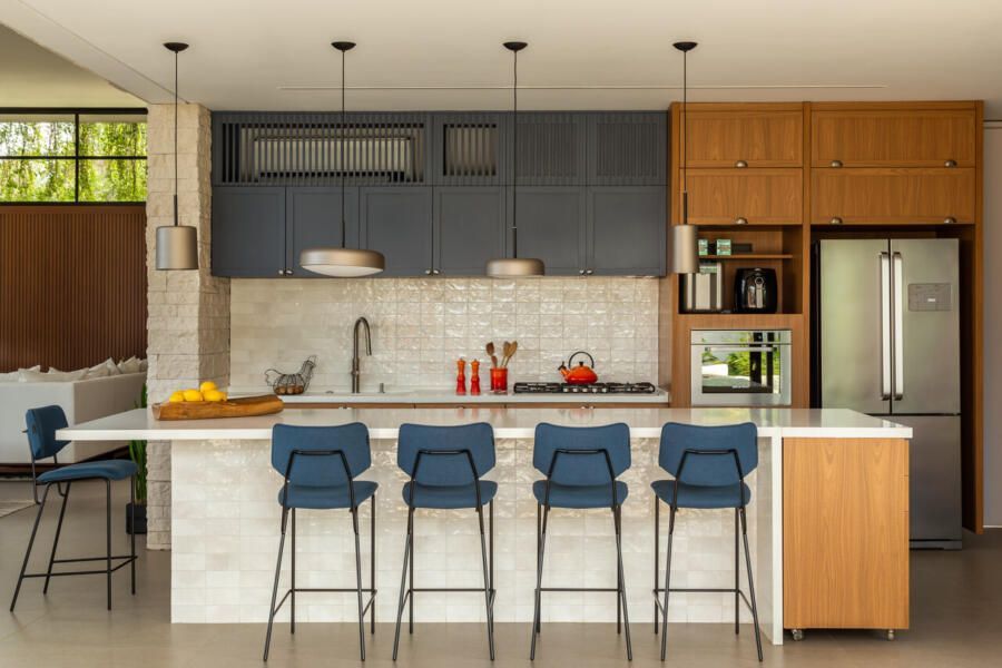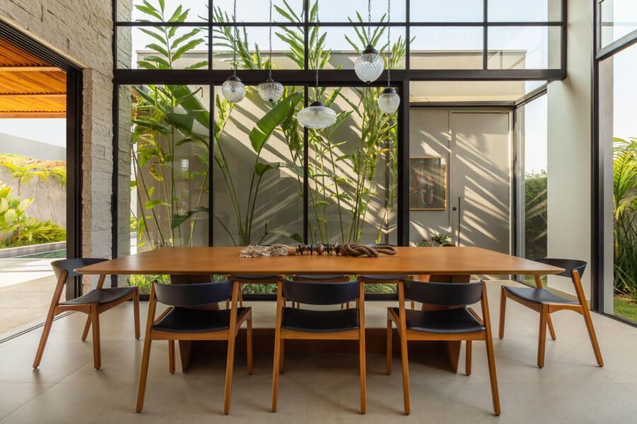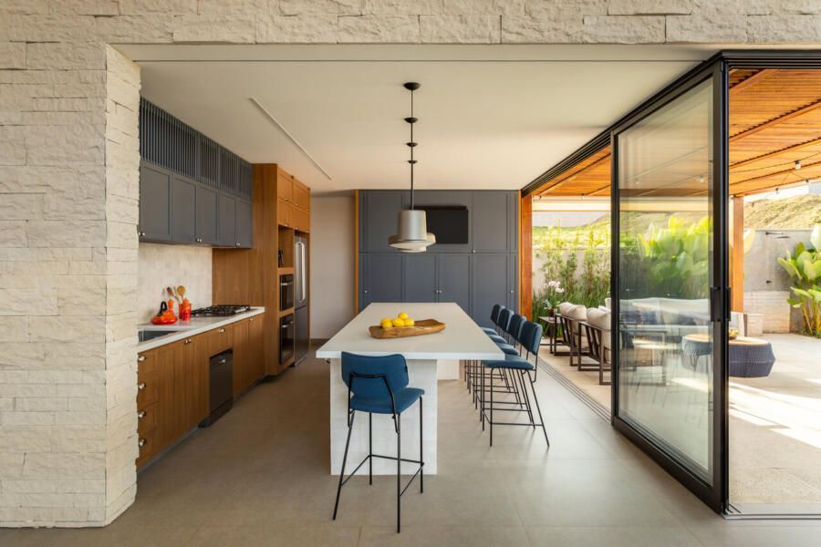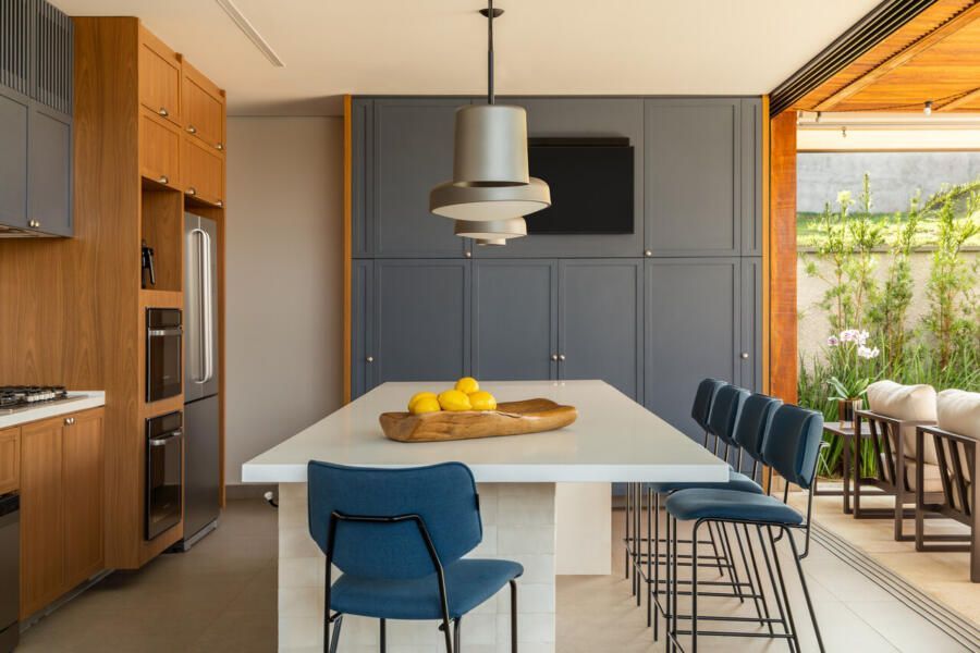 A área social da casa foi pensada para ser integrada e funcional. A sala de TV, estar e lareira se conectam à cozinha e à varanda, criando um espaço perfeito para receber visitas. Um dos pedidos dos moradores era que a churrasqueira ficasse discreta no dia a dia. Para resolver isso, a cozinha e a área da churrasqueira foram unidas, e um sistema de portas escamoteáveis esconde a churrasqueira quando não está em uso. Outro detalhe pensado para a rotina foi um nicho específico para a air fryer dentro do armário, deixando o equipamento sempre à mão sem ocupar espaço na bancada. A sala de jantar, cercada pelo jardim, tem um jogo bonito de luz e sombra ao longo do dia, e à noite a iluminação cria um clima aconchegante, complementado pelos pendentes de vidro.