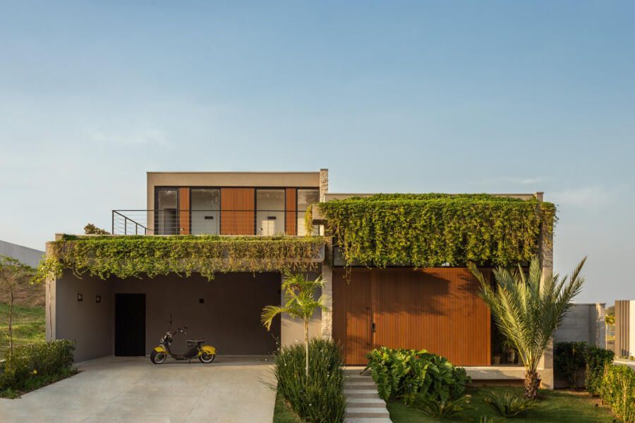 Os ambientes da casa foram distribuídos em dois blocos: um para as áreas sociais e serviços, e outro para os quartos. Entre eles, uma passagem de vidro conecta os espaços e permite uma visão direta do jardim, elemento essencial no projeto. A proposta era que o verde fizesse parte da casa em todas as estações do ano, criando uma atmosfera acolhedora e relaxante. O jardim também aparece na fachada, com plantas no beiral da parte superior que, vistas de dentro da sala, criam uma verdadeira cortina verde. Além da estética, esse detalhe traz mais privacidade e conforto térmico para o ambiente.
