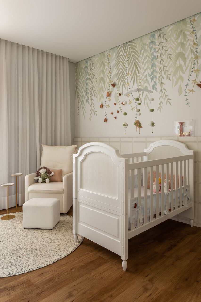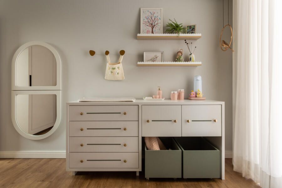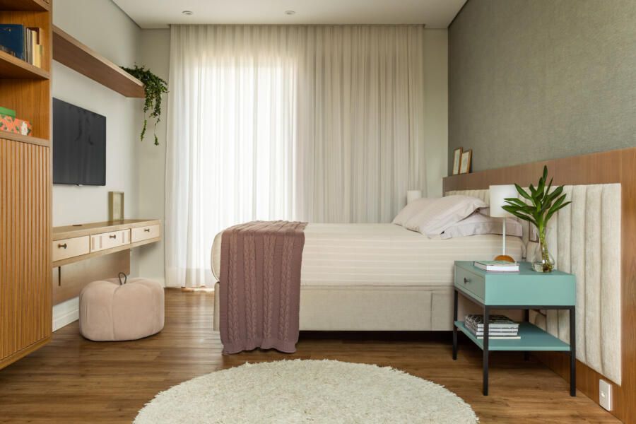 Nos quartos, a mesma ideia de integração com o jardim foi aplicada. As portas de alumínio da suíte do casal e dos outros quartos permitem diferentes níveis de abertura para controlar a entrada de luz e ventilação. No banheiro da suíte, o revestimento verde destaca a área do box, que tem um vidro fixo para ampliar a sensação de espaço. O quarto da filha foi planejado para ser prático e aconchegante, com uma cômoda sob medida e detalhes em verde e dourado, combinando com os amigurumis feitos pela avó, que dão um toque especial ao ambiente.