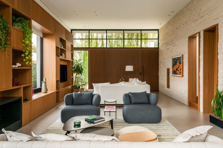 Outro ponto importante do projeto foi a iluminação. A casa recebeu um sistema automatizado em alguns pontos, permitindo ajustar a intensidade da luz para criar diferentes atmosferas ao longo do dia. Na sala com pé-direito alto, foram instalados pontos de iluminação no piso para luminárias de apoio, e a estante, que integra TV, bar e armazenamento, também recebeu pontos de luz para destacar objetos decorativos e reforçar a sensação de aconchego.