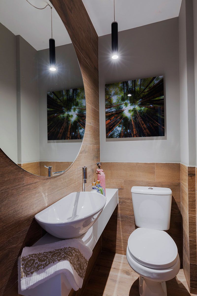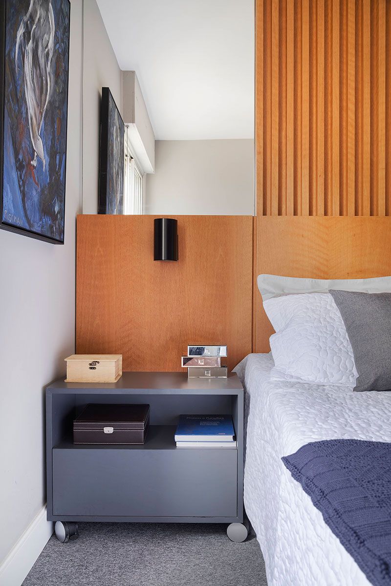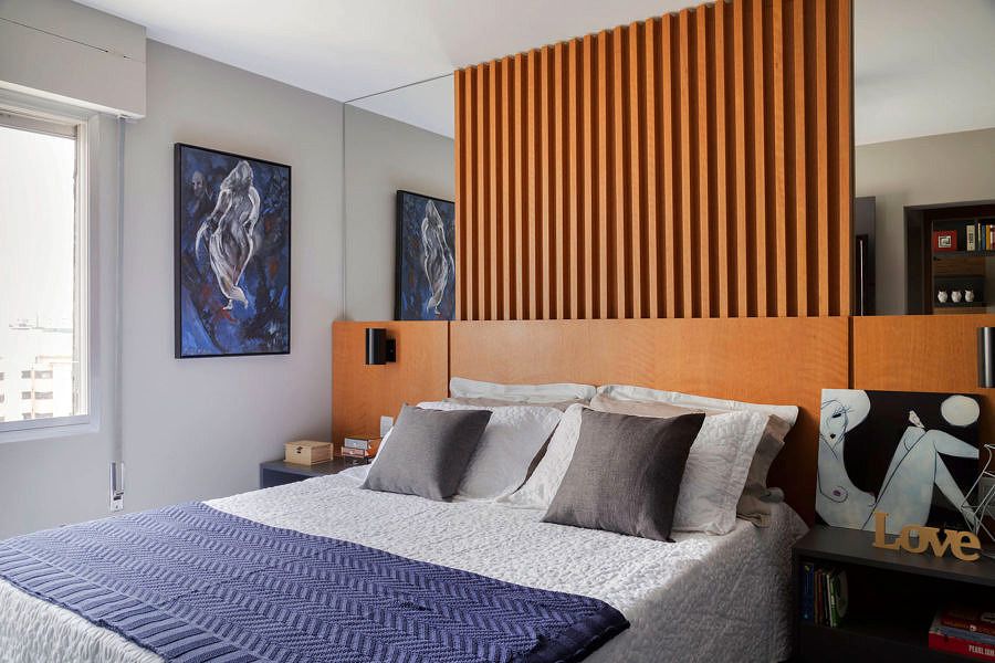 Os tons neutros e o uso da madeira permeiam todo décor. No quarto, duas faixas de espelhos laterais, entre o teto e a cabeceira, se revelam como um ótimo recurso para cômodos pequenos. A cabeceira conta com apenas 7 cm de espessura e, ao centro, forma um painel ripado alinhado a cama.