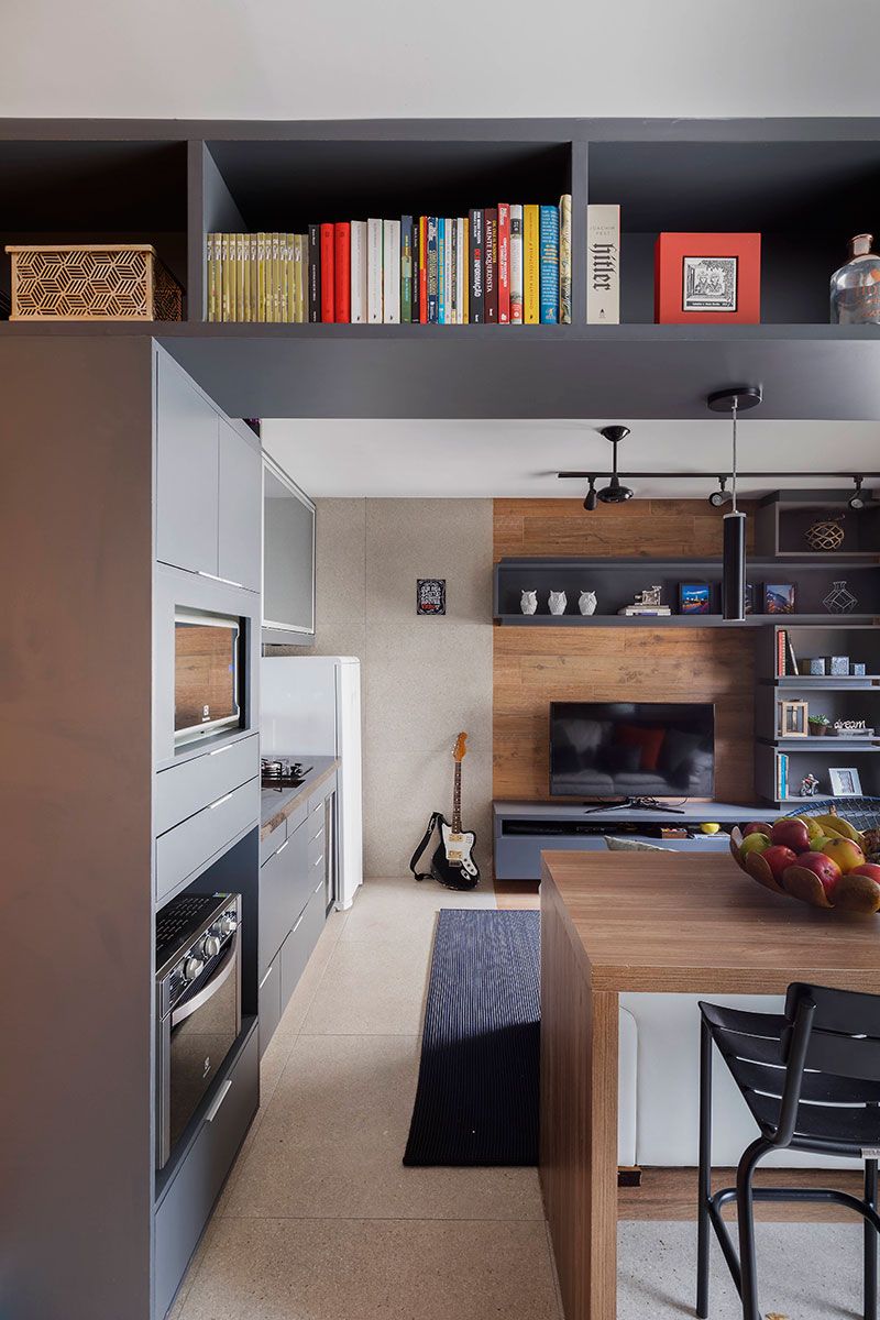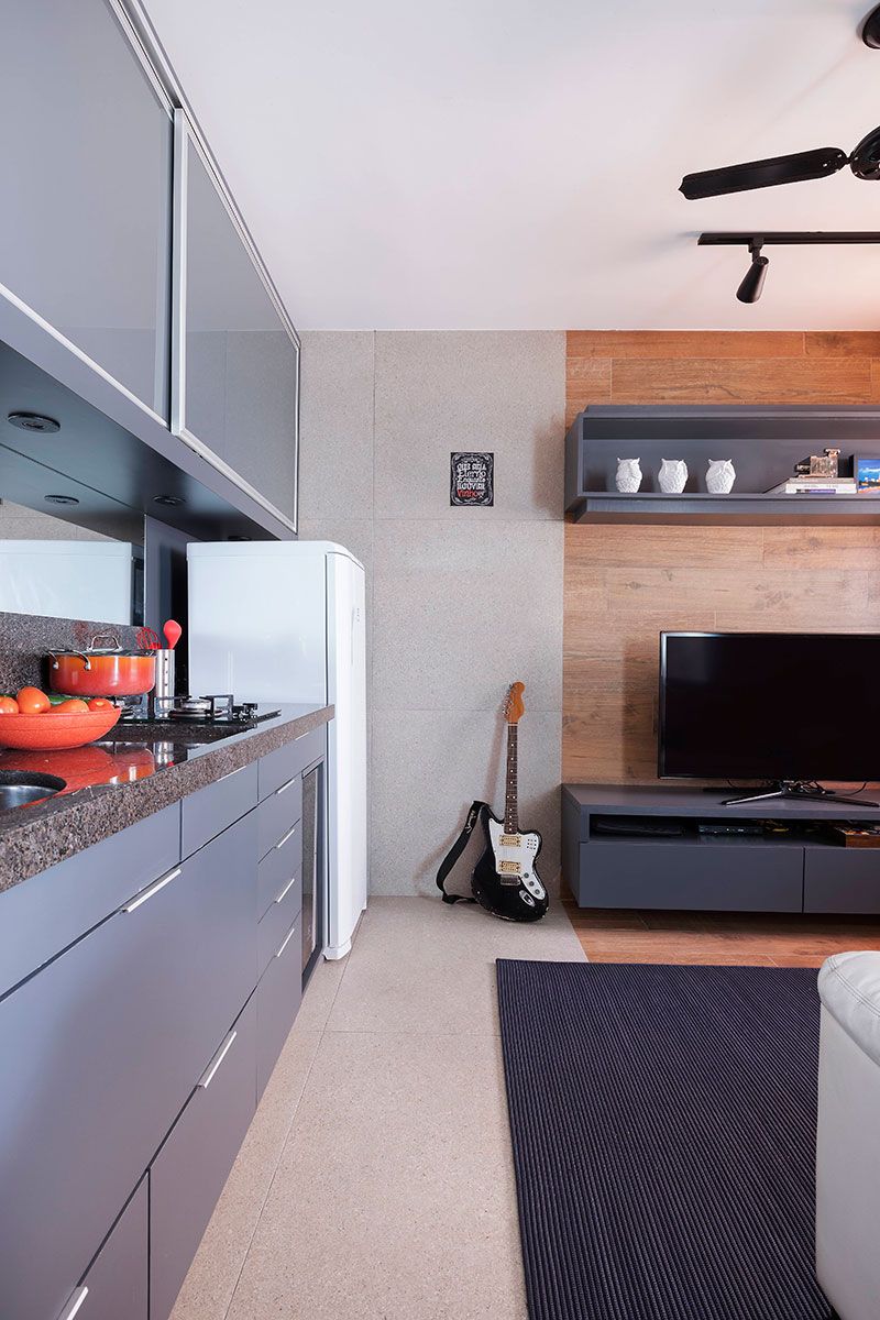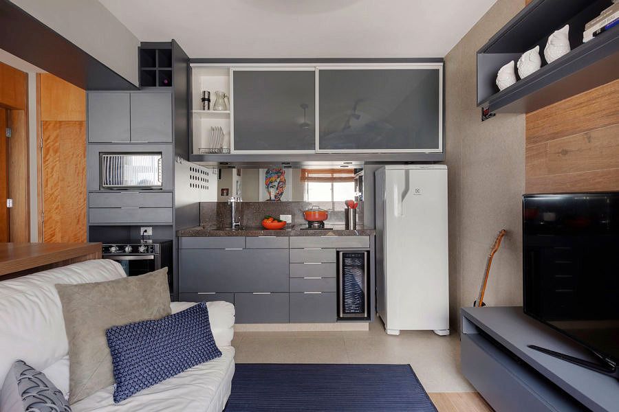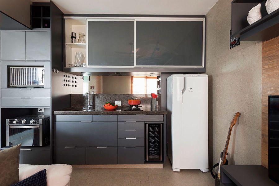 A pequena cozinha é funcional, o módulo vertical acomoda o forno e o micro-ondas e, sobre a pia, o armário superior oferece espaço para o escorredor de louças, deixando espaço livre para utilização na bancada, que ainda conta com um espelho que reflete a luz natural da janela e traz amplitude ao ambiente.