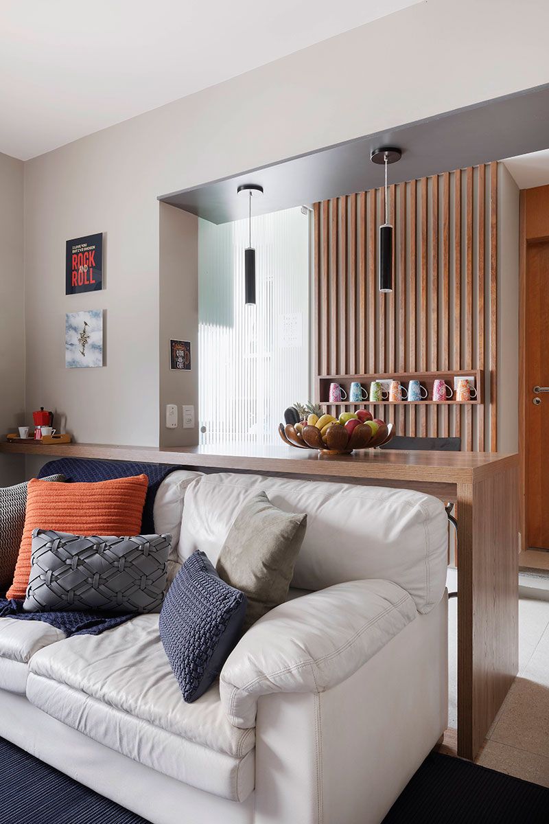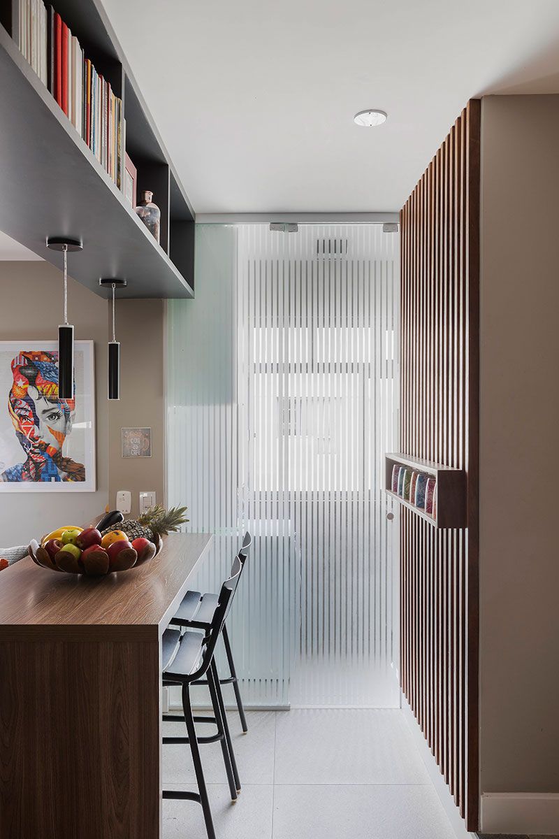 Multiuso, a bancada em MDF, acompanhada pelas banquetas, funciona como mesa de jantar. Entre cozinha e a sala, a marcenaria inclui nichos, rente ao teto, para que os moradores organizem seus os livros. No fim do corredor, atrás da bancada, a porta de correr, em vidro temperado, garante privacidade à lavanderia e não impede a passagem de luz natural.