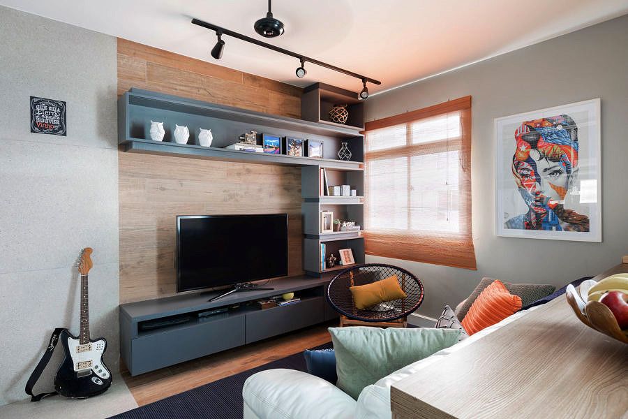 A parede entre a cozinha e a sala de estar foi retirada para que os ambientes ficassem maiores, favorecendo a interação entre moradores e visitas, já que o casal adora receber os amigos e cozinhar. A arquiteta escolheu delimitar os espaços com revestimentos diferentes. Para a cozinha, por exemplo, Carmem escolheu uma imitação de pedra e, na sala, o porcelanato que remete à madeira. Na busca pela leveza na sala de estar, a estante, com marcenaria sob medida, brinca com nichos, prateleiras e módulos.