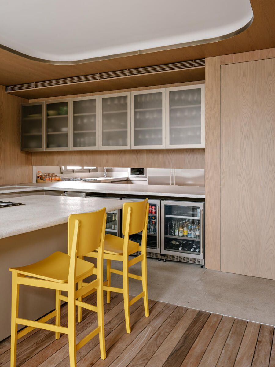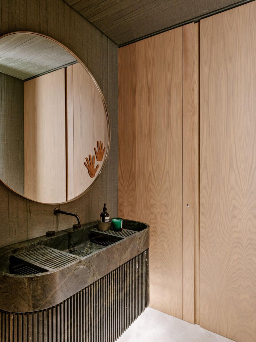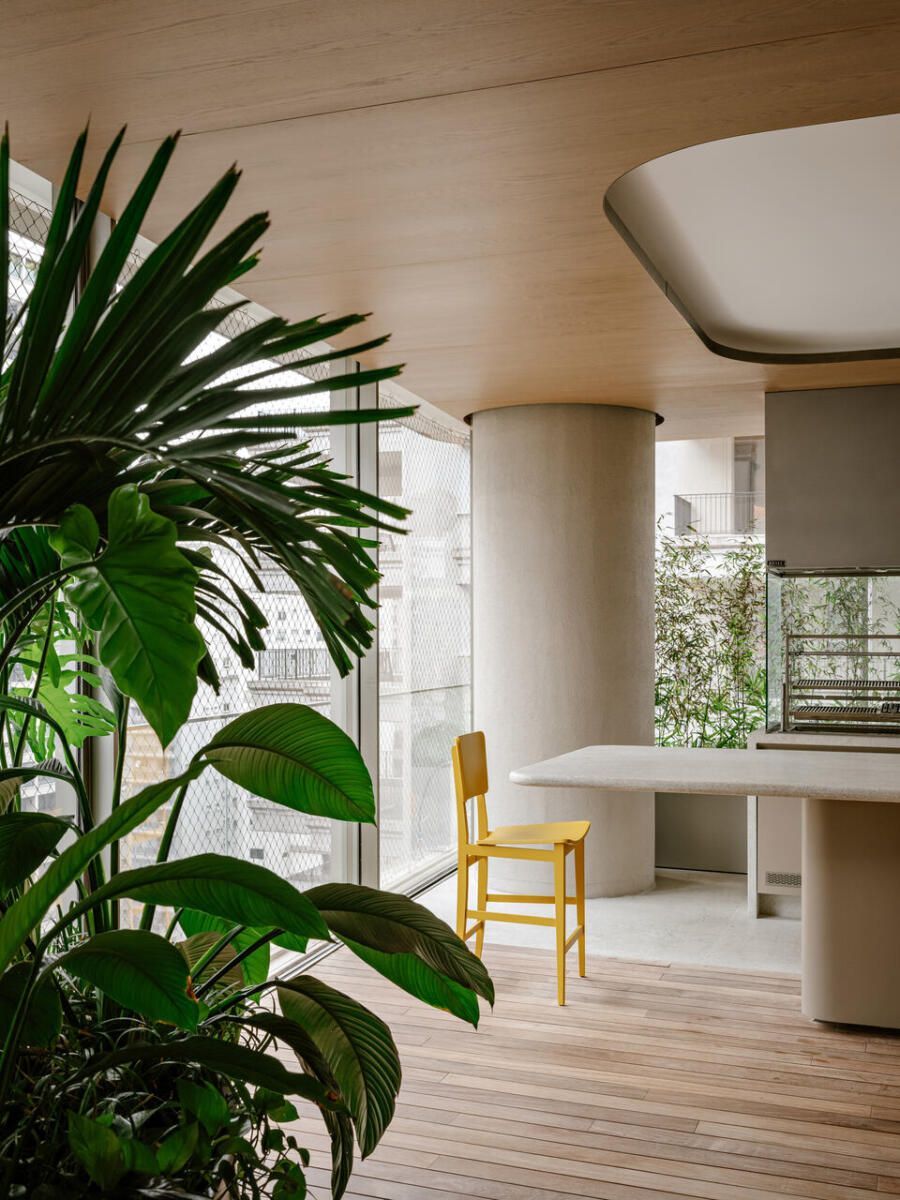 A varanda de 56m² também passou por grandes mudanças. Parte das esquadrias foi removida para integrá-la ao espaço gourmet, que agora se conecta à cozinha por um painel de madeira com portas camufladas. Isso deixou a área mais prática e organizada.