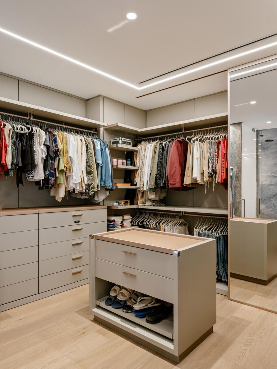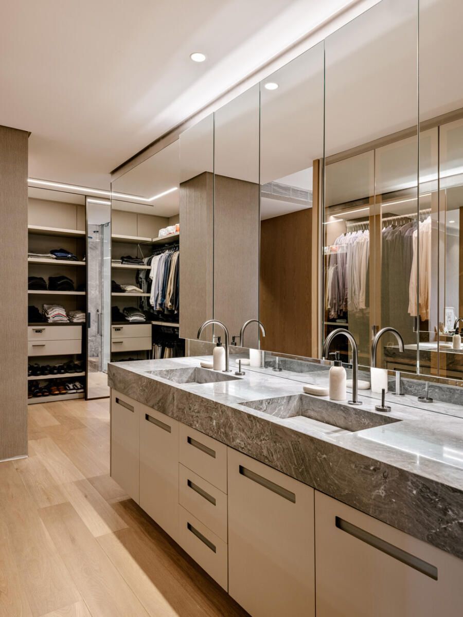 Uma das principais mudanças foi na suíte do casal. O closet e o banheiro, que antes eram separados, foram unificados para aproveitar melhor o espaço. O banheiro ficou no meio, com um lado do closet para cada um, sem paredes dividindo os dois ambientes. O box do chuveiro recebeu duas portas, permitindo acesso pelos dois lados.