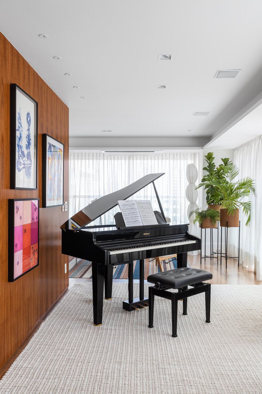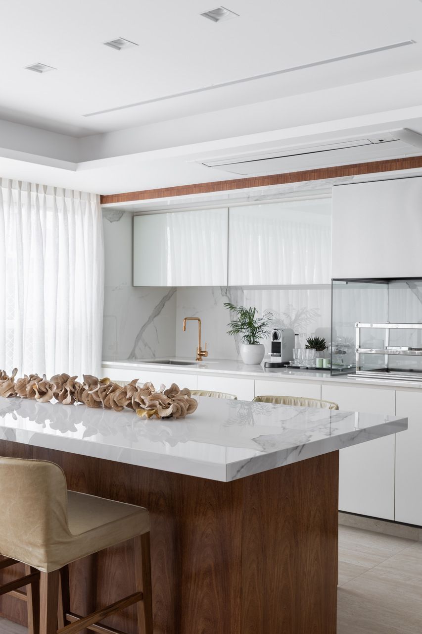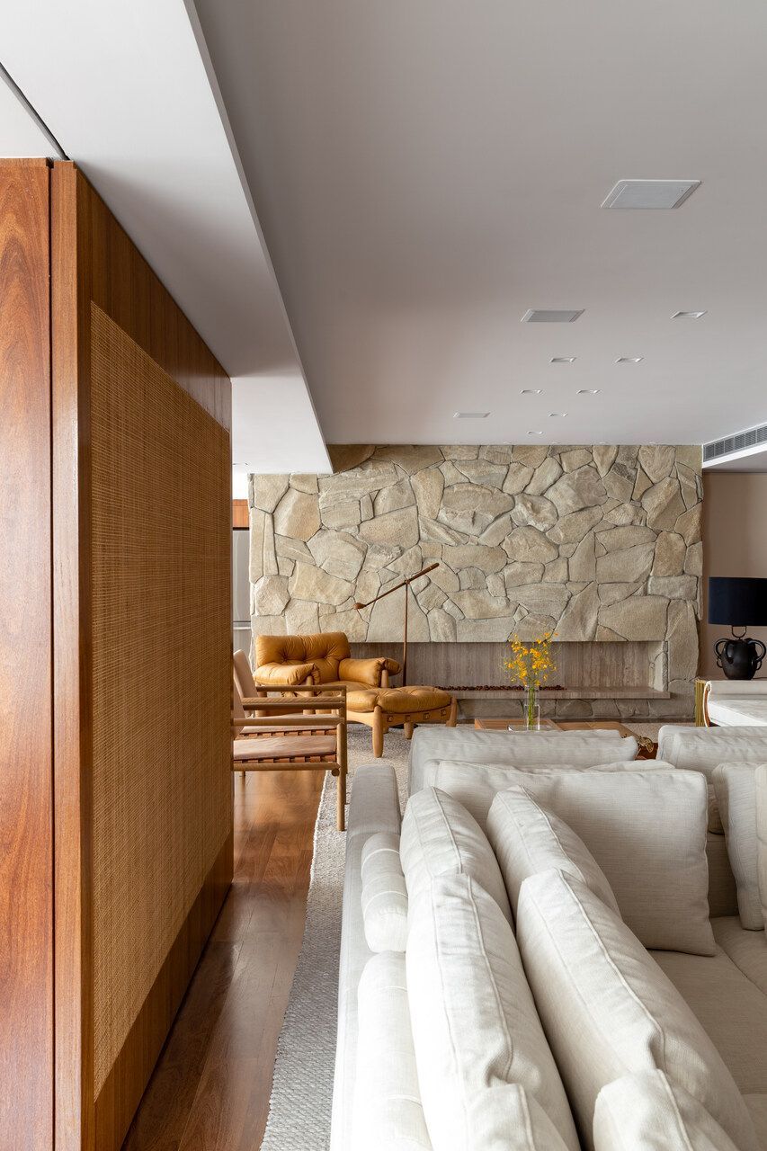 A paleta de cores neutra valoriza materiais naturais como mármore travertino romano, madeira cumaru, freijó e granito bruto. Pequenos toques de azul aparecem em pontos estratégicos da marcenaria e em papéis de parede. A sala é integrada, mas com zonas bem definidas para jantar, TV, piano e leitura. A varanda ganhou mais vida com um canto de plantas iluminadas por refletores suaves.