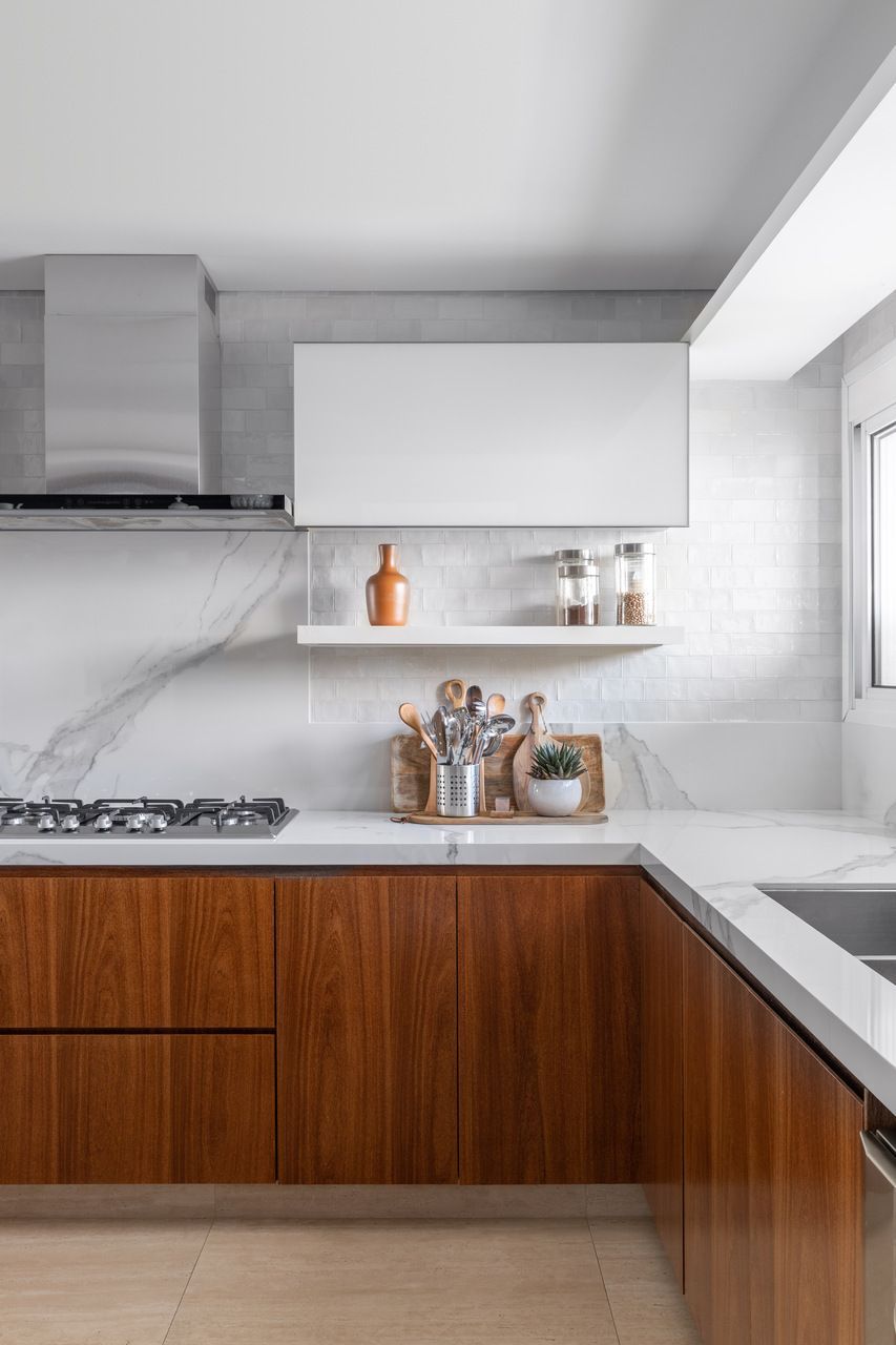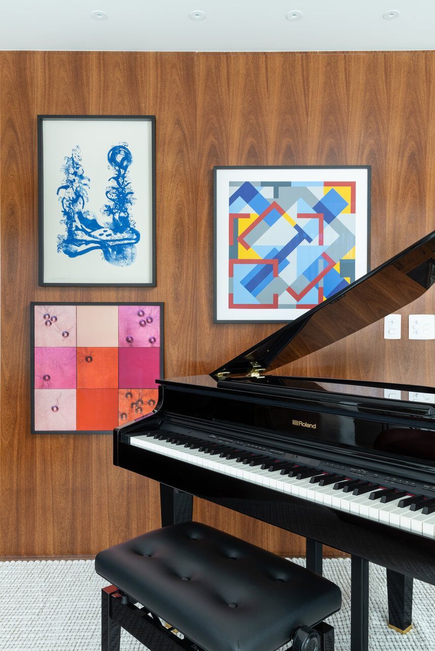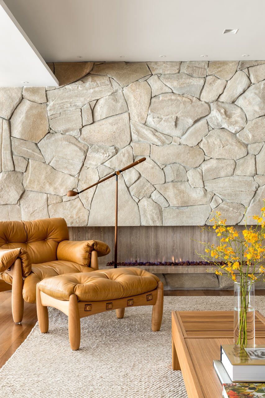 A paleta de cores neutra valoriza materiais naturais como mármore travertino romano, madeira cumaru, freijó e granito bruto. Pequenos toques de azul aparecem em pontos estratégicos da marcenaria e em papéis de parede. A sala é integrada, mas com zonas bem definidas para jantar, TV, piano e leitura. A varanda ganhou mais vida com um canto de plantas iluminadas por refletores suaves.