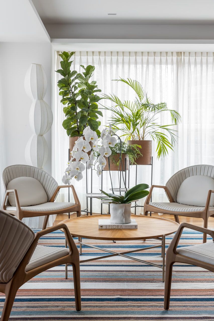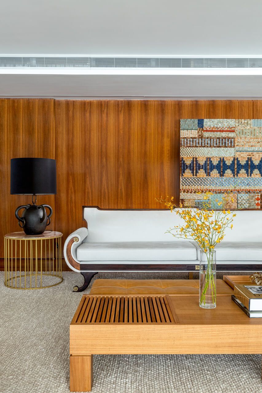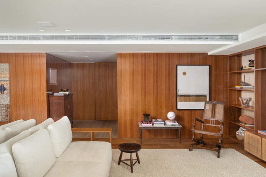 O projeto de iluminação foi outro destaque: abajures, embutidos, pendentes e arandelas criam cenas aconchegantes e valorizam texturas, obras de arte e plantas. Mesmo com tantas mudanças, a reforma teve um olhar atento à sustentabilidade: o piso de madeira original foi reaproveitado, o sistema de ar-condicionado foi trocado por um modelo mais eficiente e toda a iluminação passou a ser LED.