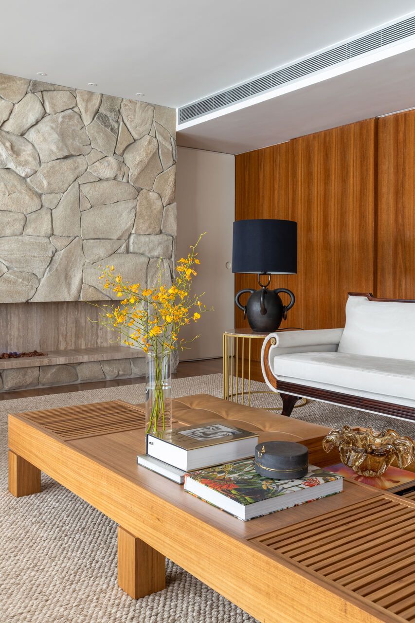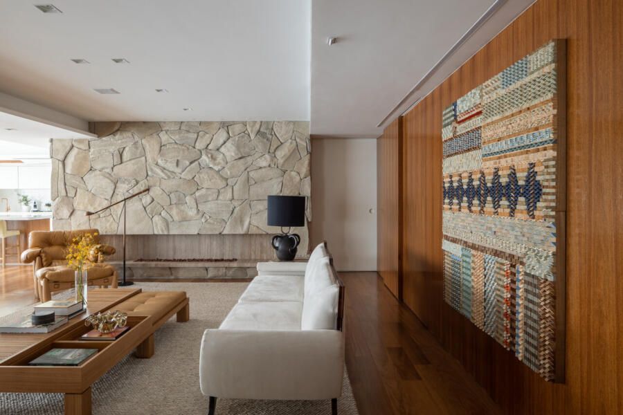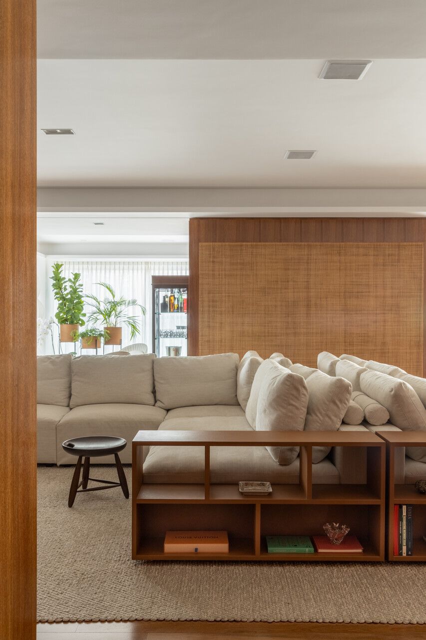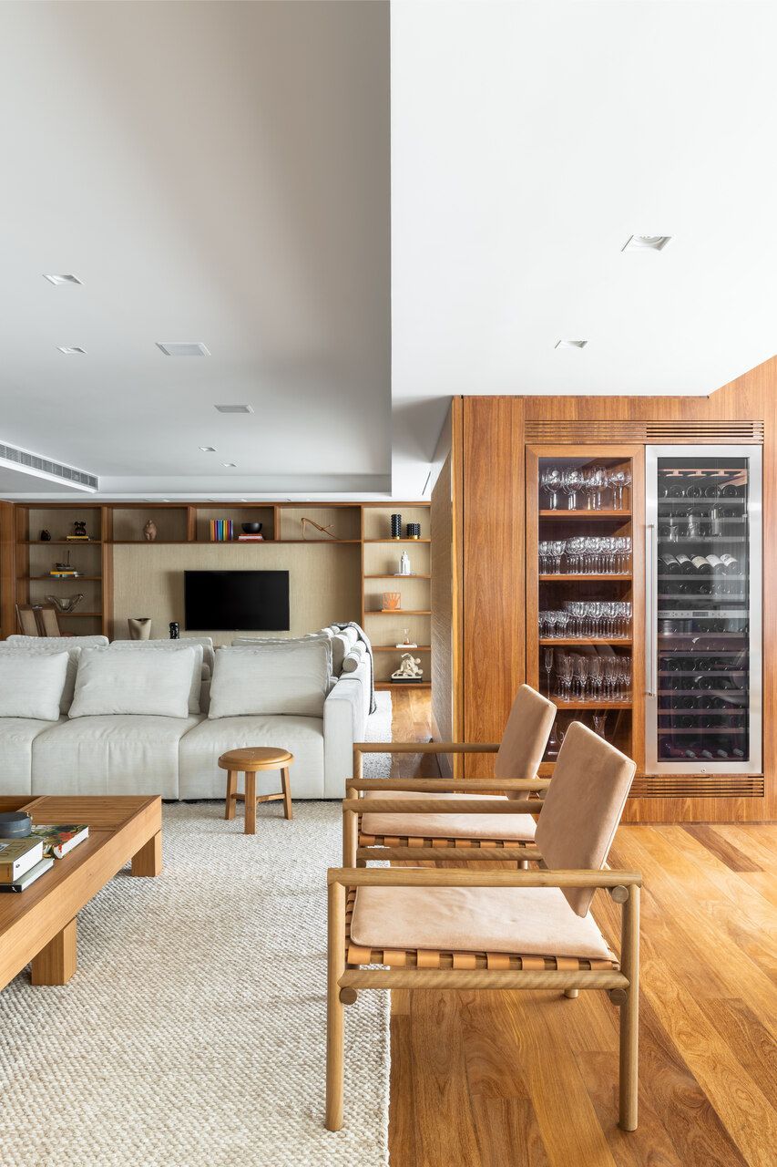 A planta original foi bastante modificada. Na suíte principal, a banheira saiu de cena, o vaso sanitário ganhou um espaço mais reservado, e o closet foi integrado ao quarto. A antiga lareira, que ocupava um grande espaço entre sala e varanda, foi retirada. No lugar, uma marcenaria multifuncional reúne cristaleira, adega e brinquedoteca escondida. A nova lareira foi deslocada para uma posição mais estratégica, e ainda foi criada uma passagem direta entre a área íntima e a de serviço.