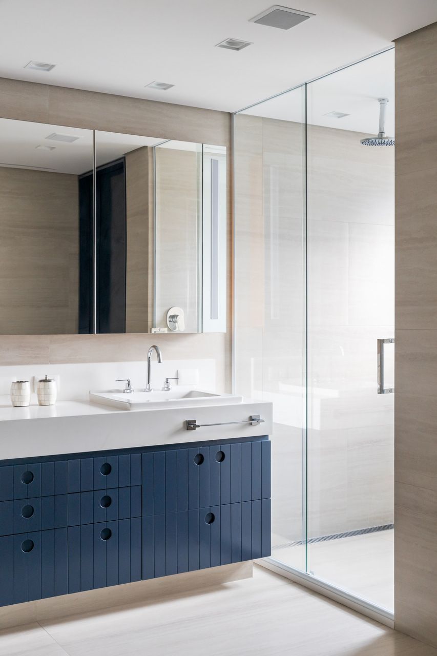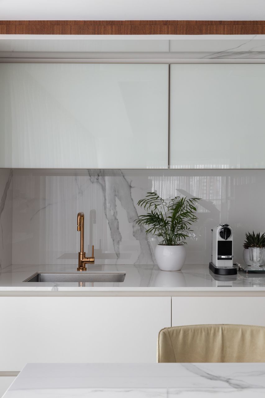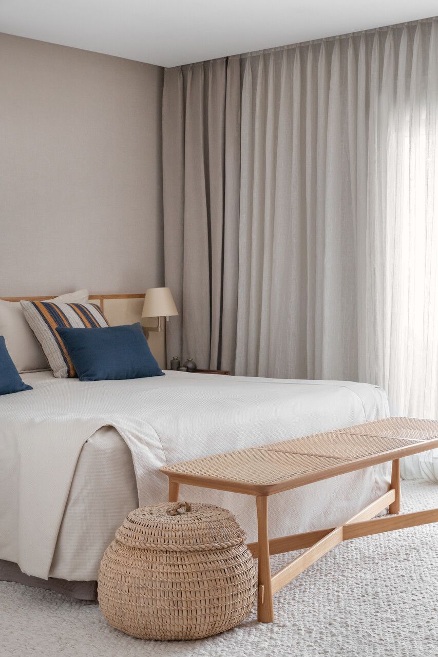 O apartamento tem quatro suítes: a do casal, a das meninas, uma de hóspedes (pensada para virar quarto individual no futuro) e uma última que funciona como home office. Toda a marcenaria foi pensada sob medida, com painéis que escondem portas, armários e até uma louçaria. Algumas peças afetivas, como o sofá da avó e objetos trazidos de viagens, também fazem parte da decoração.
