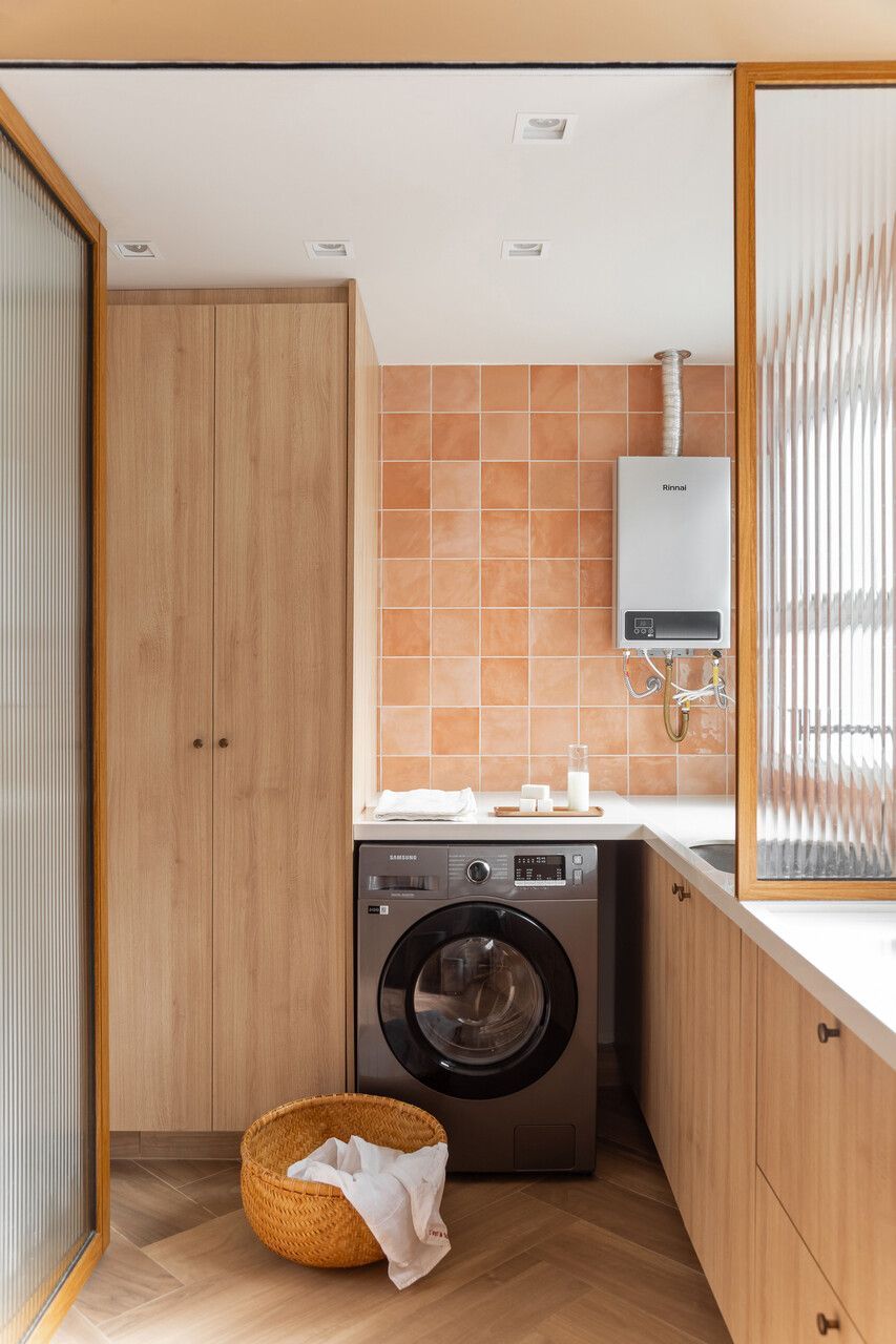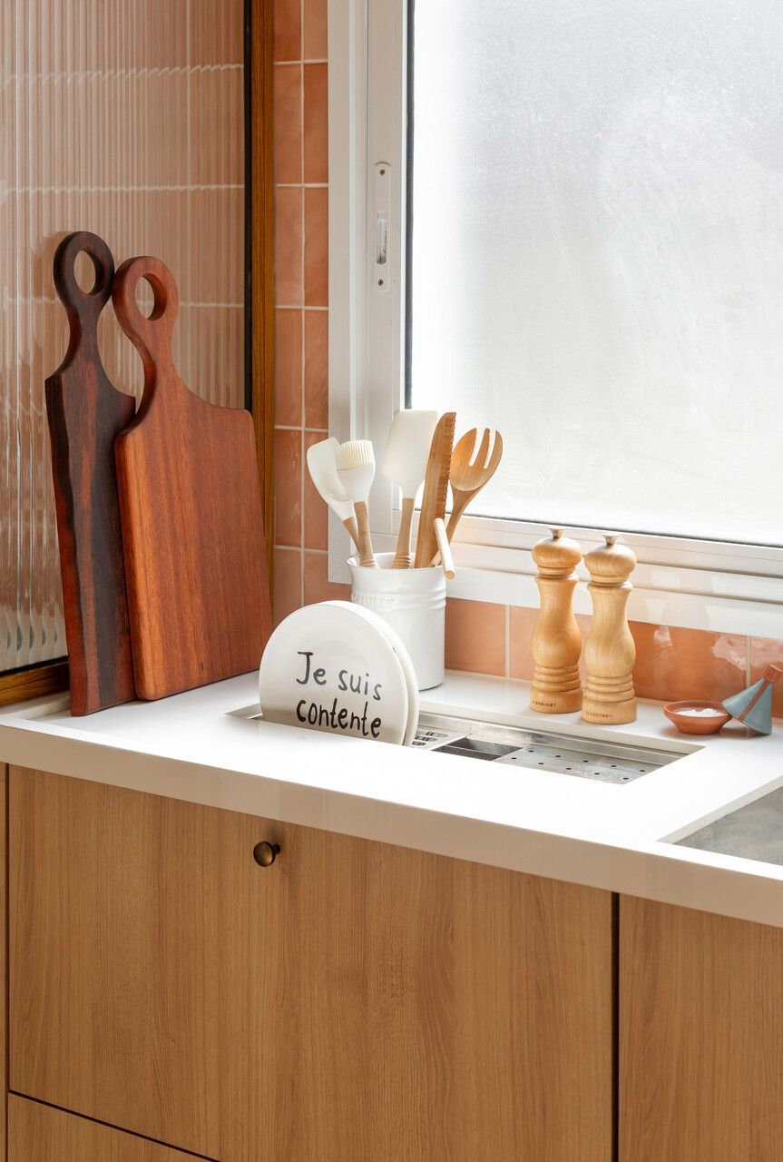 “Desde o início, o pedido principal dos clientes foi justamente essa integração entre os ambientes, com o cuidado de evitar que o acesso ao imóvel remetesse a um corredor sem graça. Além de integrar cozinha e sala, o casal nos pediu um apartamento ‘aquecido’, com presença marcante da madeira e de tons terrosos, especialmente o terracota, que aplicamos tanto no revestimento de tijolinhos da parede principal da sala quanto na área de serviço.”