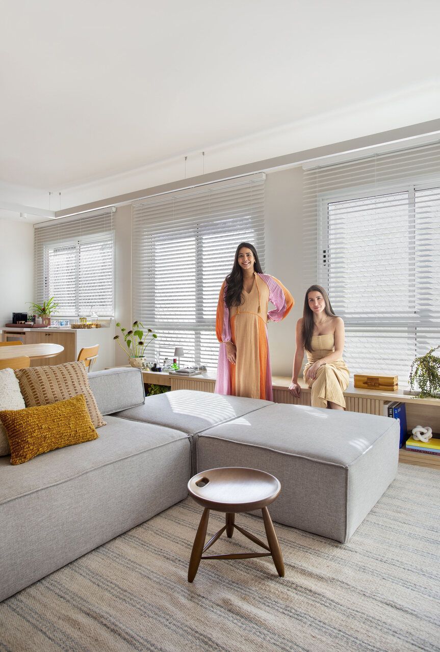 Em todo o piso, as réguas de porcelanato amadeirado assentadas em espinha de peixe adicionam movimento, enquanto as persianas horizontais em bambu filtram a luz e criam jogos de sombra que mudam ao longo do dia — uma escolha que se tornou protagonista. O tapete off-white com linhas azuladas, feito em material PET resistente, delimita a área de estar sem abrir mão da praticidade para quem convive com um cãozinho.