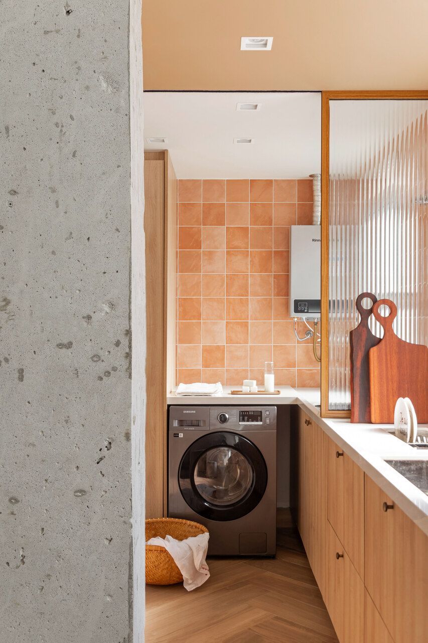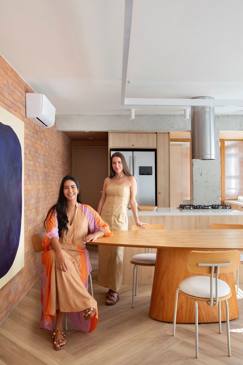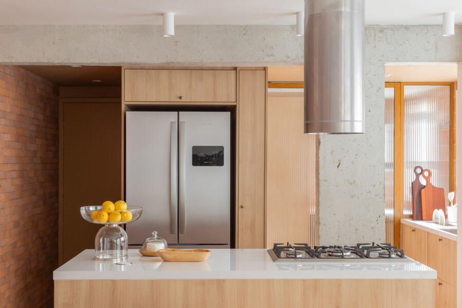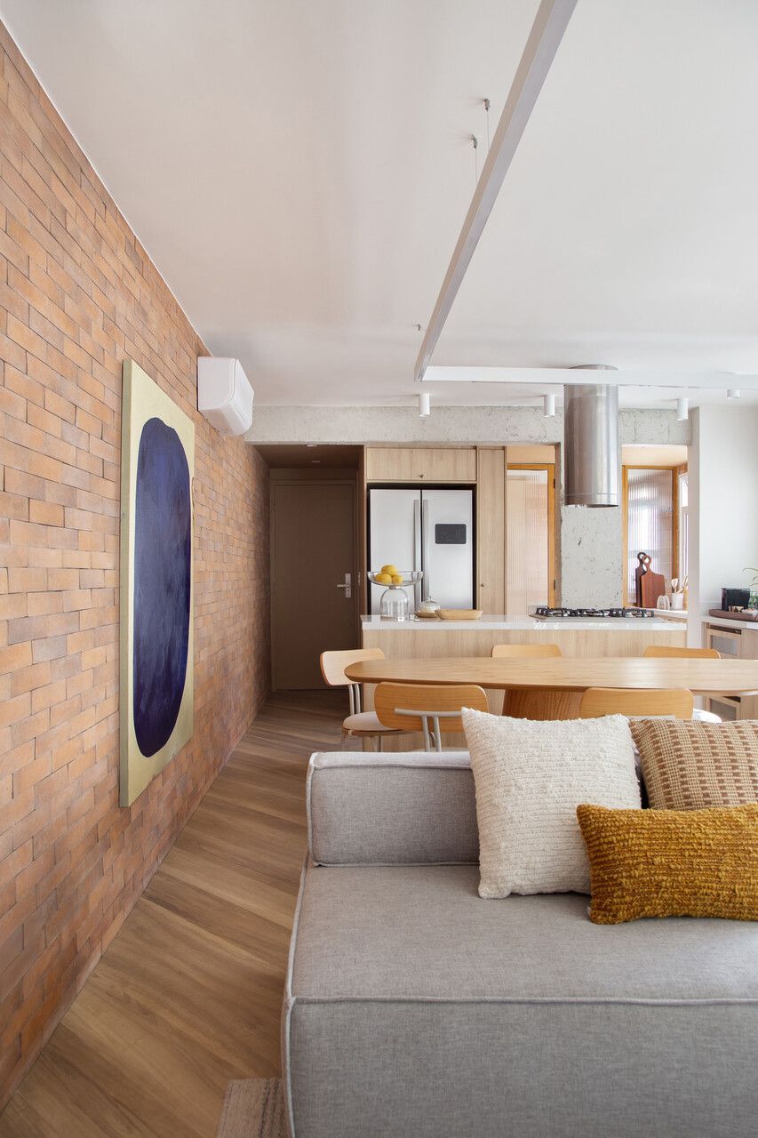 “Desde o início, o pedido principal dos clientes foi justamente essa integração entre os ambientes, com o cuidado de evitar que o acesso ao imóvel remetesse a um corredor sem graça. Além de integrar cozinha e sala, o casal nos pediu um apartamento ‘aquecido’, com presença marcante da madeira e de tons terrosos, especialmente o terracota, que aplicamos tanto no revestimento de tijolinhos da parede principal da sala quanto na área de serviço.”
