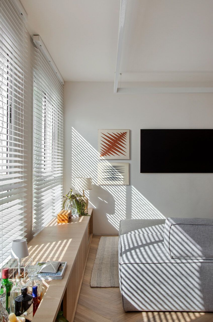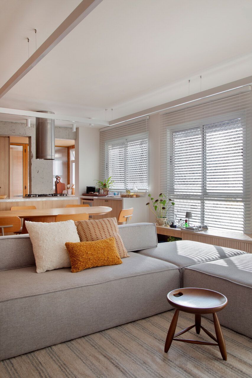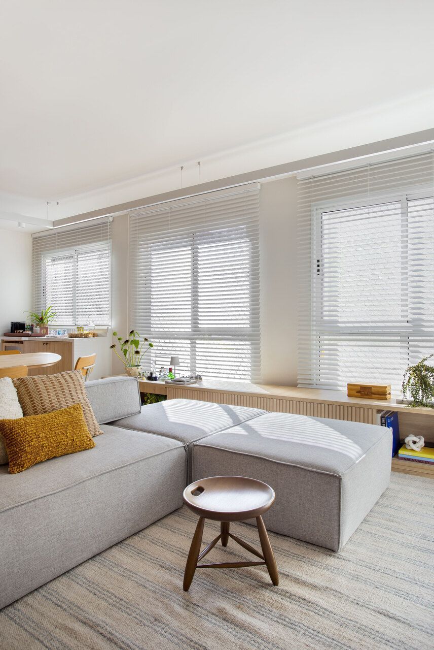 Em todo o piso, as réguas de porcelanato amadeirado assentadas em espinha de peixe adicionam movimento, enquanto as persianas horizontais em bambu filtram a luz e criam jogos de sombra que mudam ao longo do dia — uma escolha que se tornou protagonista. O tapete off-white com linhas azuladas, feito em material PET resistente, delimita a área de estar sem abrir mão da praticidade para quem convive com um cãozinho.