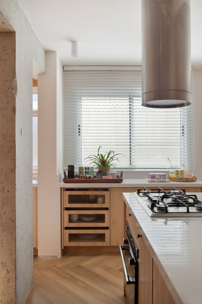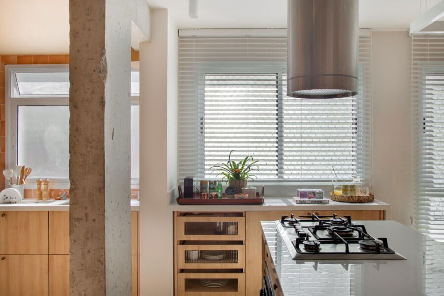 “Quando sugerimos o uso de persianas nas diversas janelas que conectam os ambientes integrados, os clientes inicialmente preferiam cortinas lisas. Foi preciso insistir e pedir que confiassem no efeito da luz natural filtrada pelas lâminas de bambu. E deu certo! Ao final do projeto, recebemos a seguinte mensagem: ‘Ficou muito mais bonito do que imaginávamos! Muito obrigado mesmo.”