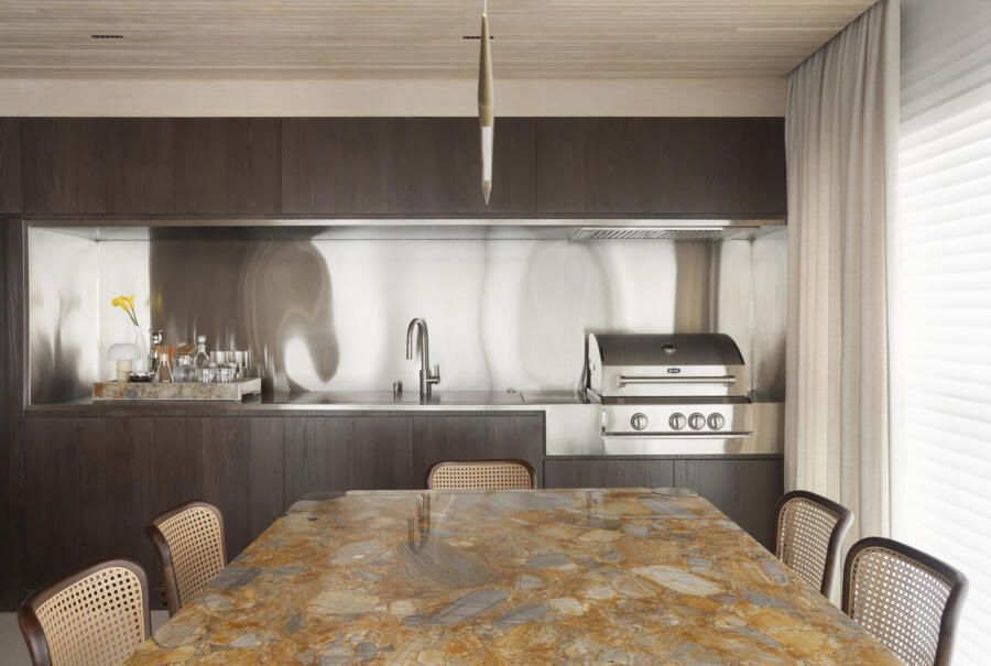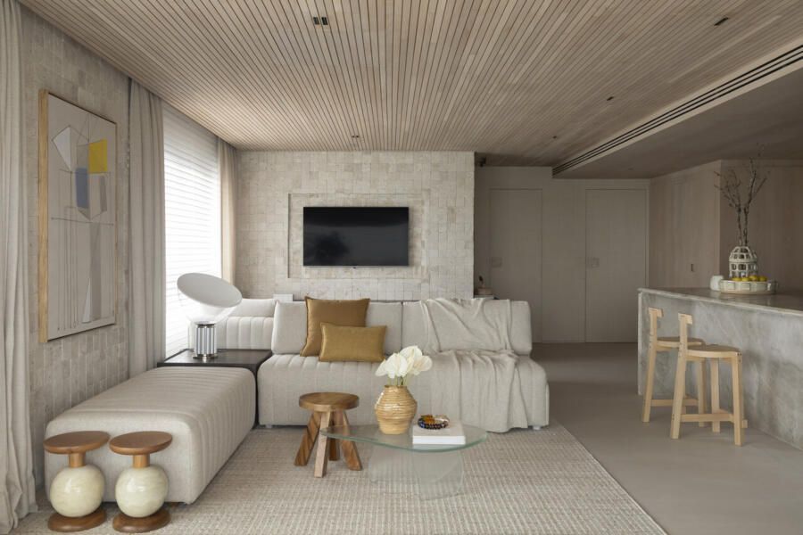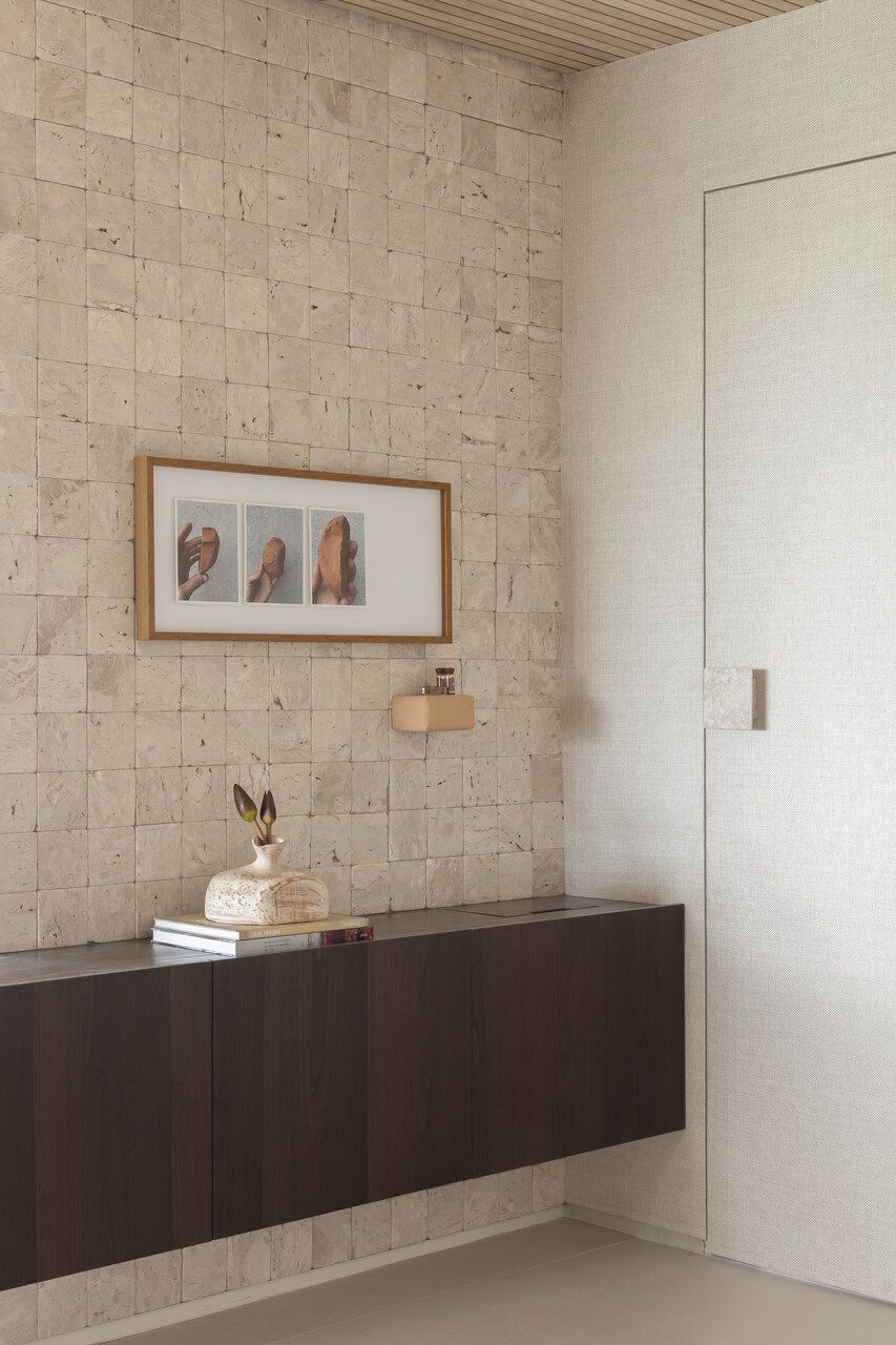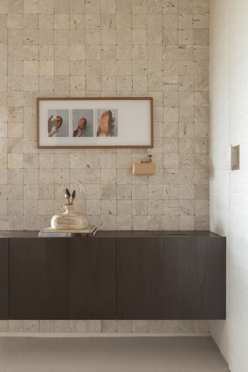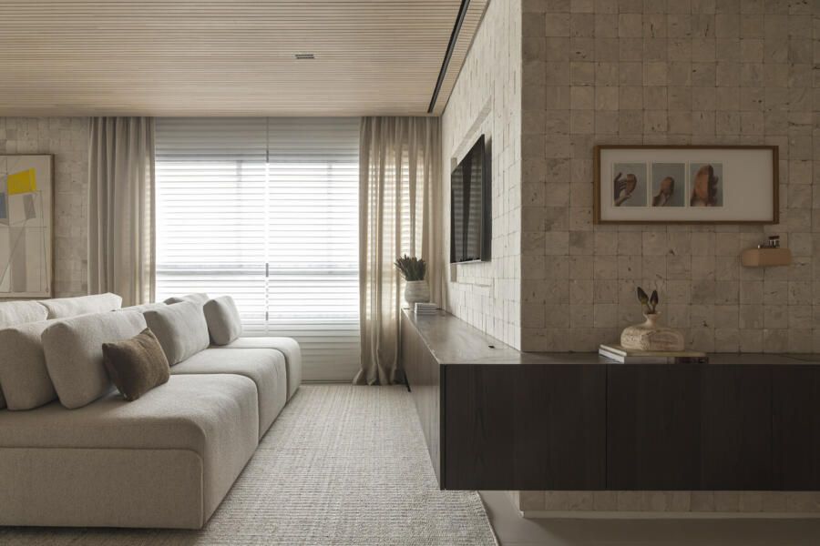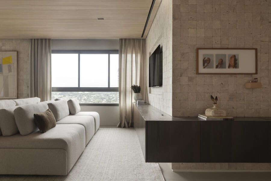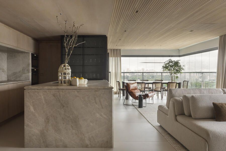 A escolha de materiais reforça essa lógica, com predominância de elementos naturais e nacionais, como madeira tauari, pedras como Bege Bahia e Taj Mahal, além de couro, linho e palha. A combinação cria uma base neutra e consistente, que contribui para uma atmosfera confortável e fácil de manter ao longo do tempo. Já a memória afetiva aparece como um elemento estruturante do projeto, ainda que de forma discreta. Referências ligadas à história familiar do morador foram incorporadas em detalhes e escolhas específicas, como a presença do couro e peças que remetem a momentos vividos.