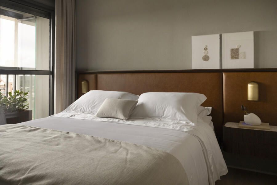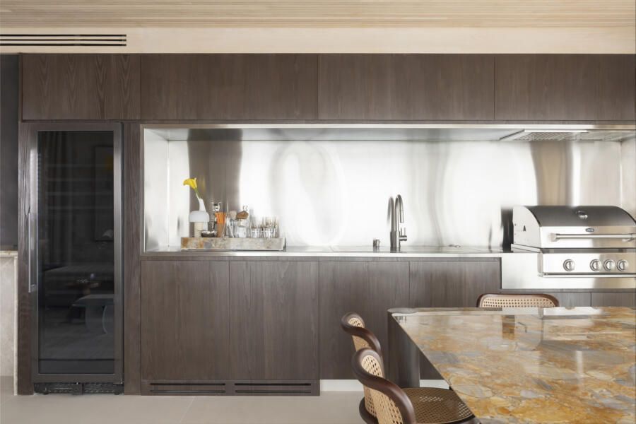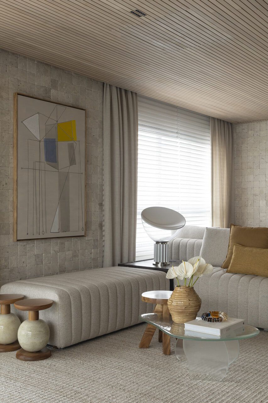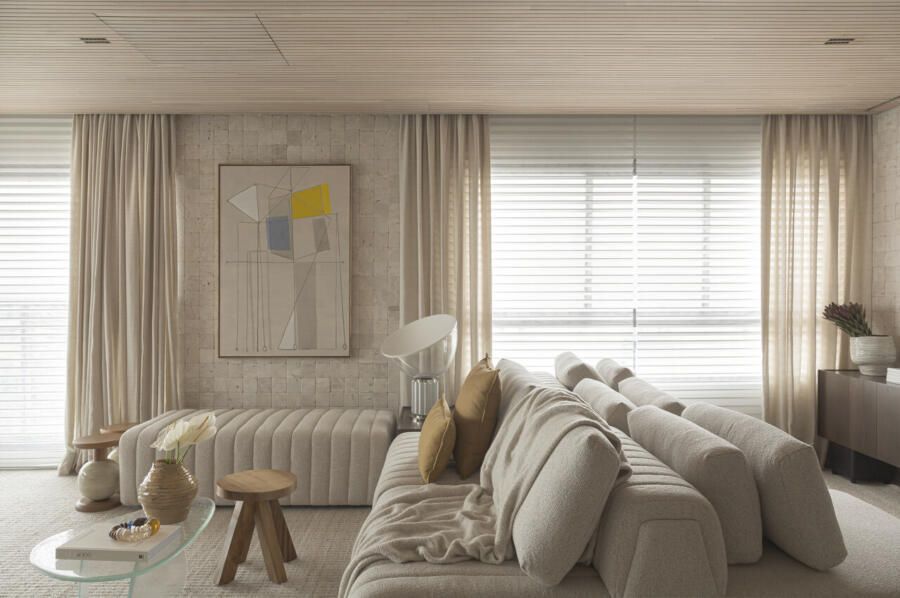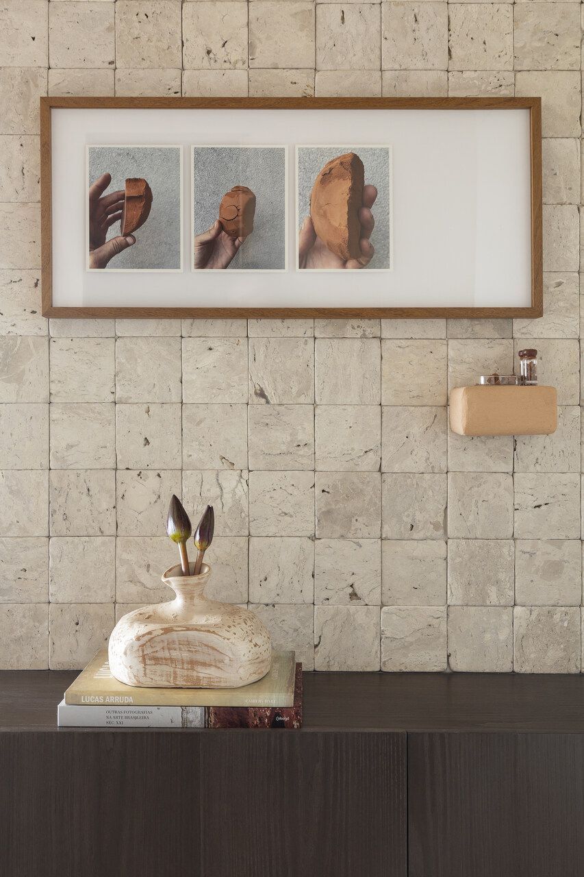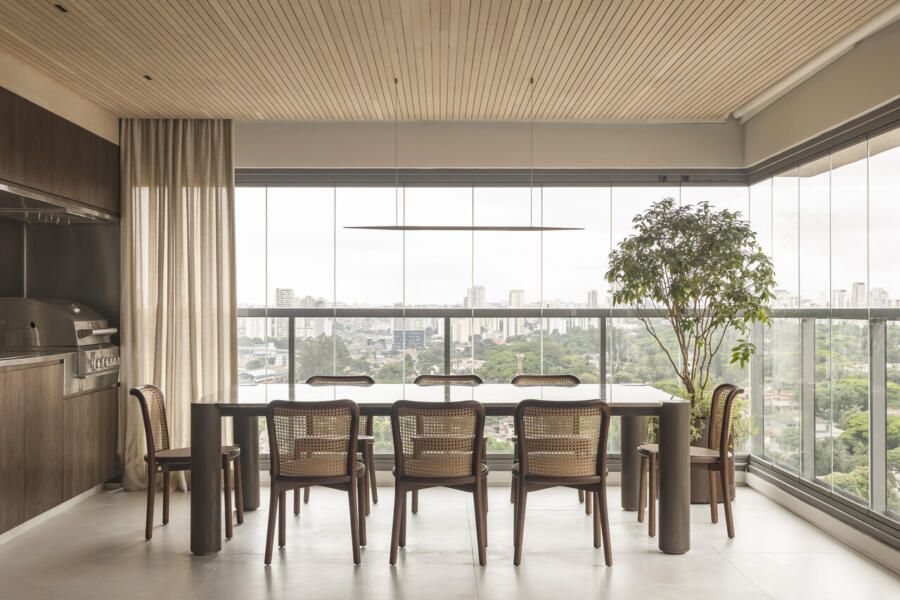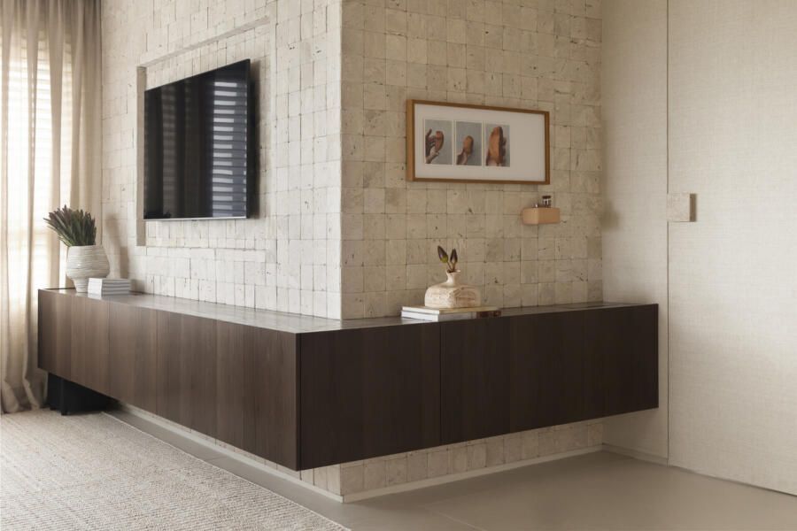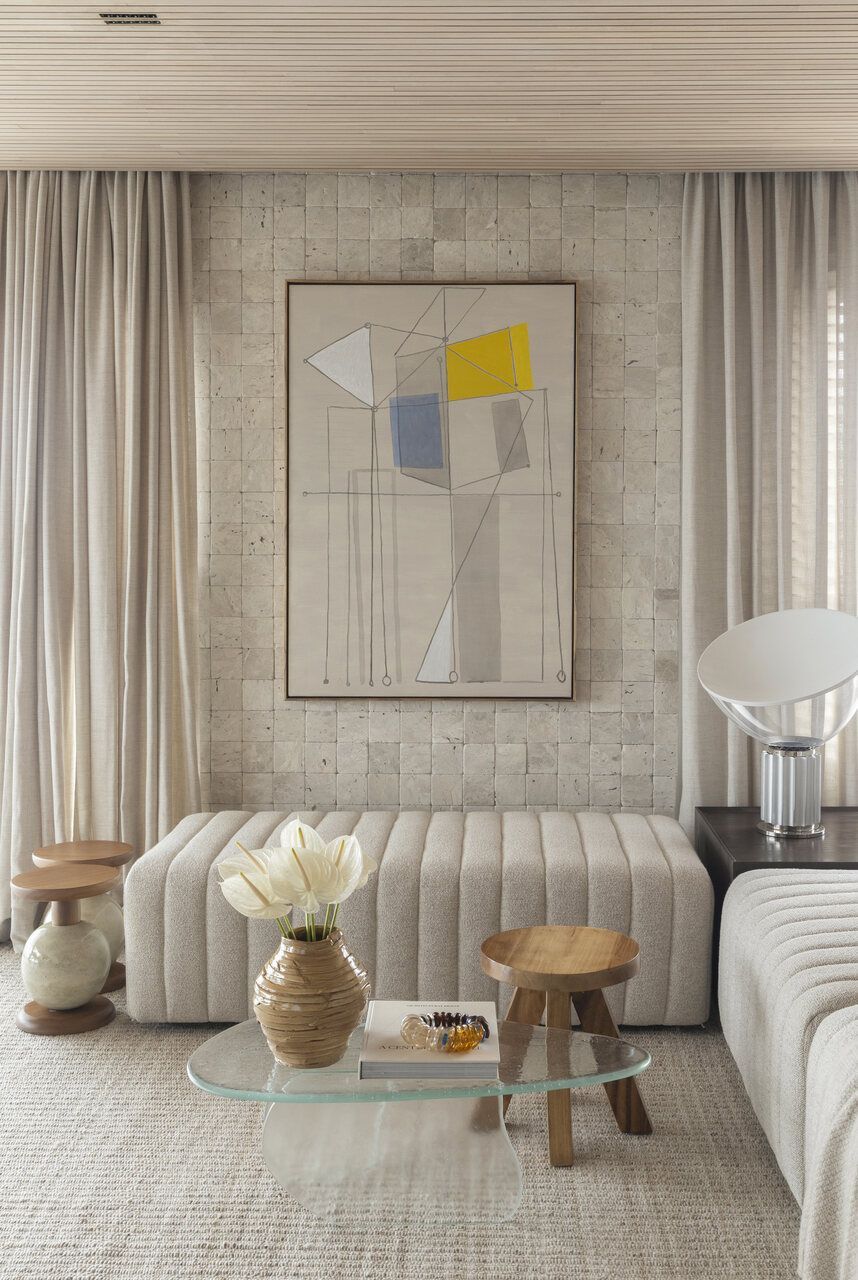 A escolha de materiais reforça essa lógica, com predominância de elementos naturais e nacionais, como madeira tauari, pedras como Bege Bahia e Taj Mahal, além de couro, linho e palha. A combinação cria uma base neutra e consistente, que contribui para uma atmosfera confortável e fácil de manter ao longo do tempo. Já a memória afetiva aparece como um elemento estruturante do projeto, ainda que de forma discreta. Referências ligadas à história familiar do morador foram incorporadas em detalhes e escolhas específicas, como a presença do couro e peças que remetem a momentos vividos.