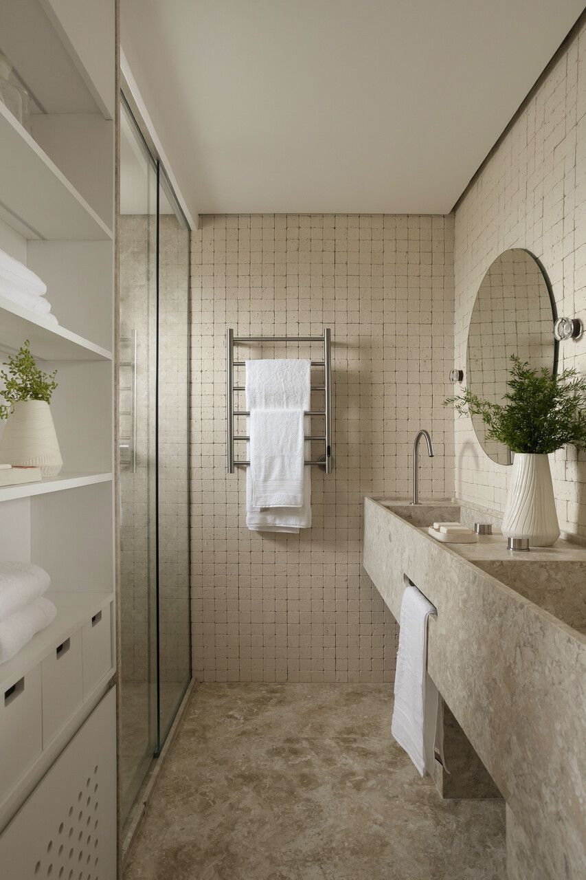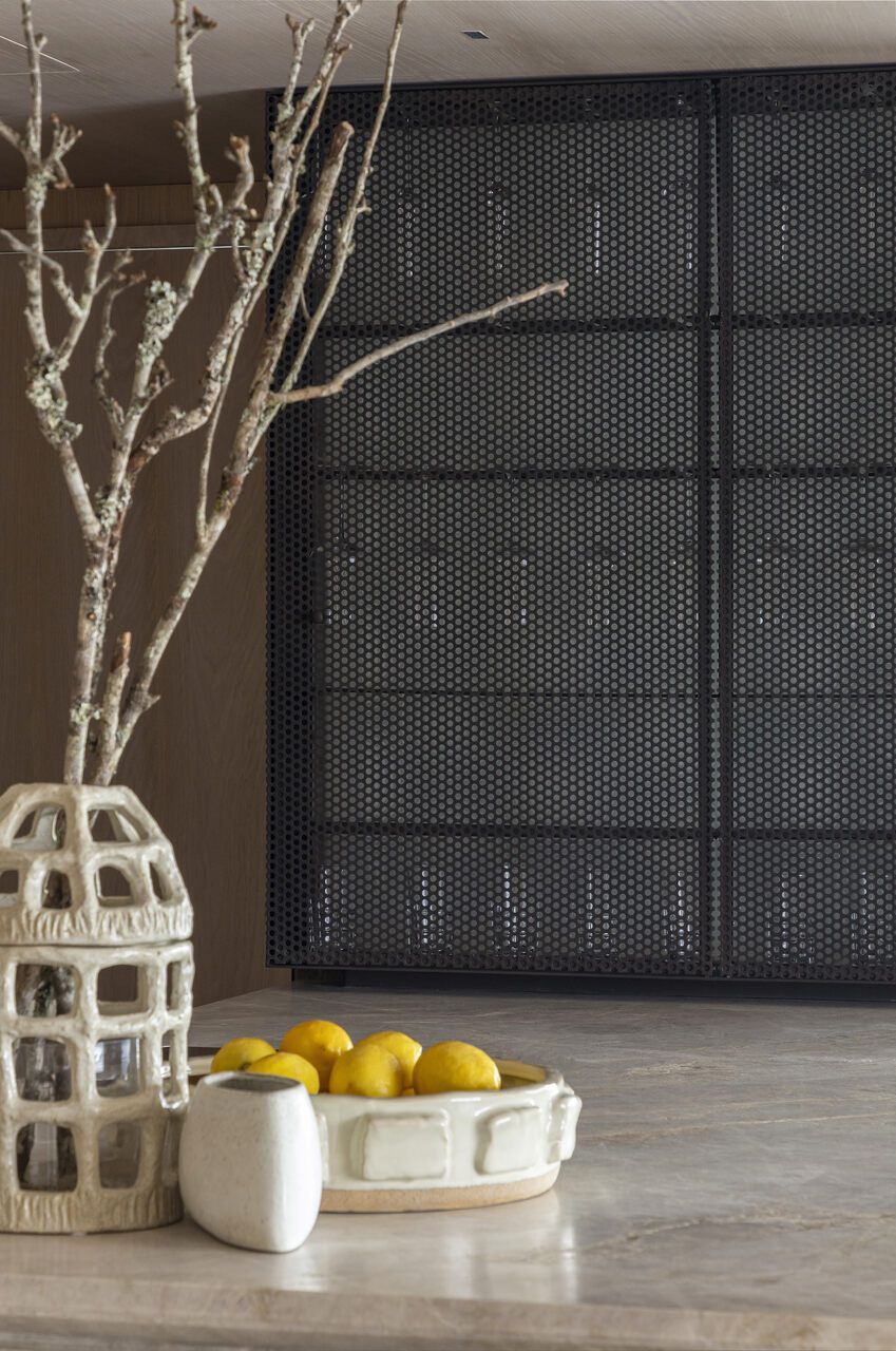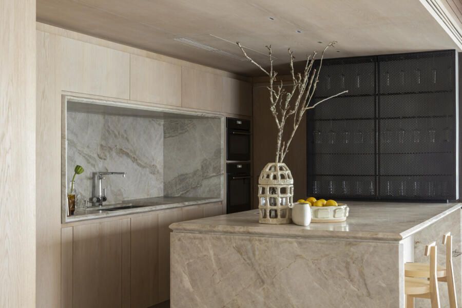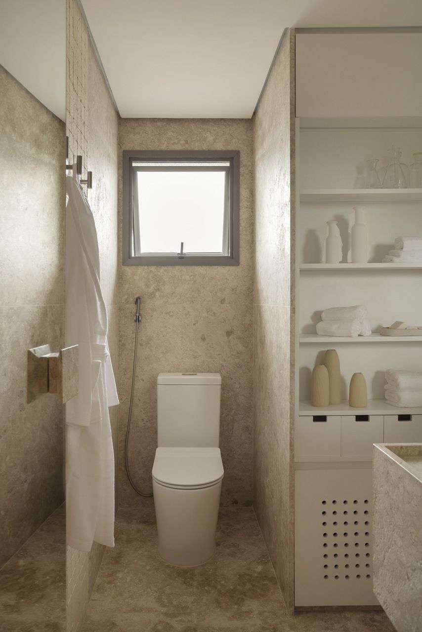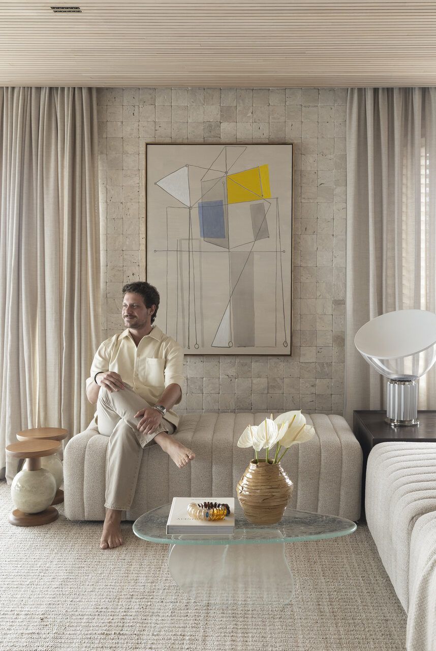 A escolha de materiais reforça essa lógica, com predominância de elementos naturais e nacionais, como madeira tauari, pedras como Bege Bahia e Taj Mahal, além de couro, linho e palha. A combinação cria uma base neutra e consistente, que contribui para uma atmosfera confortável e fácil de manter ao longo do tempo. Já a memória afetiva aparece como um elemento estruturante do projeto, ainda que de forma discreta. Referências ligadas à história familiar do morador foram incorporadas em detalhes e escolhas específicas, como a presença do couro e peças que remetem a momentos vividos.