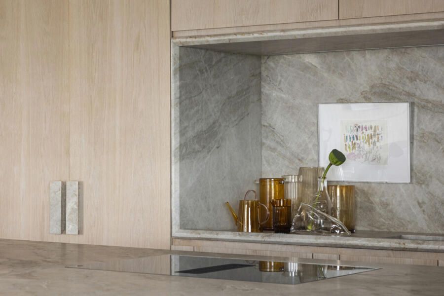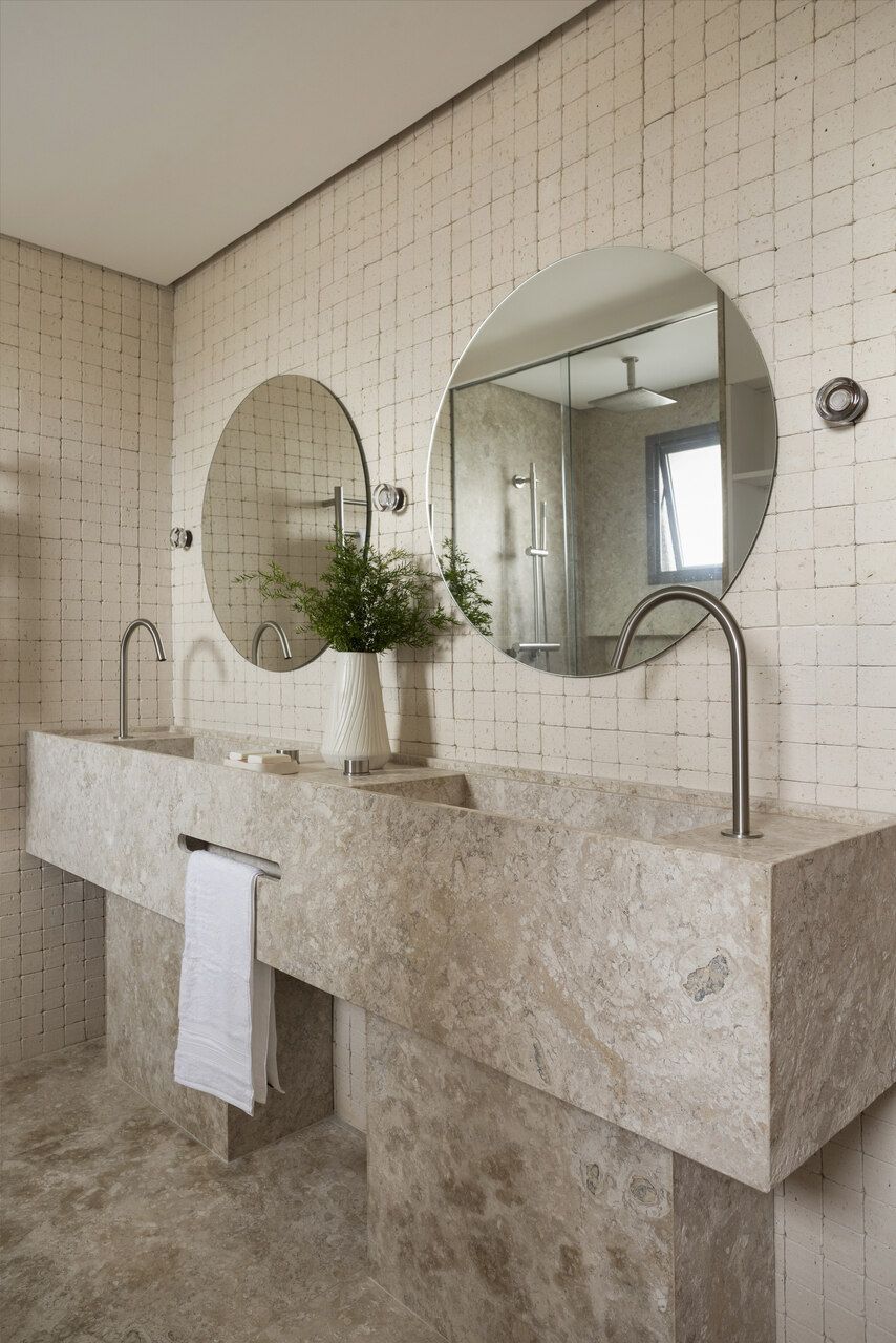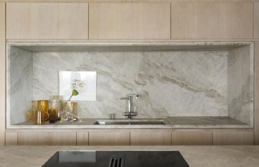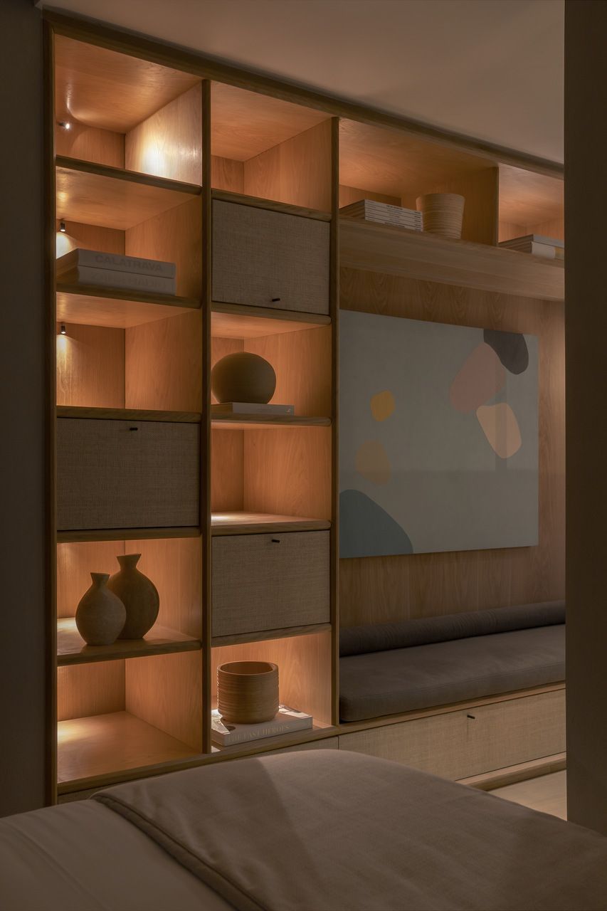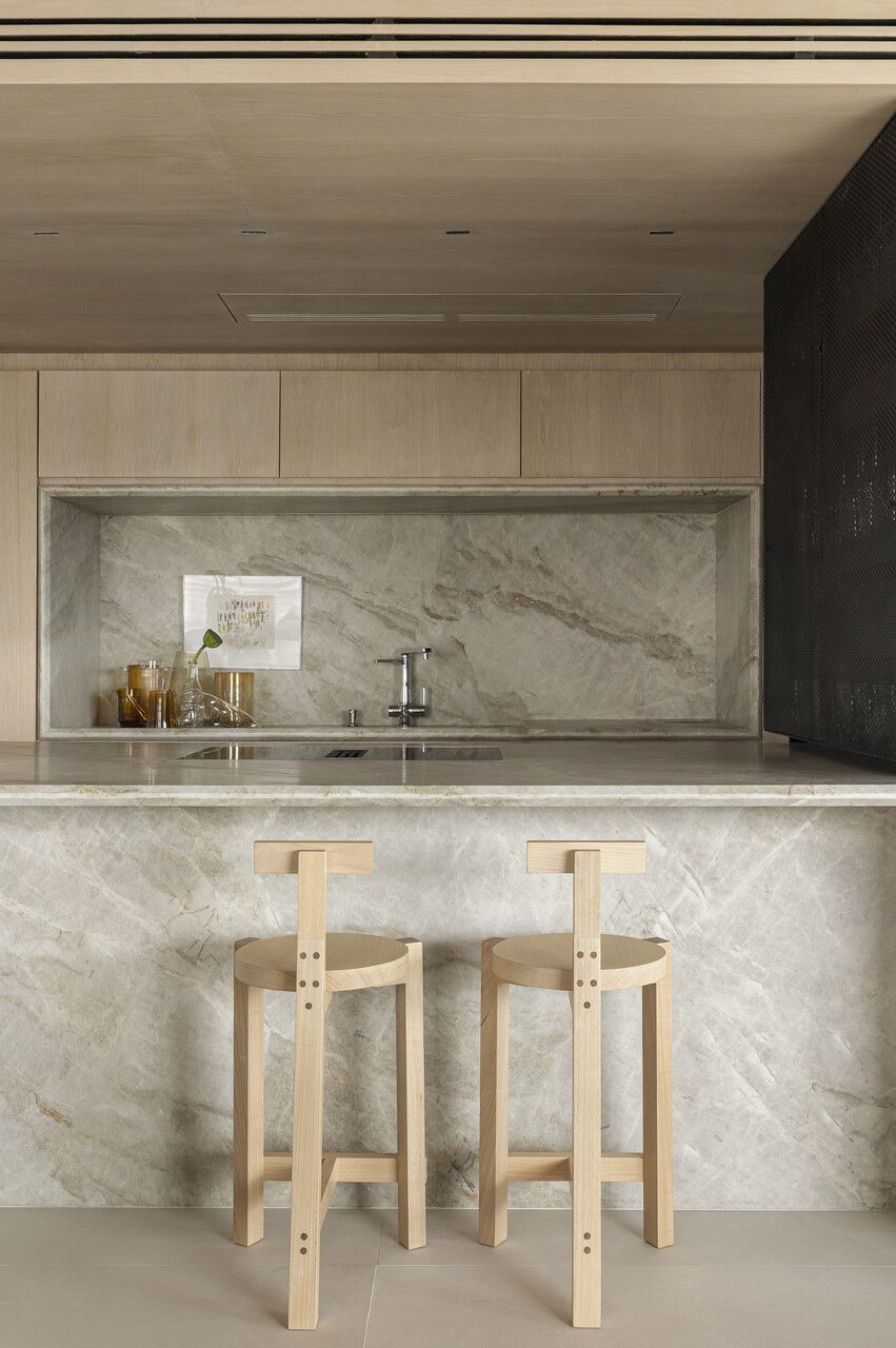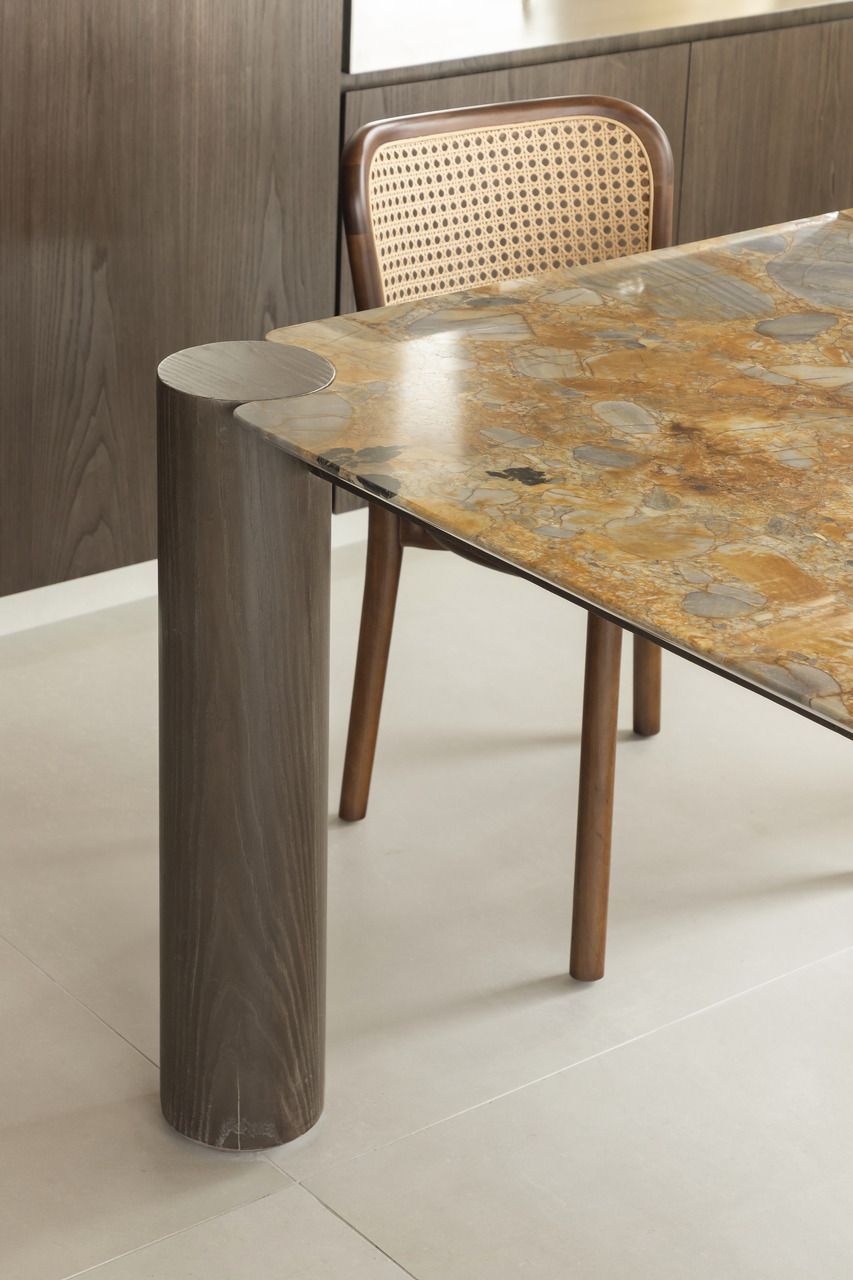 A escolha de materiais reforça essa lógica, com predominância de elementos naturais e nacionais, como madeira tauari, pedras como Bege Bahia e Taj Mahal, além de couro, linho e palha. A combinação cria uma base neutra e consistente, que contribui para uma atmosfera confortável e fácil de manter ao longo do tempo. Já a memória afetiva aparece como um elemento estruturante do projeto, ainda que de forma discreta. Referências ligadas à história familiar do morador foram incorporadas em detalhes e escolhas específicas, como a presença do couro e peças que remetem a momentos vividos.