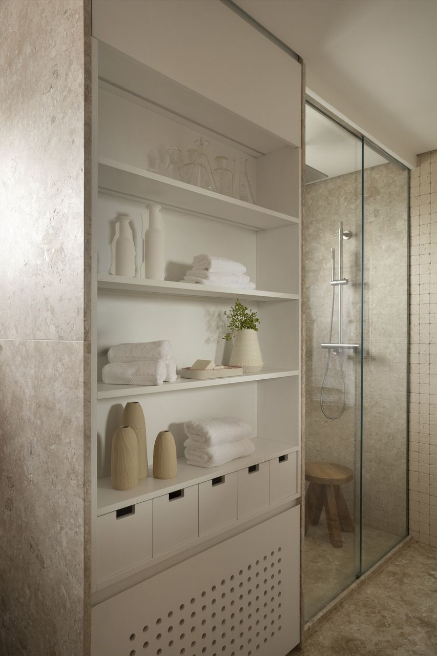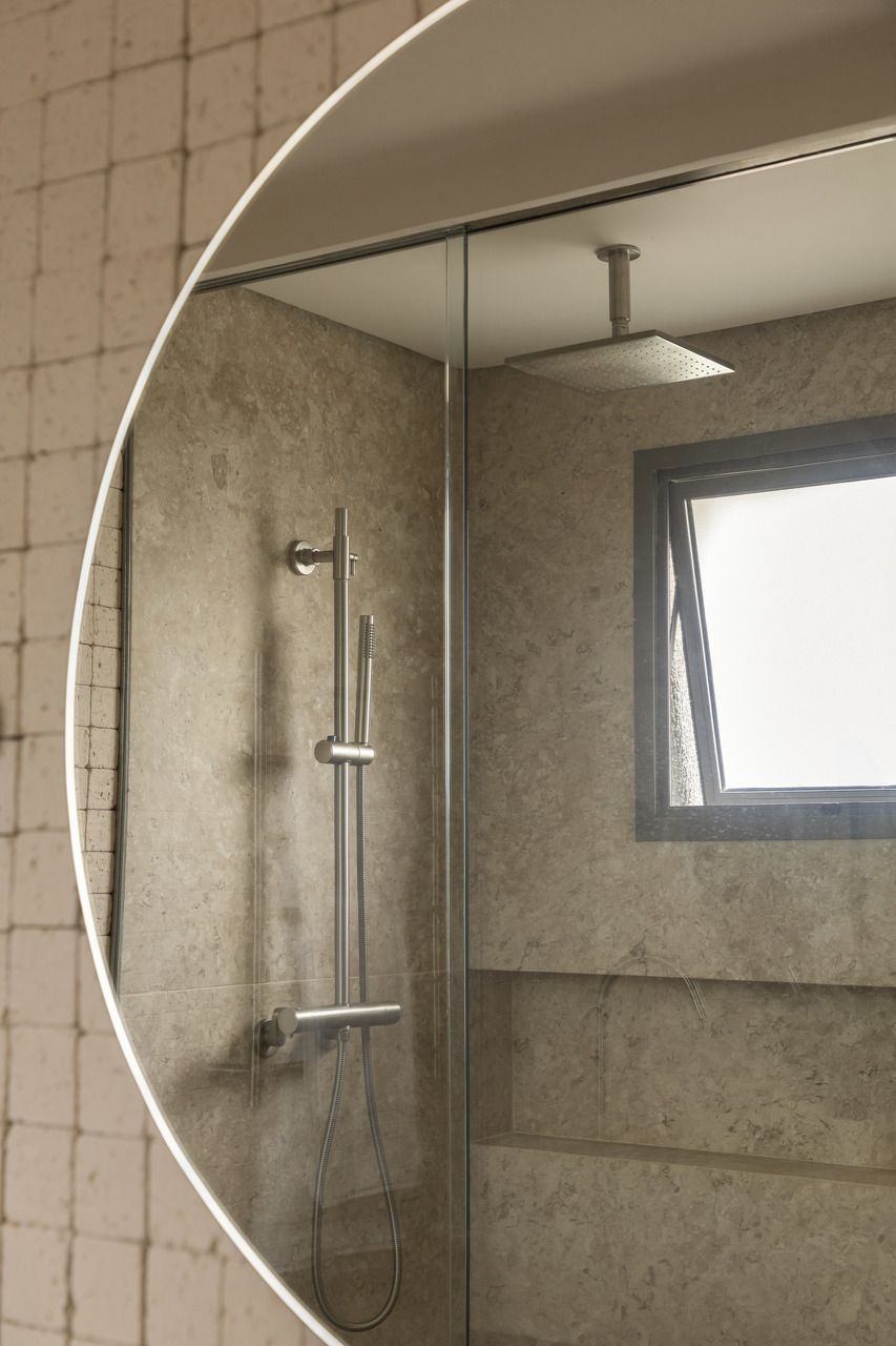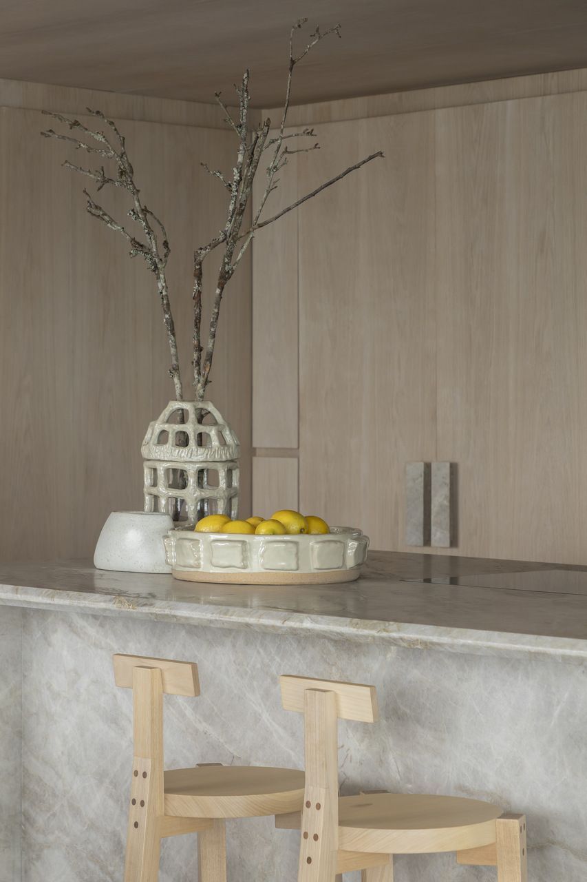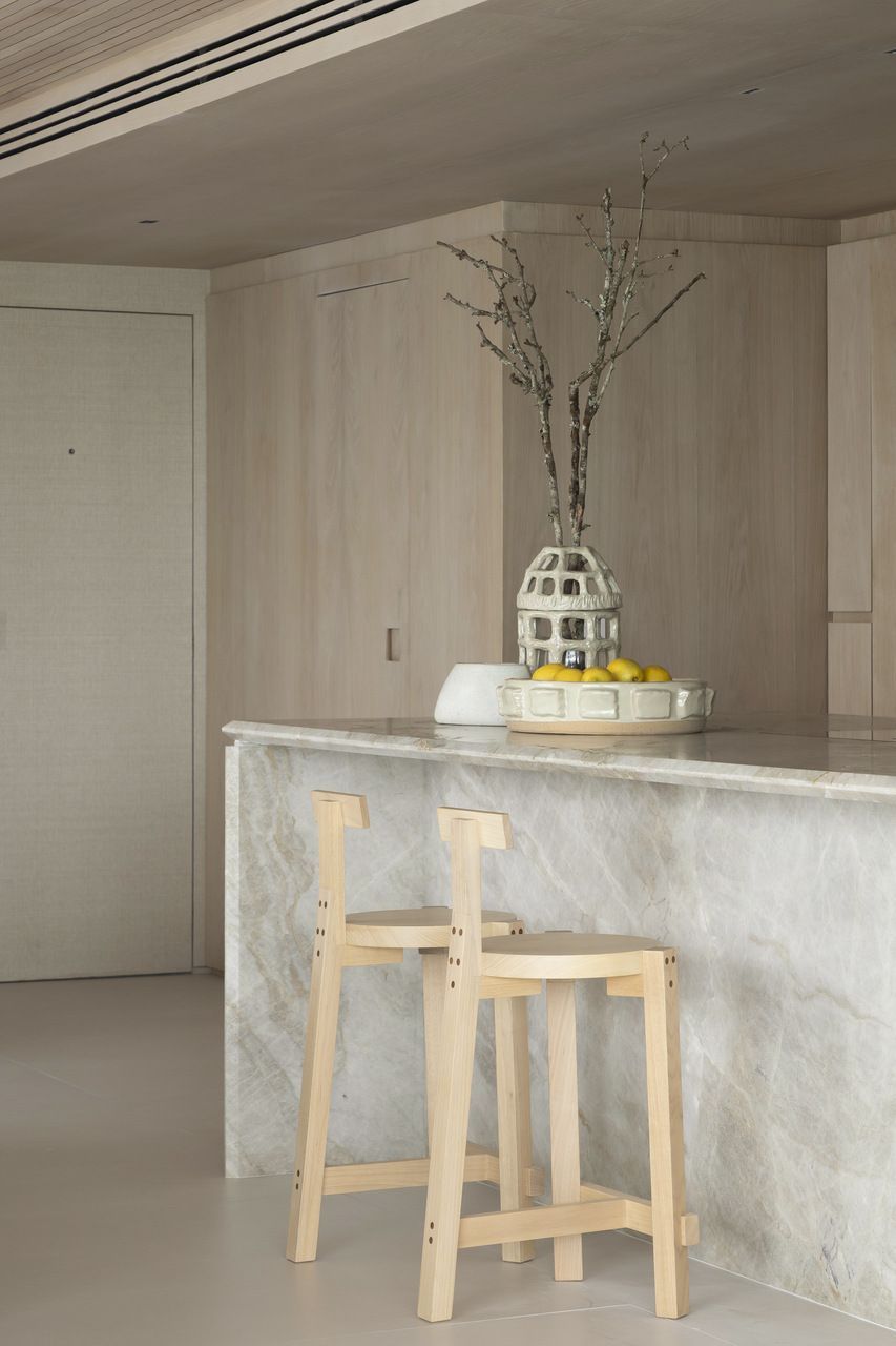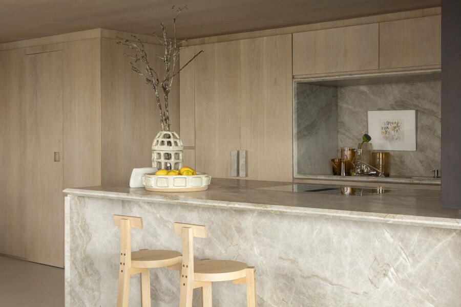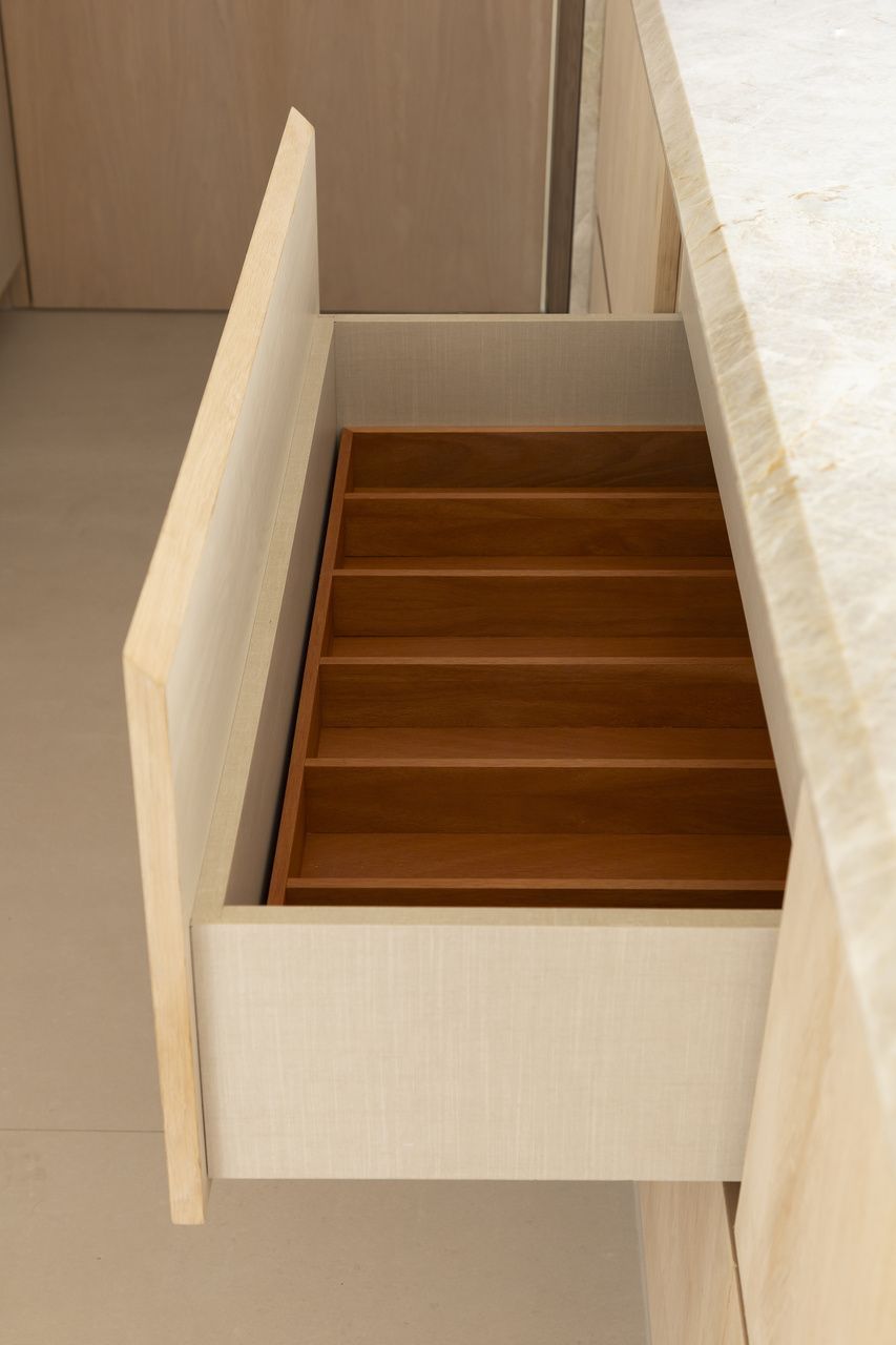 A escolha de materiais reforça essa lógica, com predominância de elementos naturais e nacionais, como madeira tauari, pedras como Bege Bahia e Taj Mahal, além de couro, linho e palha. A combinação cria uma base neutra e consistente, que contribui para uma atmosfera confortável e fácil de manter ao longo do tempo. Já a memória afetiva aparece como um elemento estruturante do projeto, ainda que de forma discreta. Referências ligadas à história familiar do morador foram incorporadas em detalhes e escolhas específicas, como a presença do couro e peças que remetem a momentos vividos.