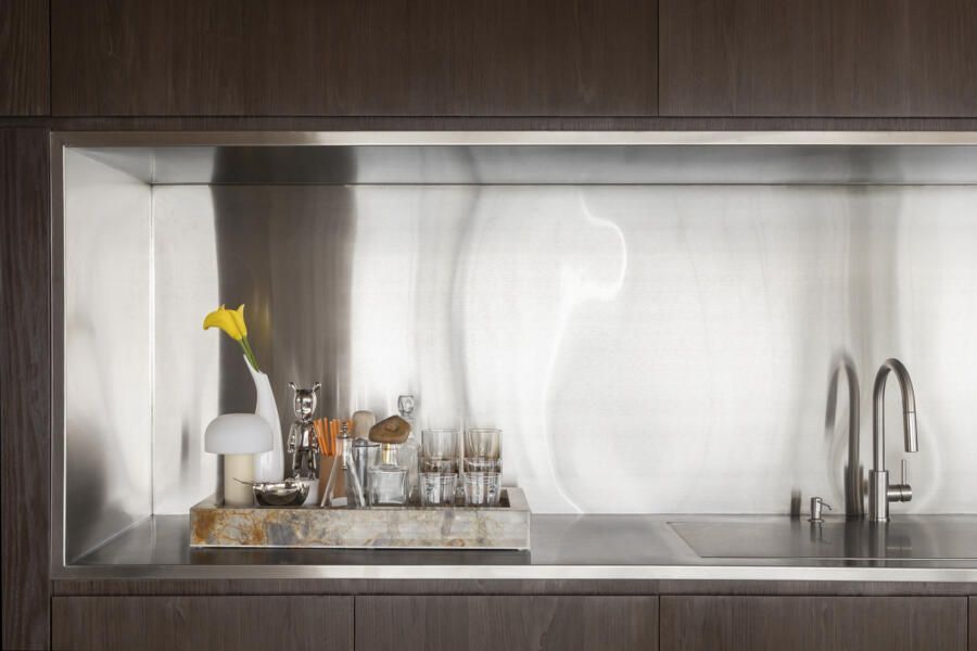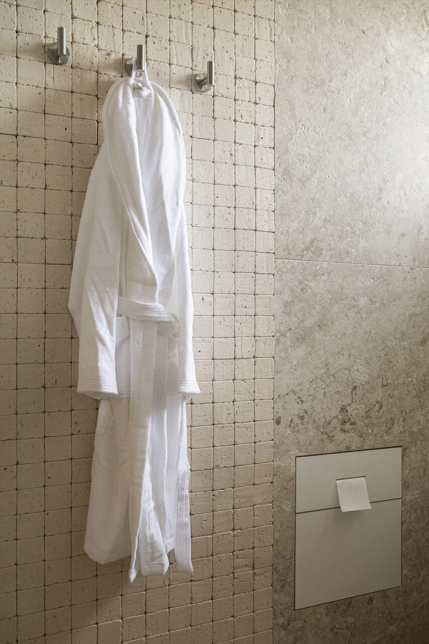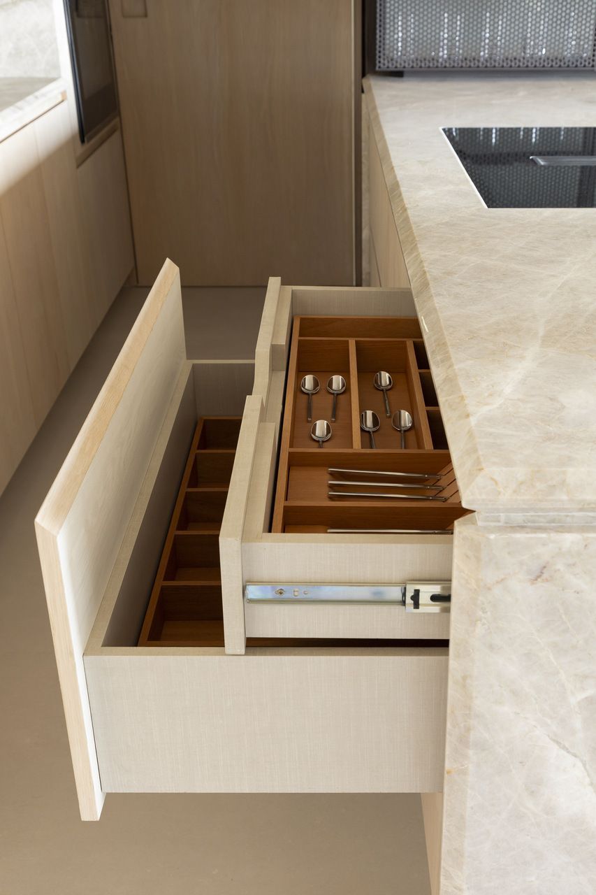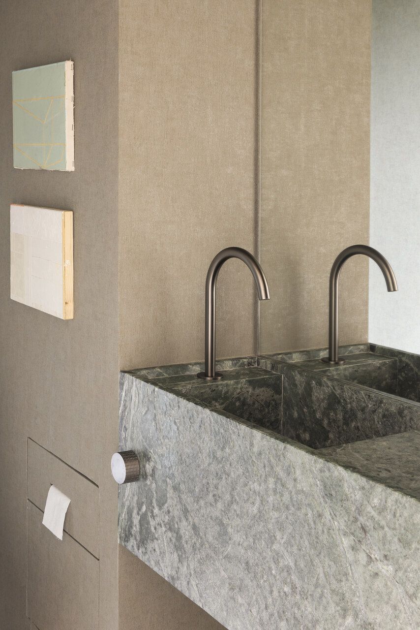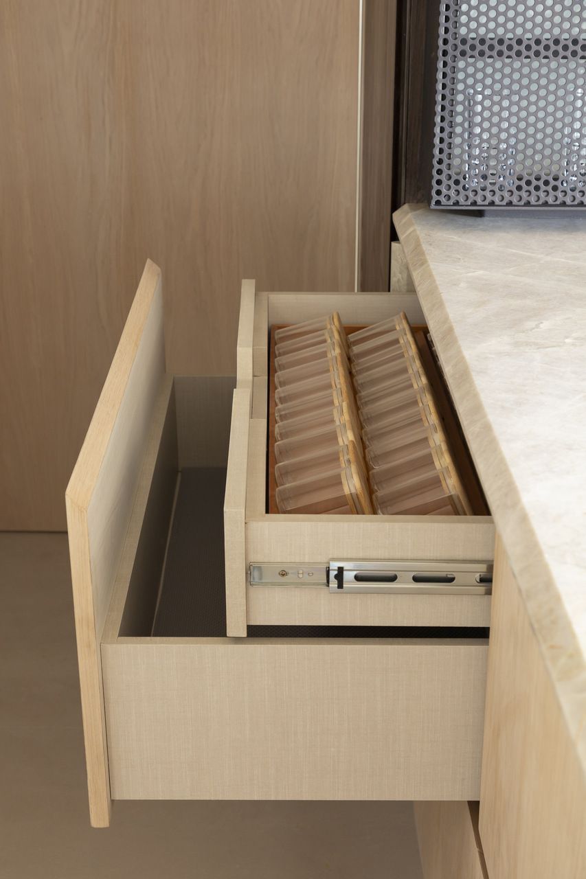 A escolha de materiais reforça essa lógica, com predominância de elementos naturais e nacionais, como madeira tauari, pedras como Bege Bahia e Taj Mahal, além de couro, linho e palha. A combinação cria uma base neutra e consistente, que contribui para uma atmosfera confortável e fácil de manter ao longo do tempo. Já a memória afetiva aparece como um elemento estruturante do projeto, ainda que de forma discreta. Referências ligadas à história familiar do morador foram incorporadas em detalhes e escolhas específicas, como a presença do couro e peças que remetem a momentos vividos.