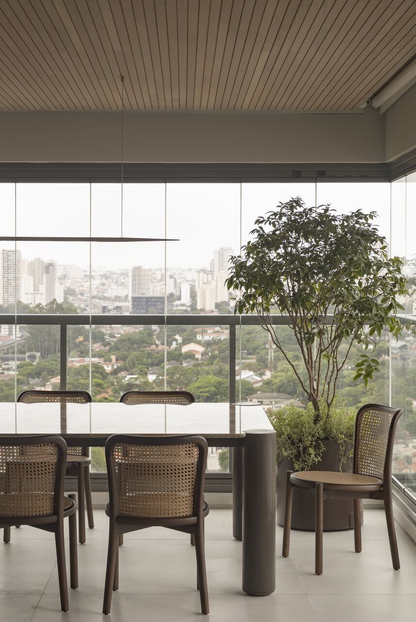 A planta original passou por uma reorganização completa para atender essas expectativas. A varanda foi incorporada à área social, ampliando o espaço e fortalecendo a relação com a vista arborizada, um dos principais atrativos do imóvel. Essa integração também contribuiu para melhorar a circulação e tornar o uso dos ambientes mais contínuo no dia a dia.