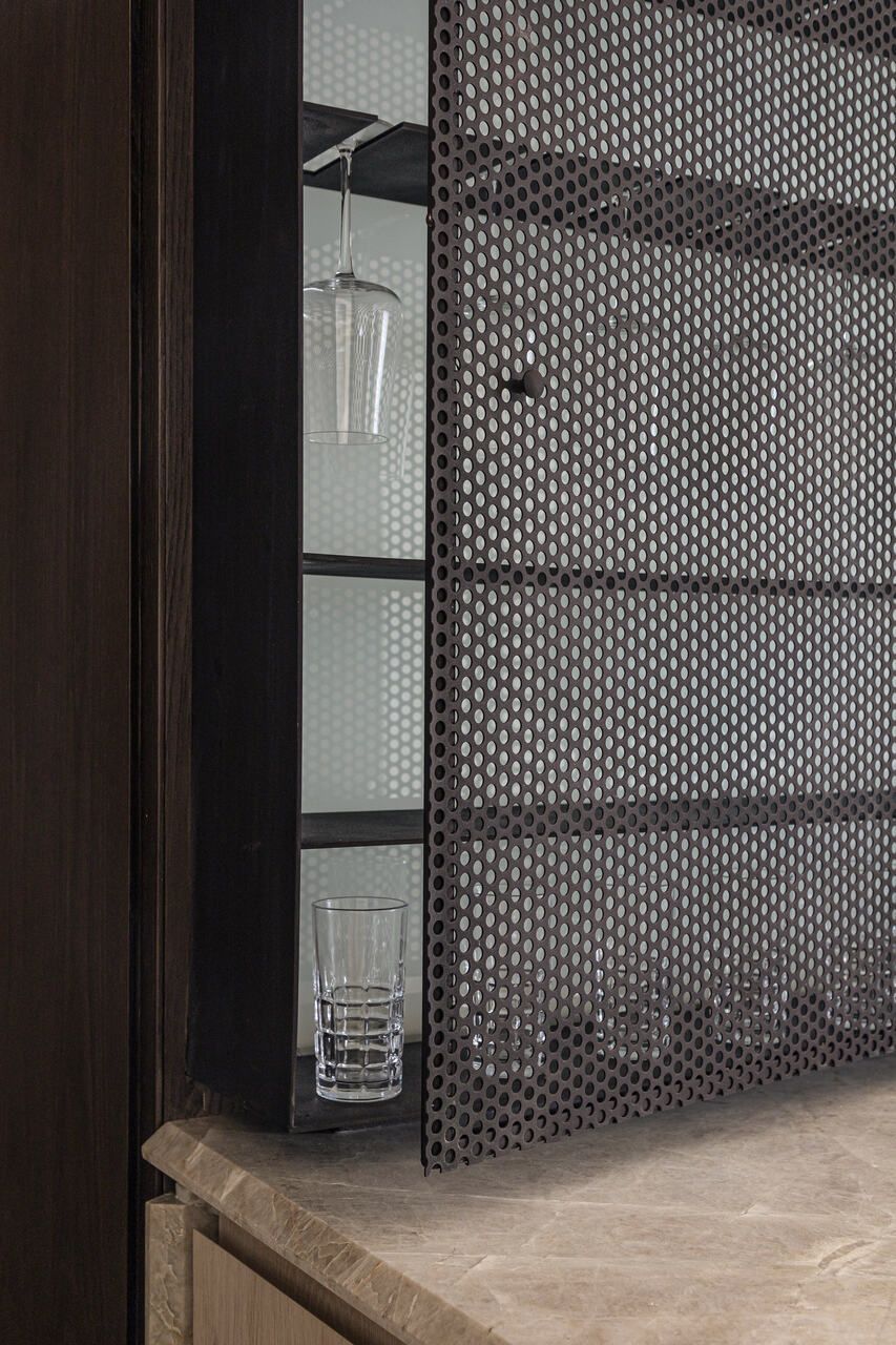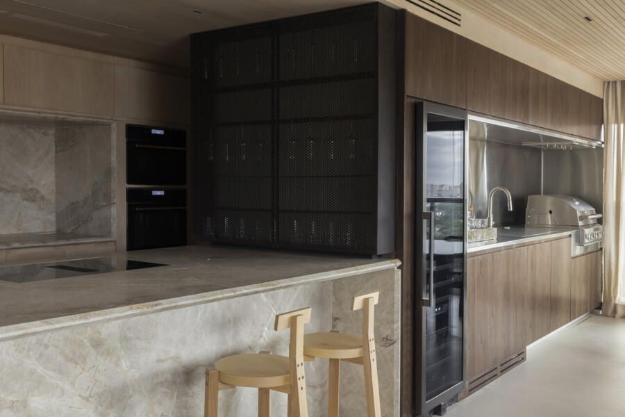 Na área íntima, a antiga segunda suíte foi integrada à suíte principal, permitindo a criação de um closet mais amplo e de um banheiro com conceito de sala de banho. O espaço foi pensado para oferecer conforto e funcionalidade, com possibilidade de adaptação ao longo do tempo, acompanhando mudanças na rotina do morador. A área social foi desenhada para equilibrar o uso cotidiano com momentos de convivência. O espaço gourmet ganhou destaque e foi planejado como ponto central do apartamento, conectado ao estar e ao jantar. A proposta favorece encontros informais e amplia as possibilidades de uso, sem compartimentações rígidas.