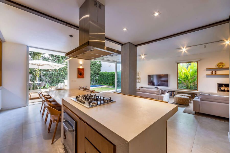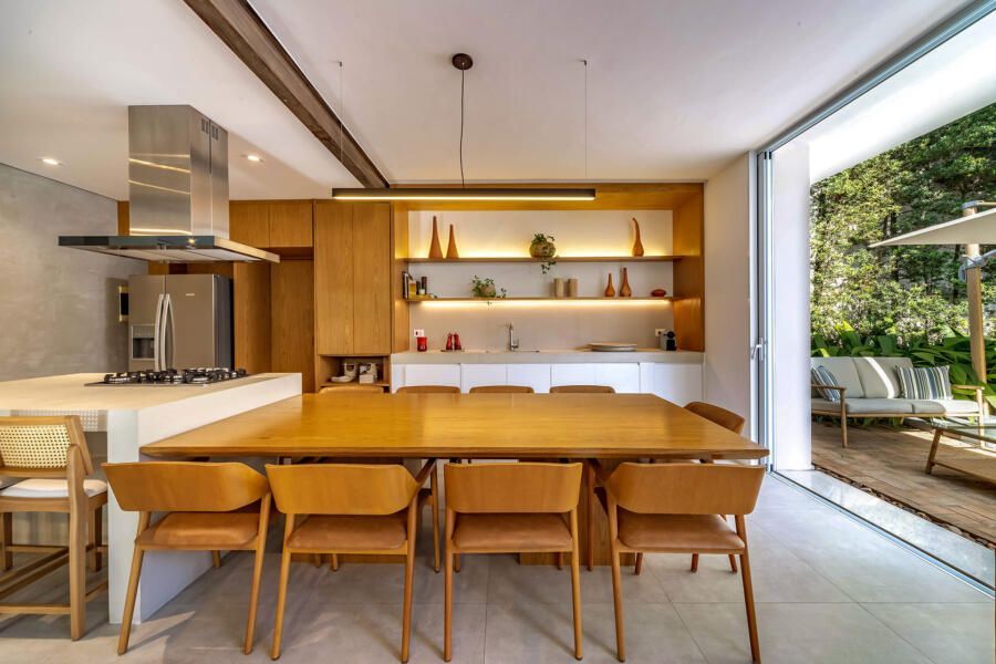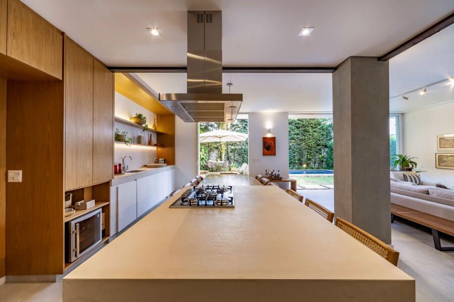 “Ao invés de construir uma área gourmet na área externa, o projeto de arquitetura da Cyan privilegiou o espaço interno da casa. Eliminando duas paredes, a sala de estar, da lareira e de jantar ficaram totalmente integradas e com vista permanente para o jardim, totalmente repaginado com assinatura da paisagista Camila Cavallari.”