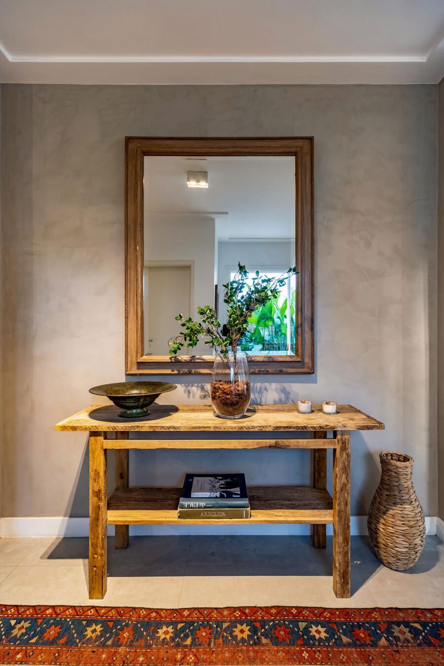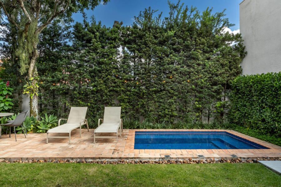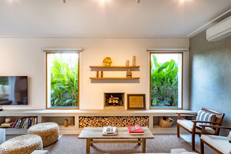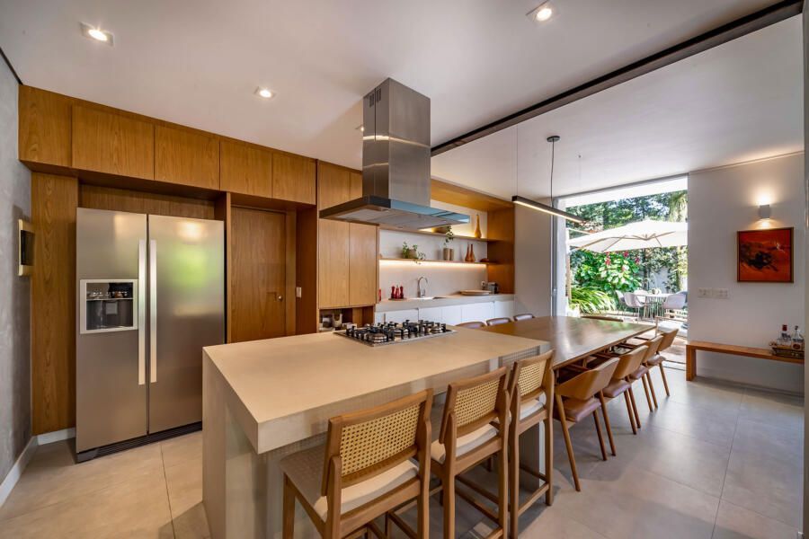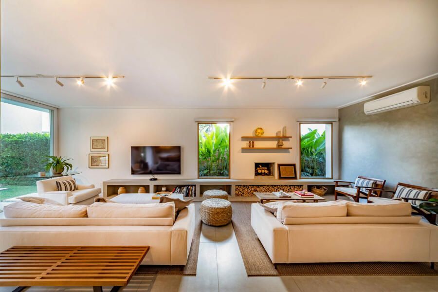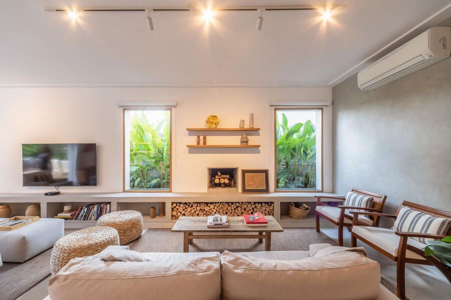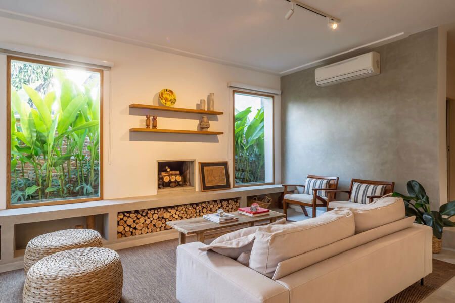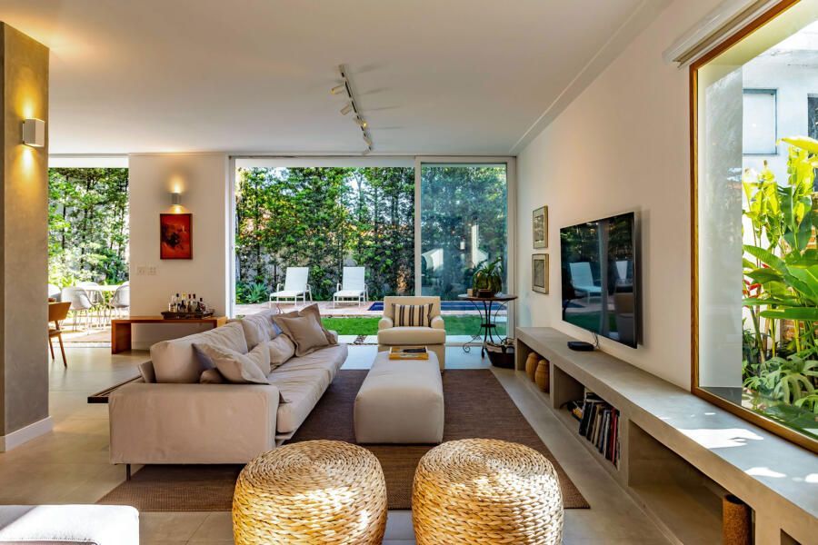 “A decoração contemporânea assinada pelo Uzo Design usou tons neutros para ressaltar o verde da área externa. Os vidros emoldurados de madeira funcionam como quadros para dar visibilidade ao jardim tropical que complementa a ambientação do espaço. Como a moradora gosta de receber, a bancada de cimento estendida é coringa e serve como banco e apoio de mesa ao mesmo tempo, complementando o mobiliário com sofás da BRO, pufes de fibra da TokStok, tapetes da Oficina de Tapetes e mesa de centro de demolição do Antigão.”
