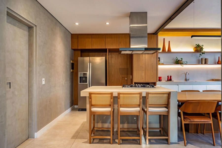 “O nicho da lareira foi preenchido com lenha de reflorestamento para aquecer o ambiente. O piso de madeira já antigo e danificado pelo tempo foi substituído. Para clarear o ambiente e trazer modernidade optou-se pelo porcelanato de cimento queimado da Colormix e a bancada de porcelanato em tom pastel da Portobello.”