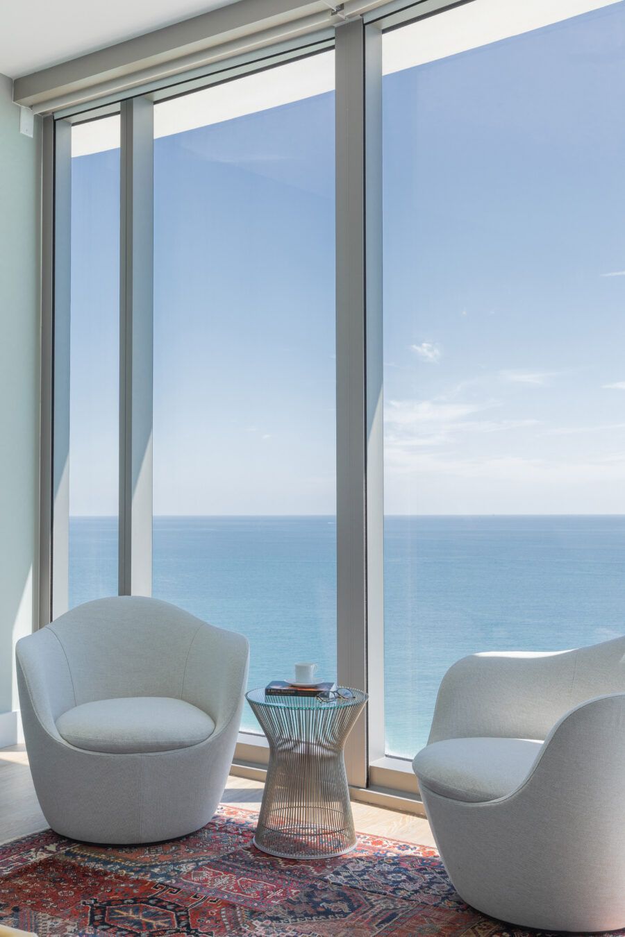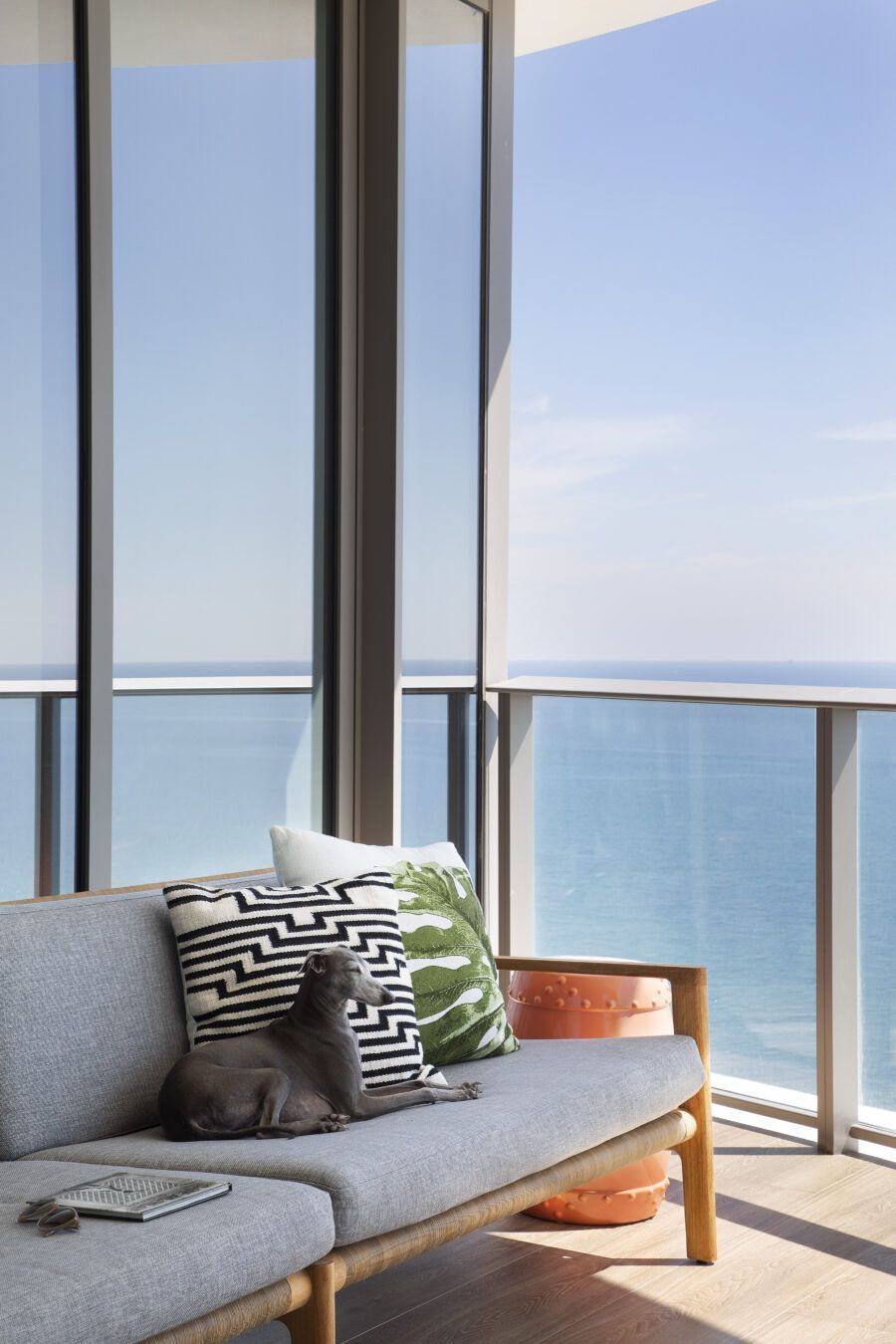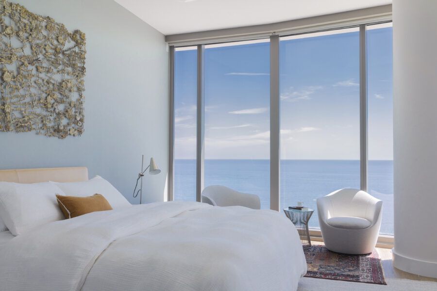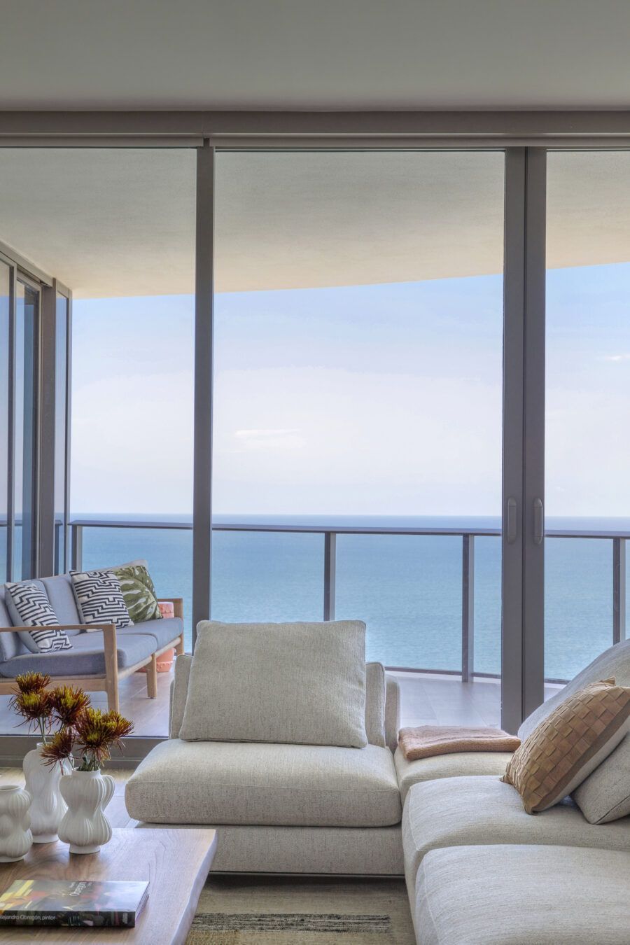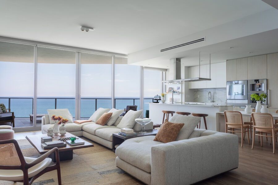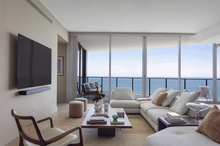 “Eles me procuraram já com este imóvel de 260m² comprado, no alto do Edifício Ritz Carlton, com uma vista panorâmica da praia Sunny Isles. Em nossa primeira reunião, eles pediram um lar confortável e despojado, mantendo a cozinha integrada à sala para receberem os amigos, além de um escritório, local para os treinos de bicicleta do marido, que é triatleta, e para o simulador de corridas do filho.”