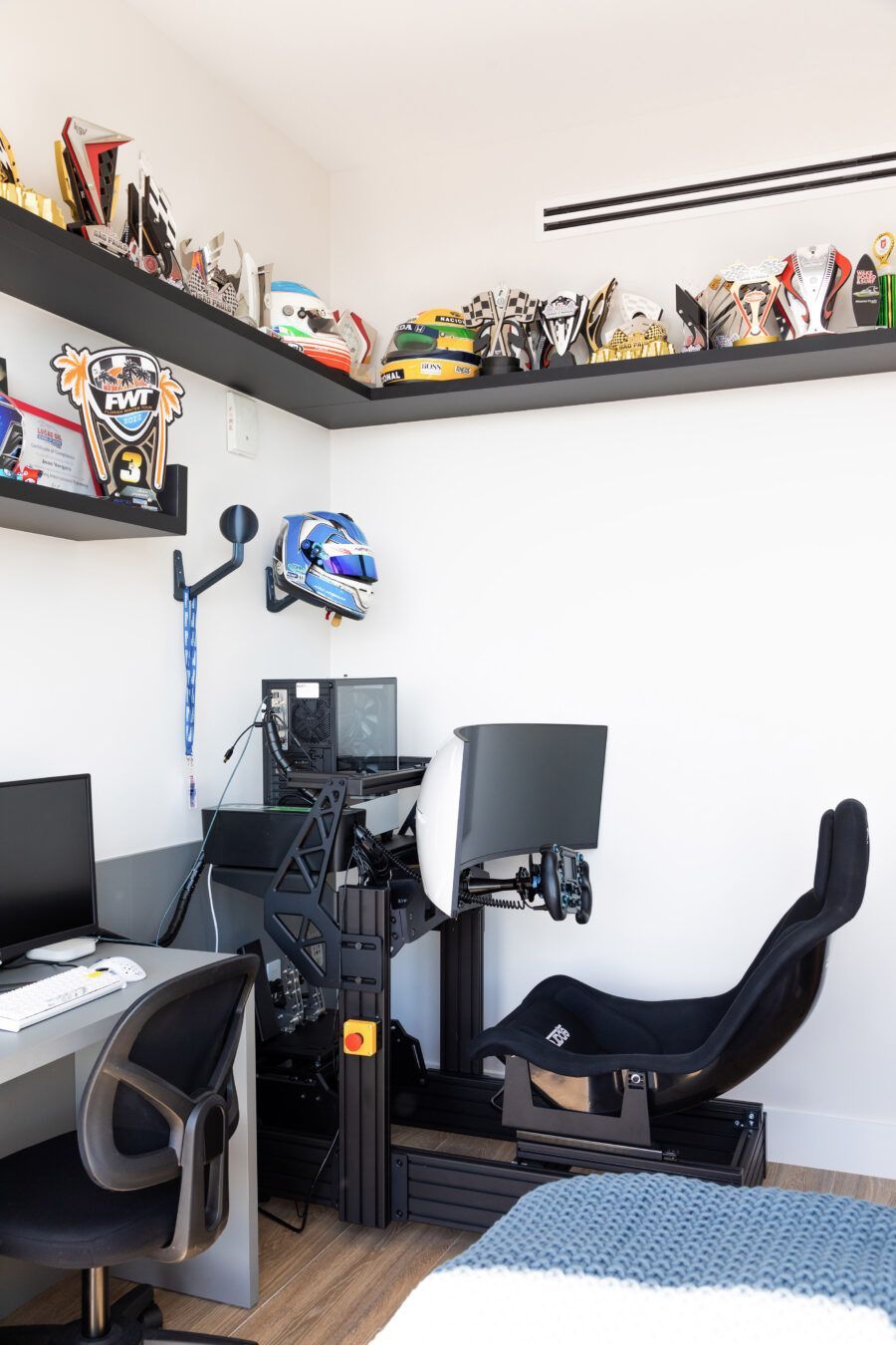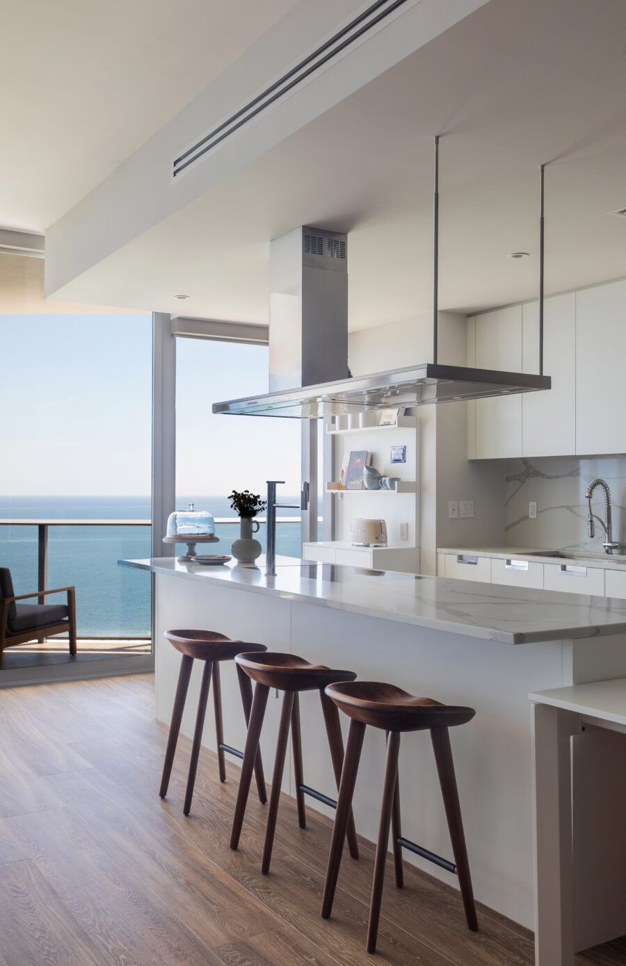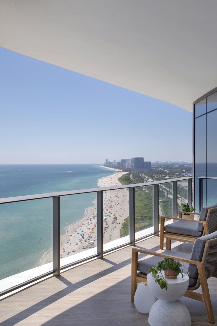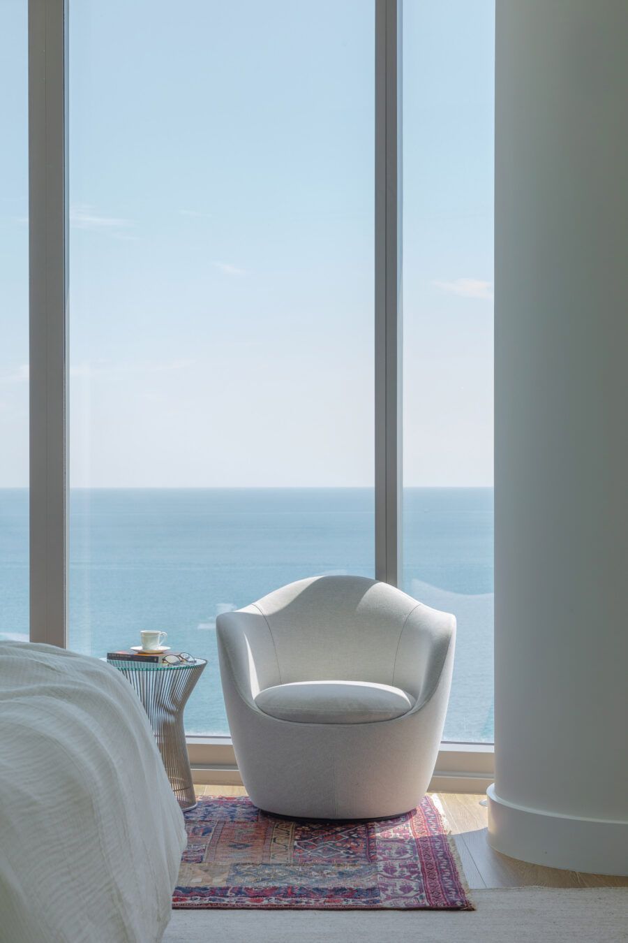 “Eles me procuraram já com este imóvel de 260m² comprado, no alto do Edifício Ritz Carlton, com uma vista panorâmica da praia Sunny Isles. Em nossa primeira reunião, eles pediram um lar confortável e despojado, mantendo a cozinha integrada à sala para receberem os amigos, além de um escritório, local para os treinos de bicicleta do marido, que é triatleta, e para o simulador de corridas do filho.”