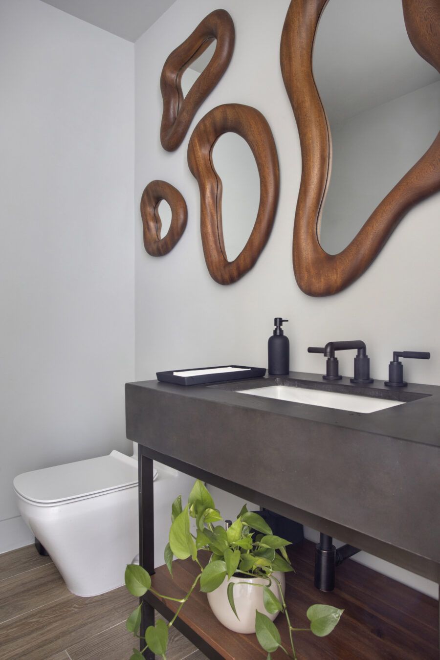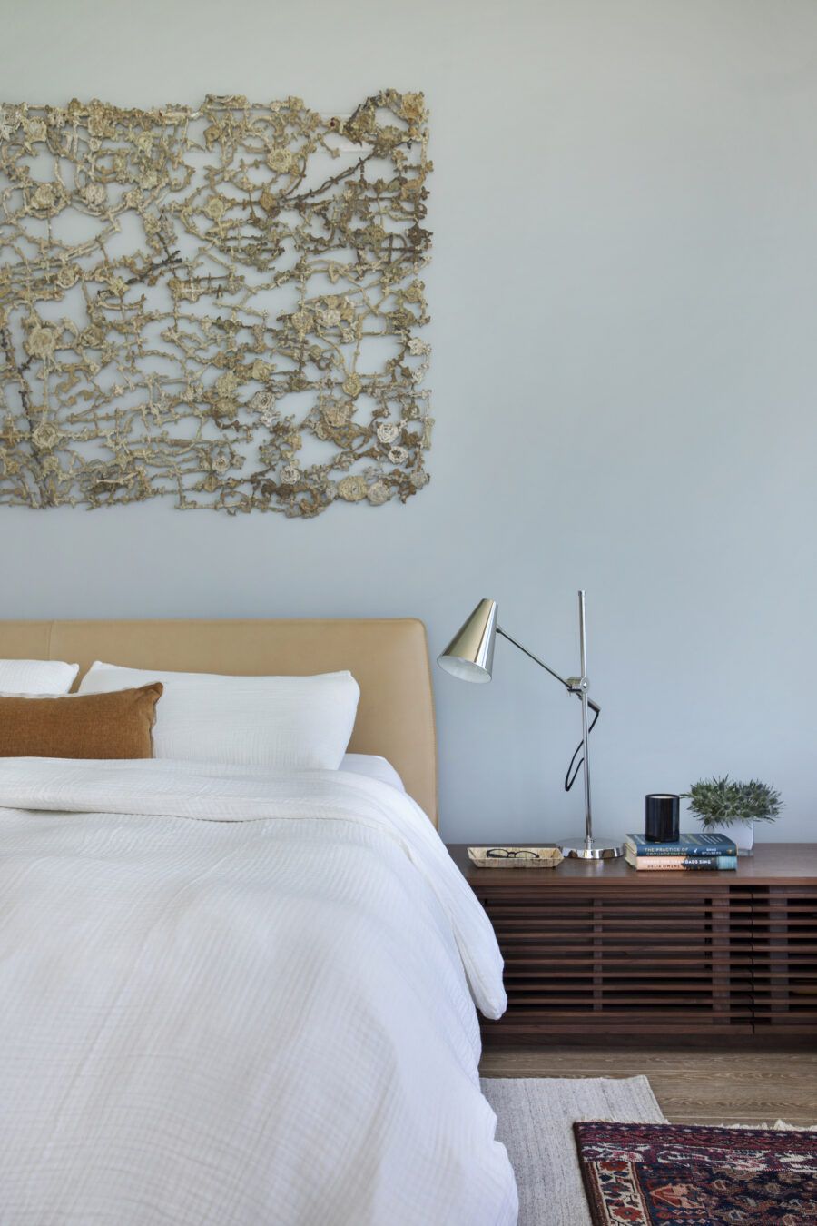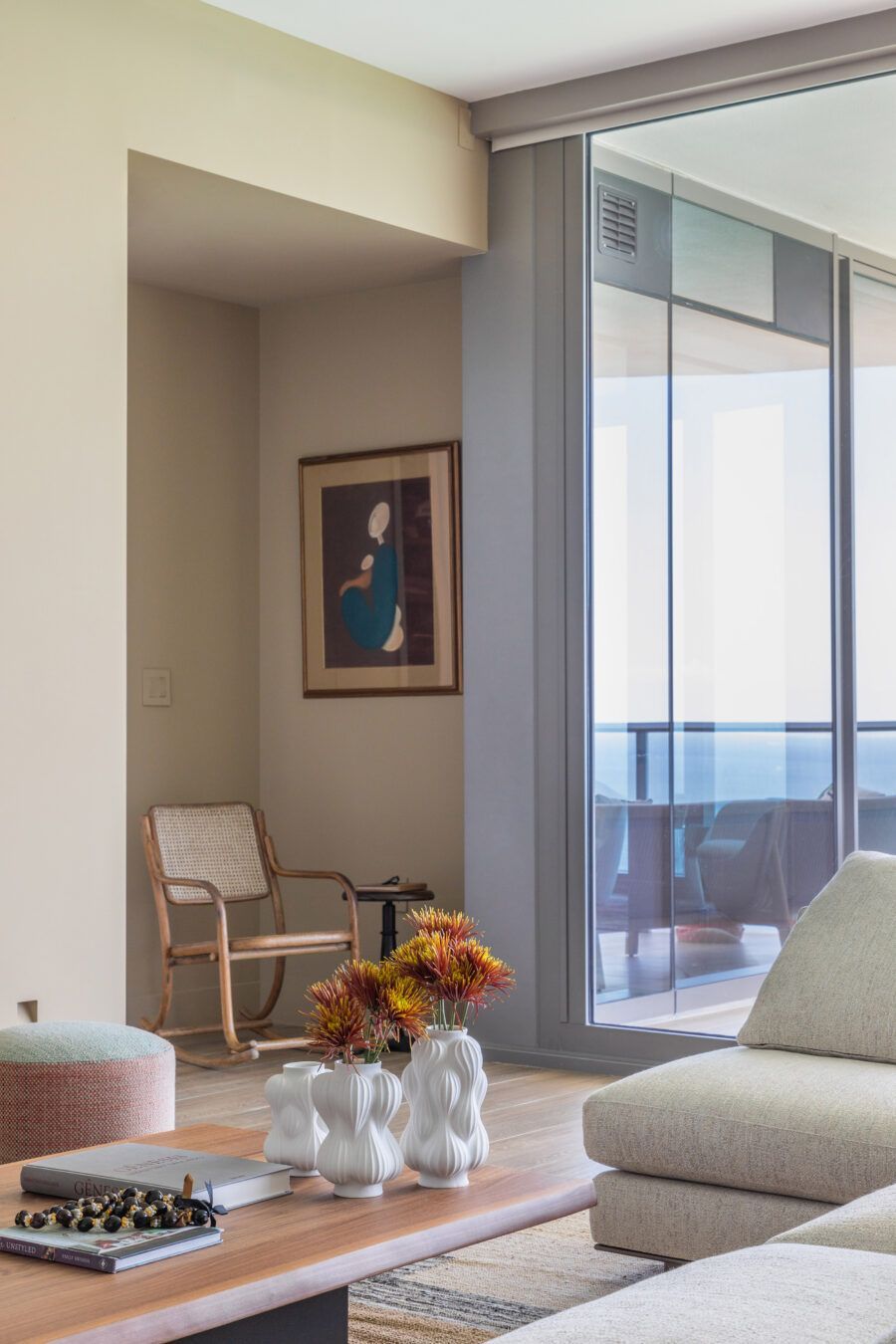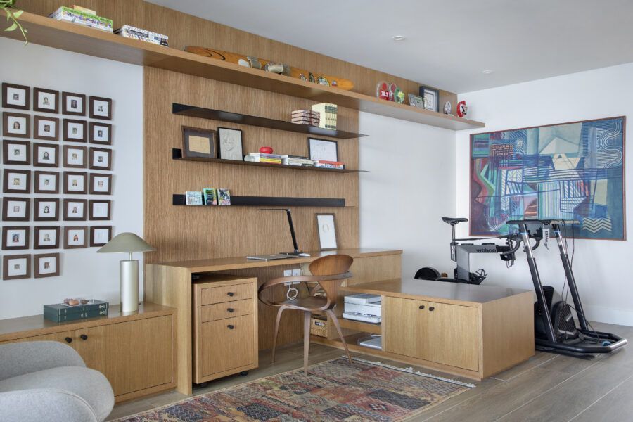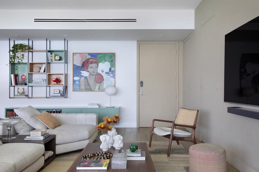 “Por ser um imóvel novo, fizemos pouca reforma e investimos mais na iluminação, nos acabamentos, na marcenaria e na troca do piso. Já os móveis são quase todos novos, enquanto muitos objetos de recordação, algumas obras de arte e uma cadeira de balanço de valor afetivo, que pertencia ao pai do cliente, foram trazidos de São Paulo.”