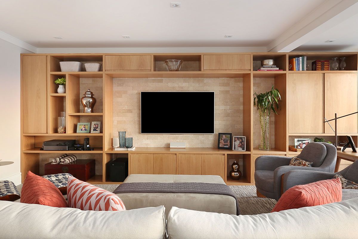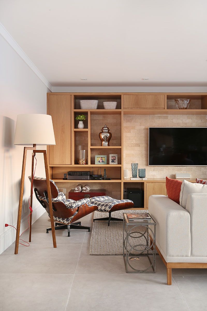 Para ganhar espaço e trazer luminosidade para a área social, o escritório optou por integrar a sala e a varanda, tornando um único ambiente. Para não perder o astral da varanda, foram usados materiais naturais e tons claros em todo o ambiente, com toques de cor nas almofadas e objetos.