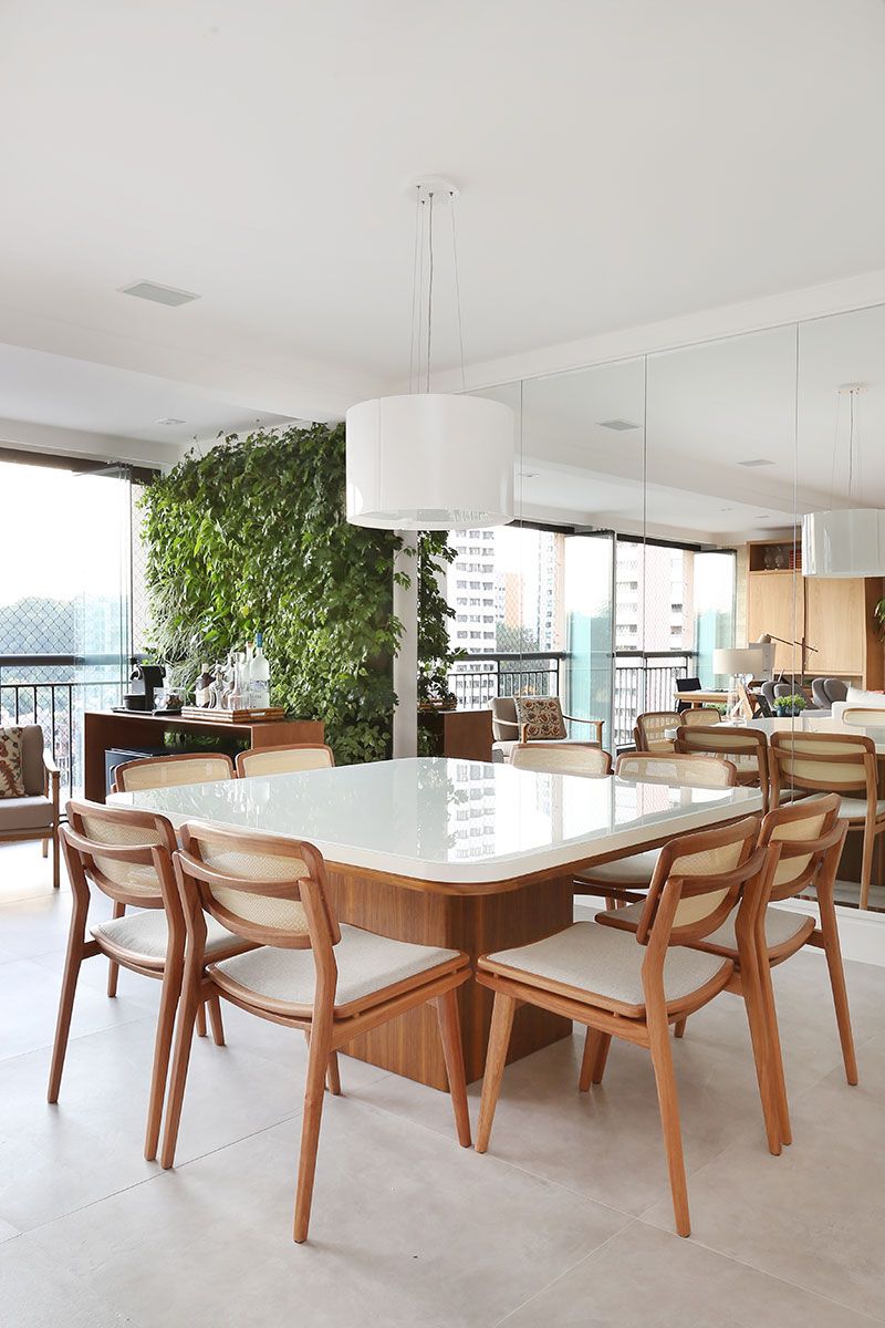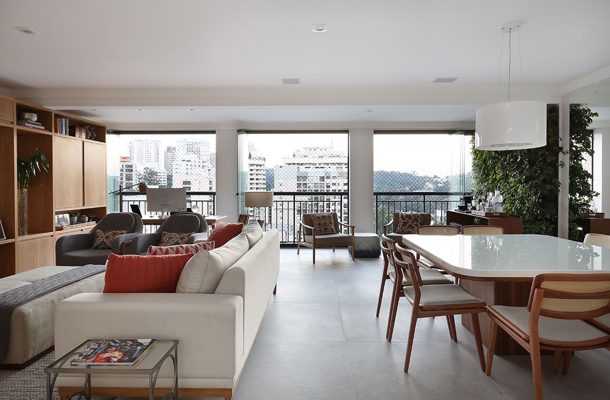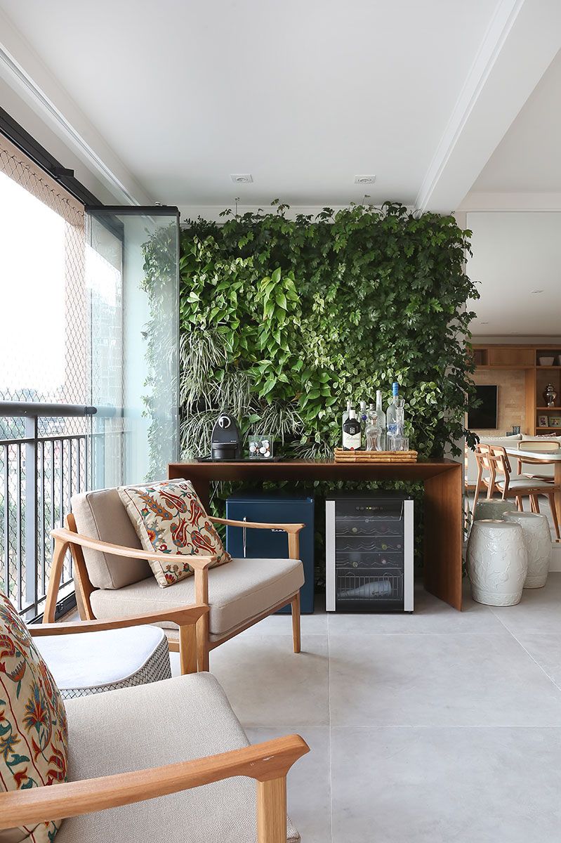 Optamos pelo piso frio e claro, sugerimos um revestimento em pedra natural para fundo da estante de madeira, muito usada também nos móveis. Além da parede verde, com plantas naturais, que é o ponto chave desta integração e o grande diferencial do projeto, que traz cor e vida para todo o ambiente.