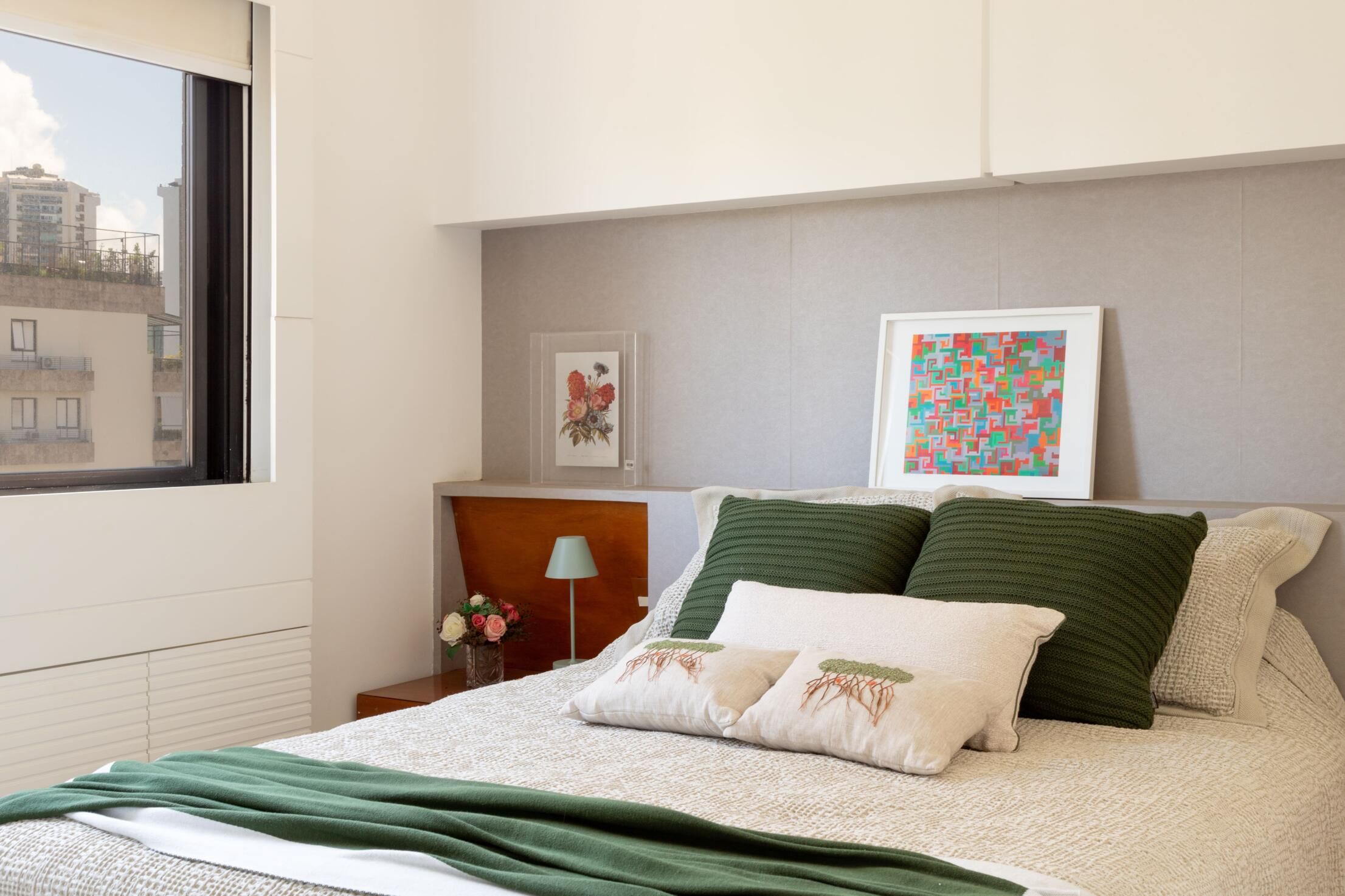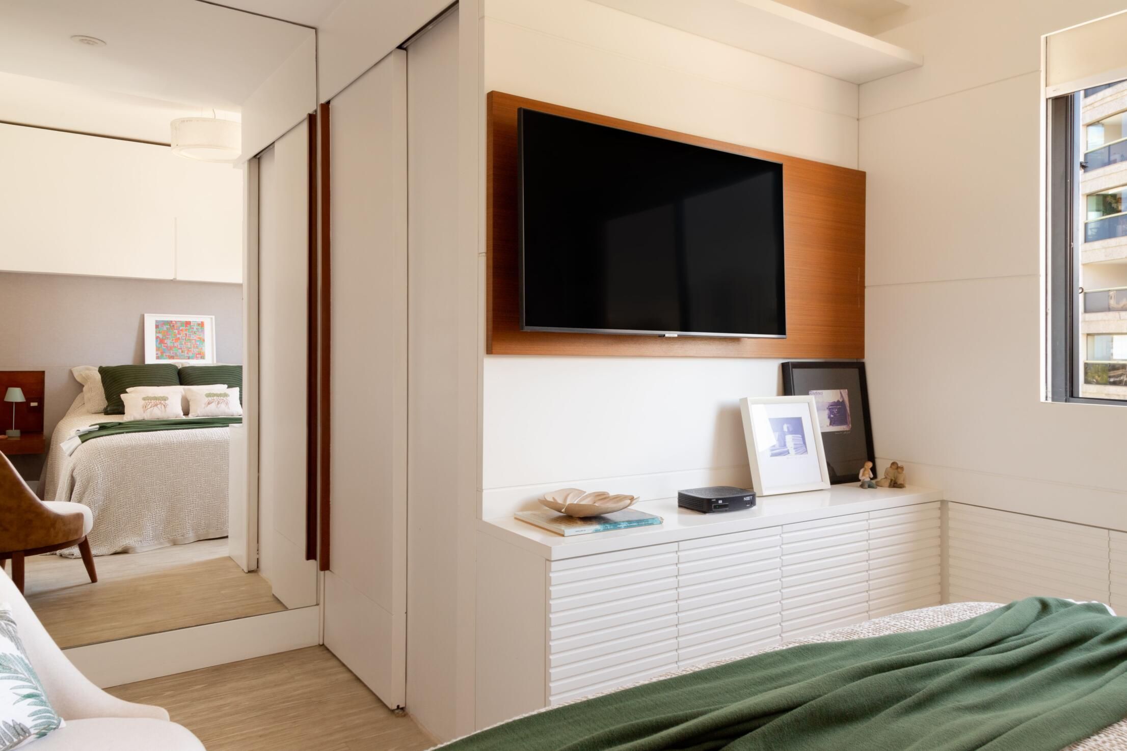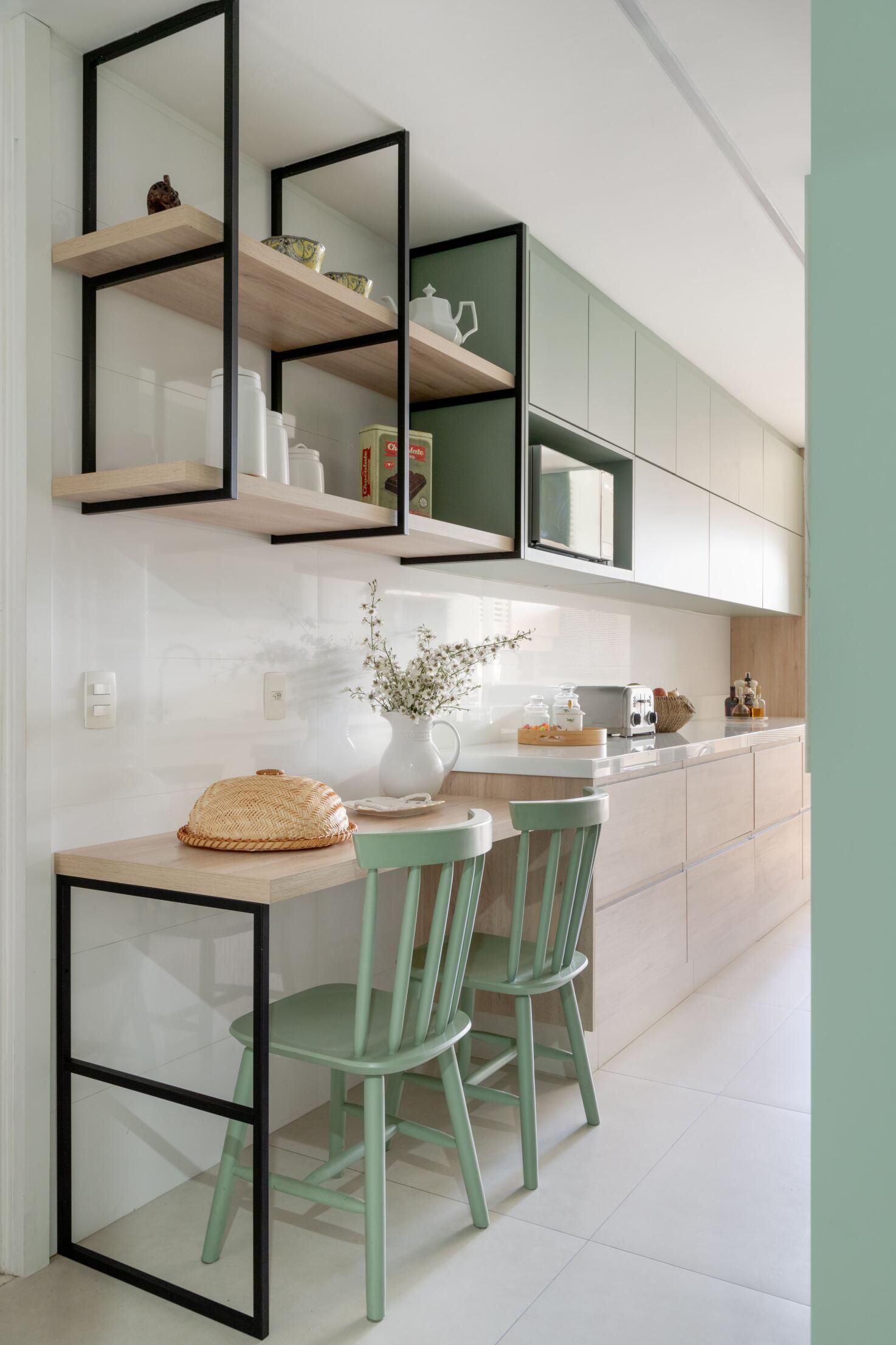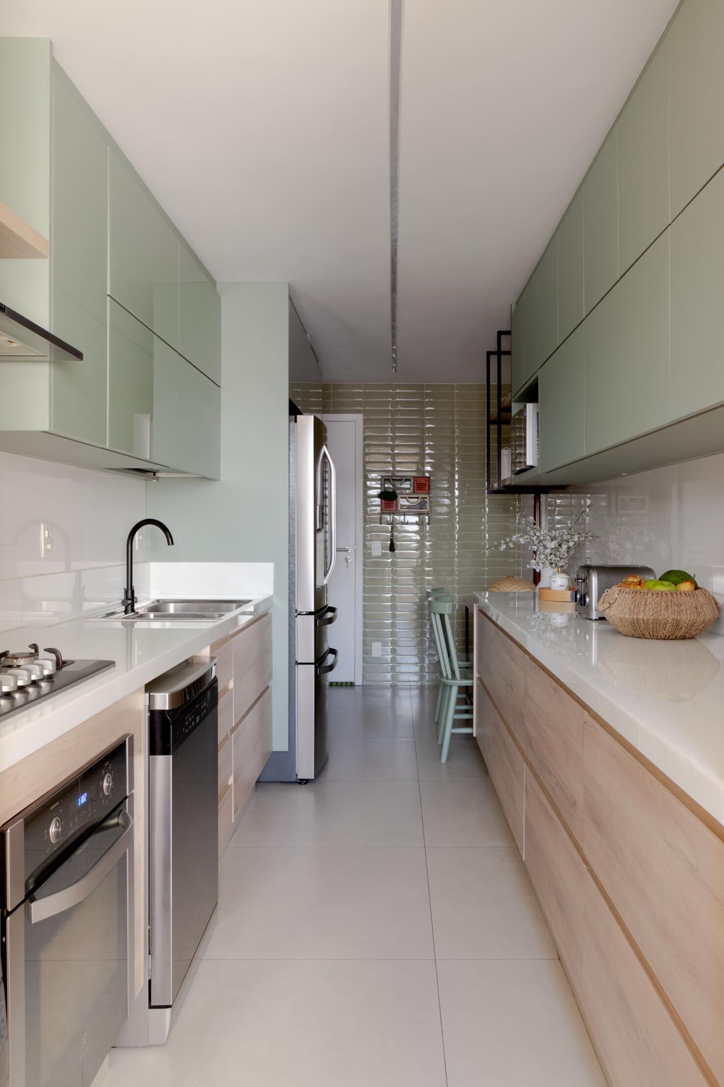 Todo o projeto da área social foi pensado para trazer ares mais acolhedores com mais espaço para receber os amigos, tanto no jantar, como no estar e na varanda. Mas o ambiente que sofreu a maior modificação foi a cozinha, que ganhou uma marcenaria toda nova, em um tom suave de verde. Tudo sem qualquer obra, já que pisos e bancadas tinham sido trocados na reforma anterior e ainda estavam em perfeitas condições.