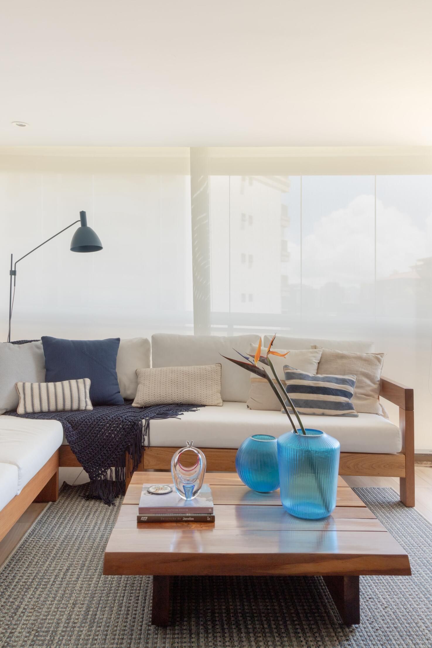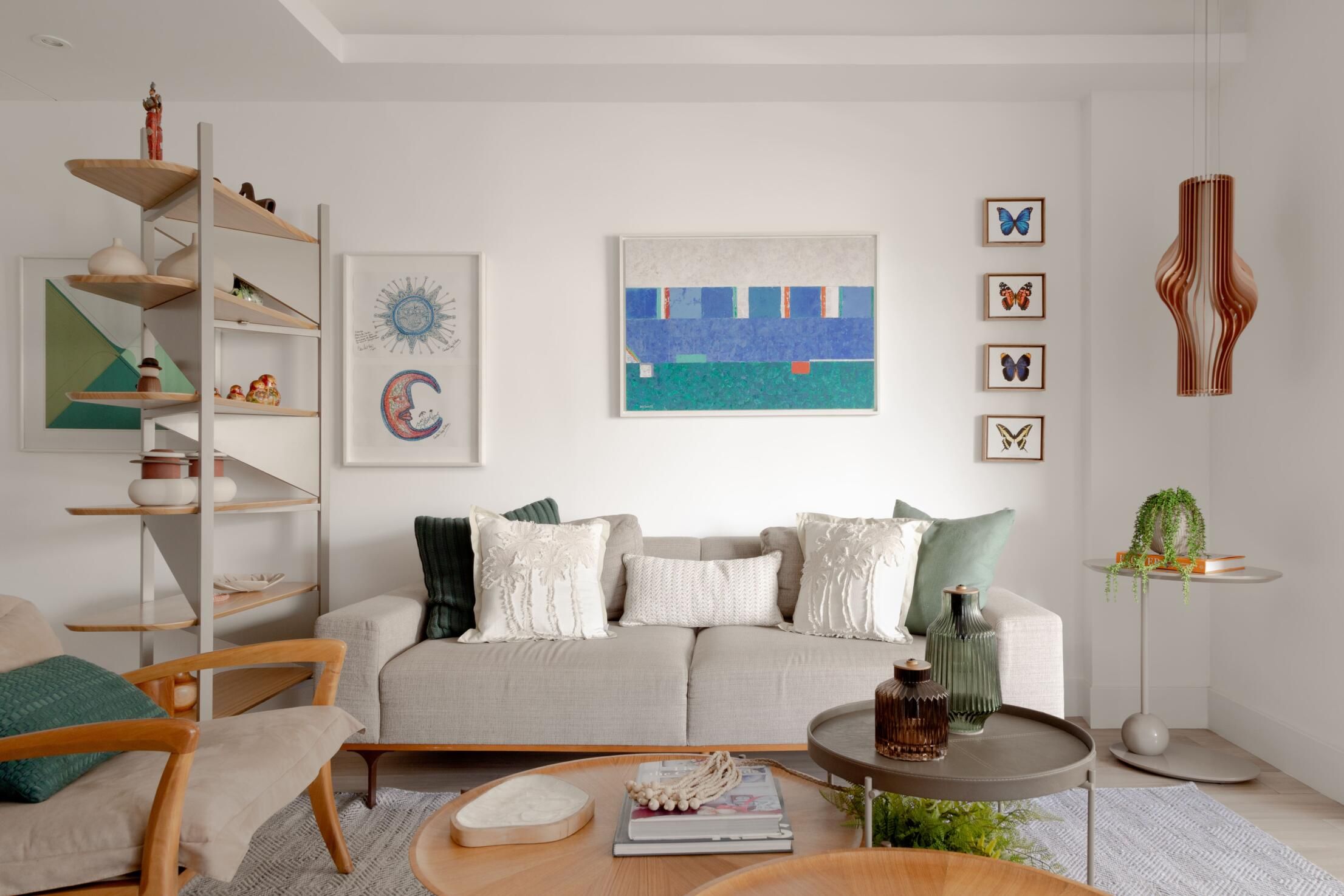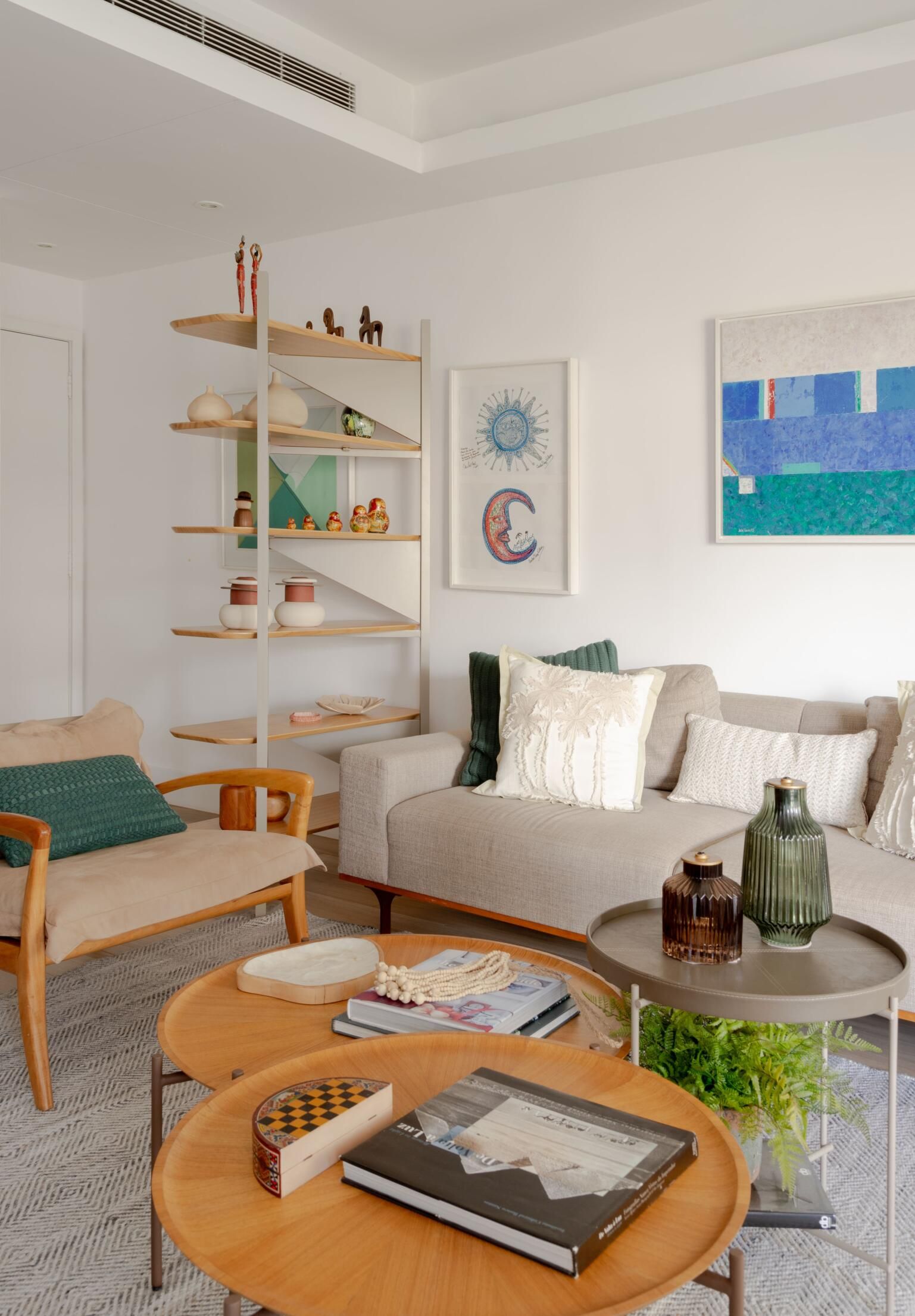 A arquiteta apostou em tons neutros e suaves e materiais naturais como madeira e mármore. Logo na entrada, chama atenção uma estante vazada que ajuda a criar uma sensação de hall no apartamento de 150m². E também traz essa leveza que a decoração pedia, já que o piano – peça-chave do mobiliário – tinha tom muito escuro mas precisava ser mantido na sala, por ser herança de família e carregar muitas memórias afetivas da moradora.