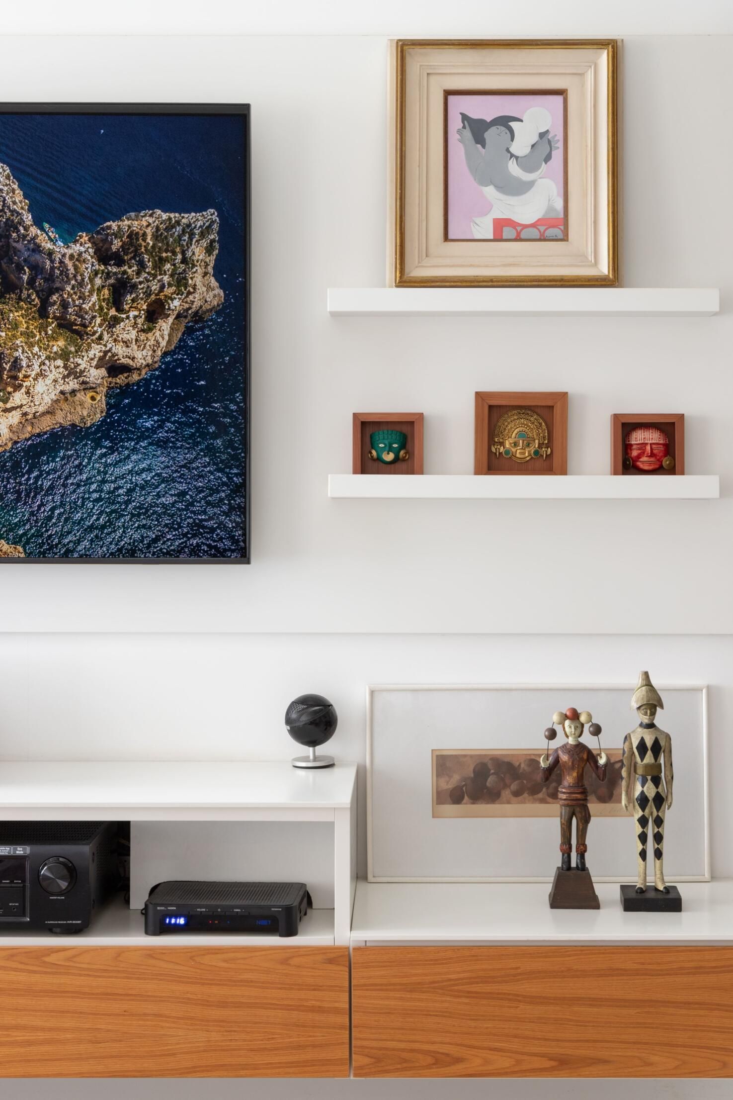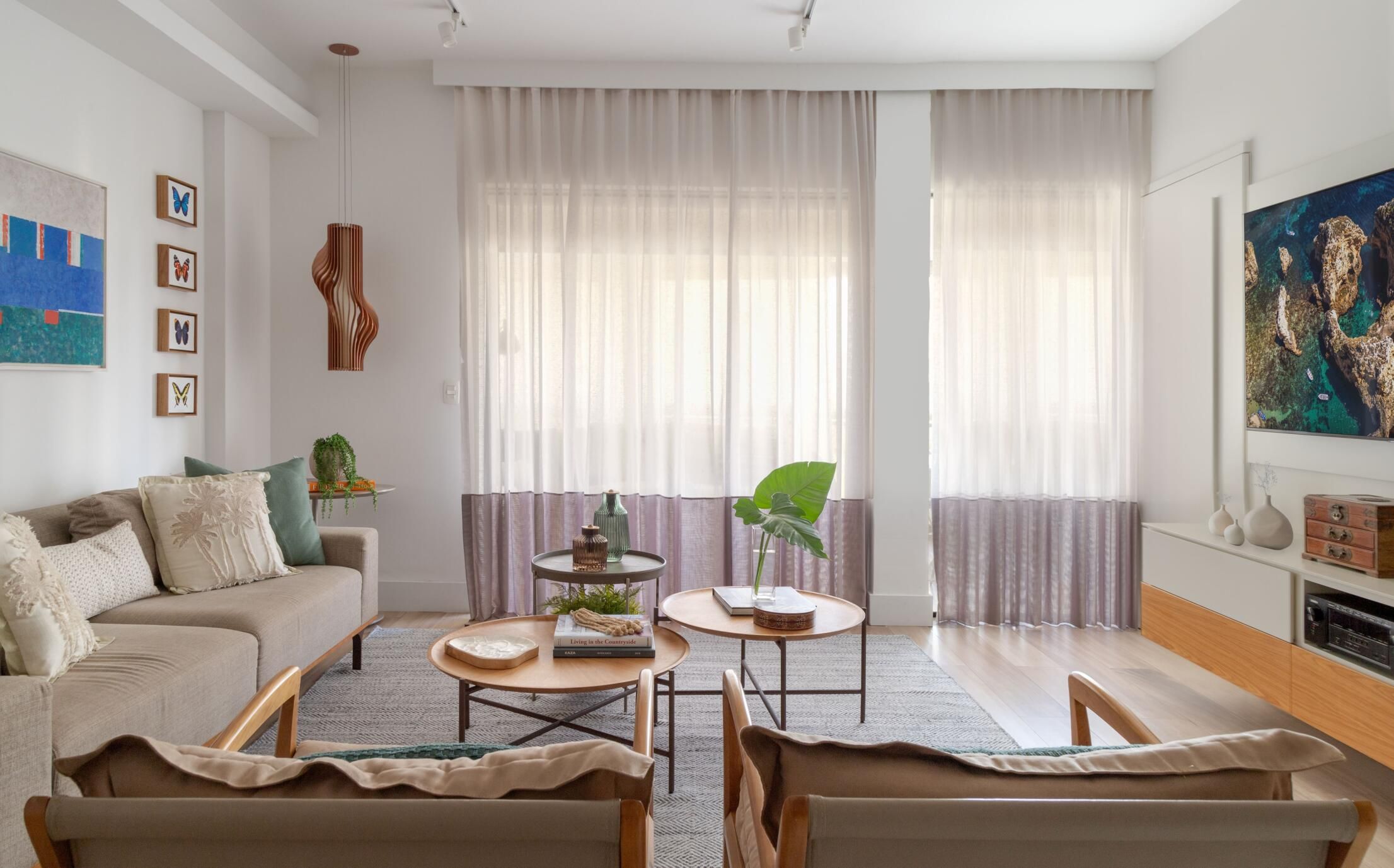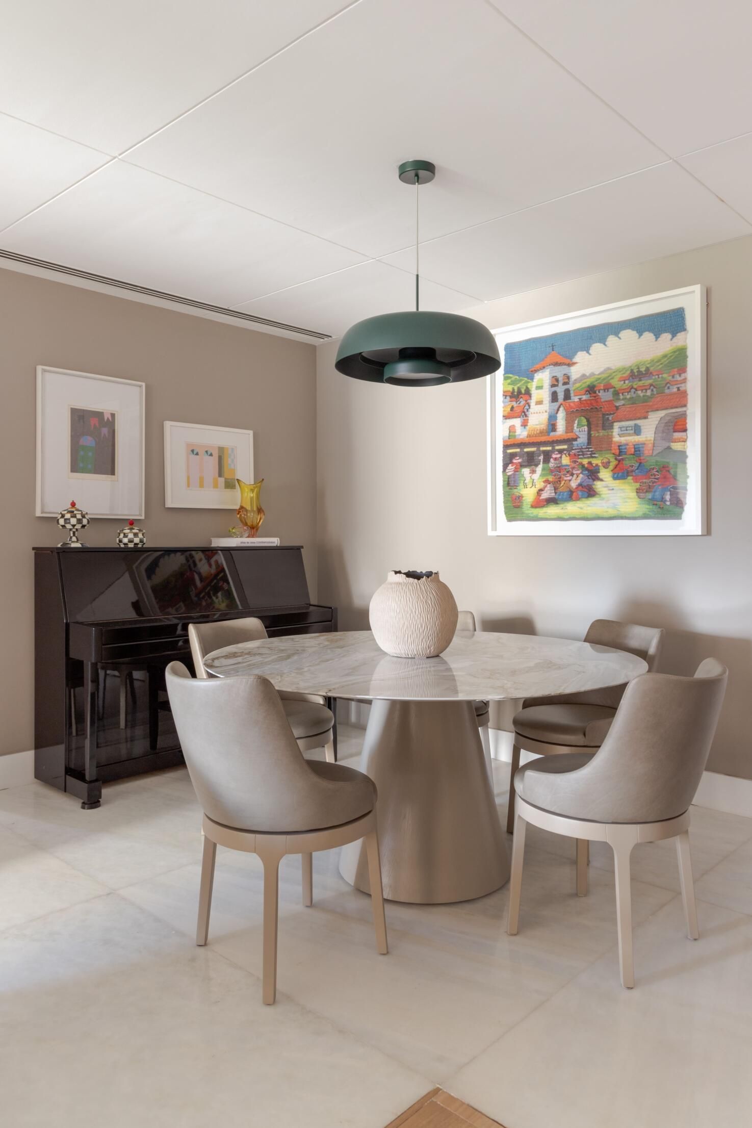 A arquiteta apostou em tons neutros e suaves e materiais naturais como madeira e mármore. Logo na entrada, chama atenção uma estante vazada que ajuda a criar uma sensação de hall no apartamento de 150m². E também traz essa leveza que a decoração pedia, já que o piano – peça-chave do mobiliário – tinha tom muito escuro mas precisava ser mantido na sala, por ser herança de família e carregar muitas memórias afetivas da moradora.
