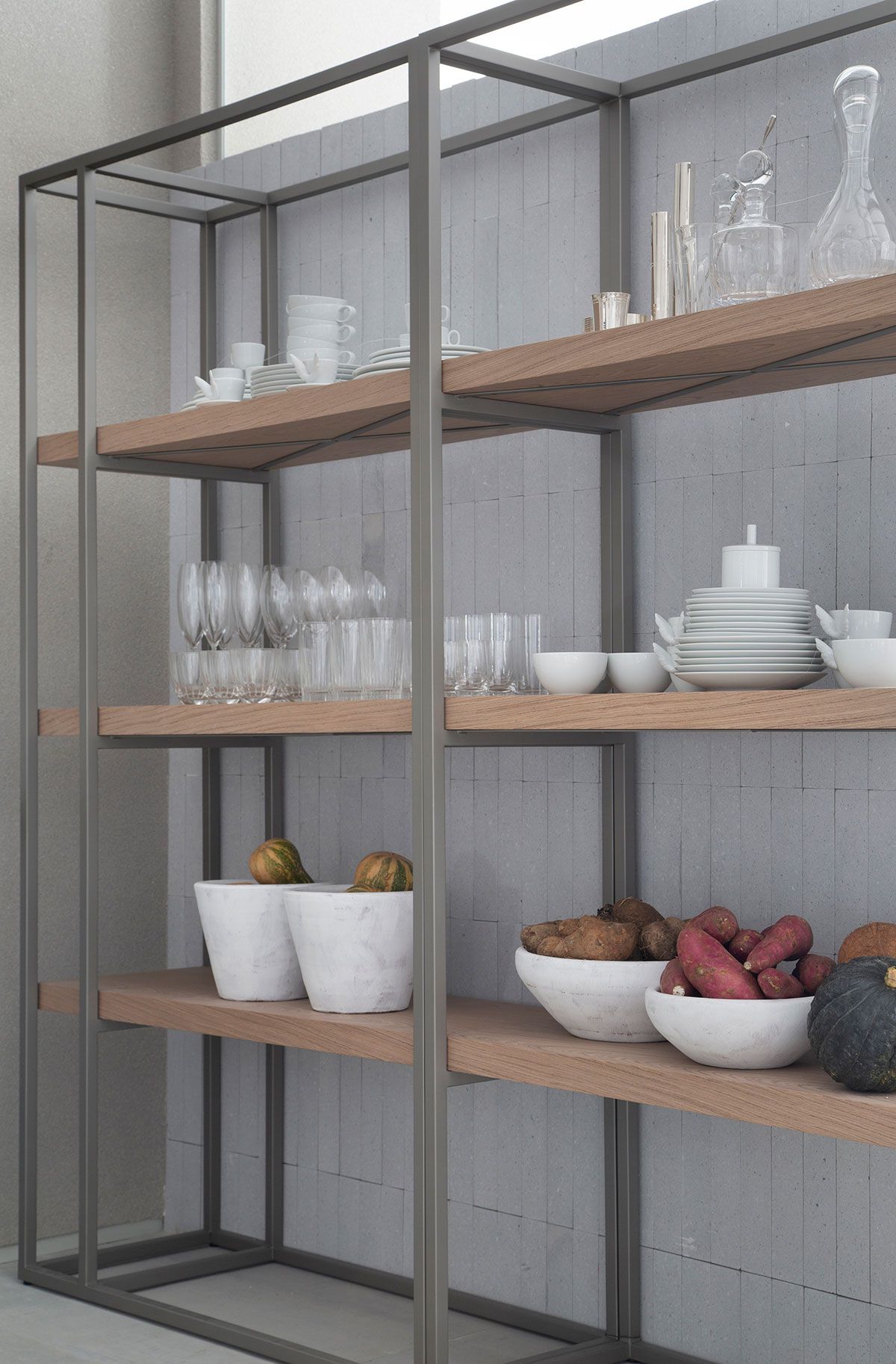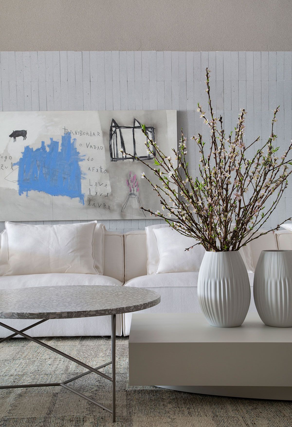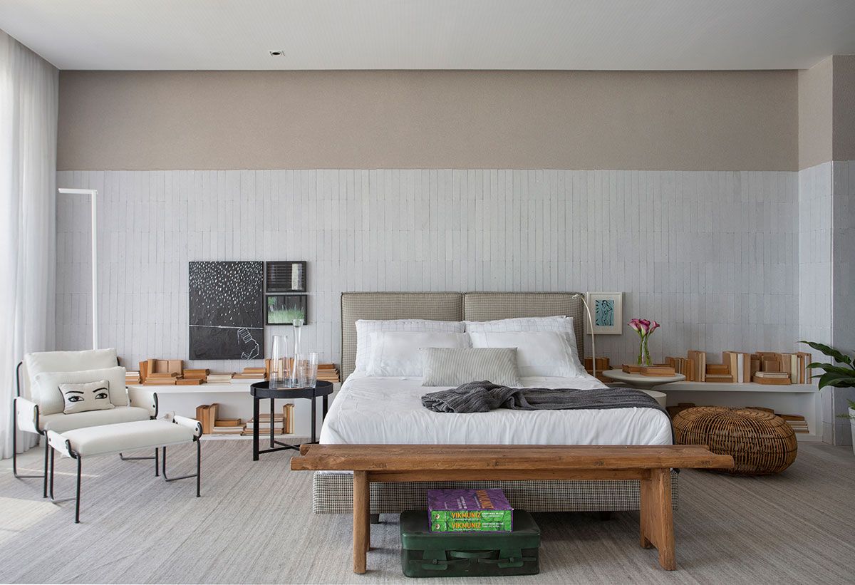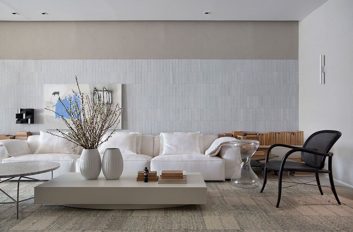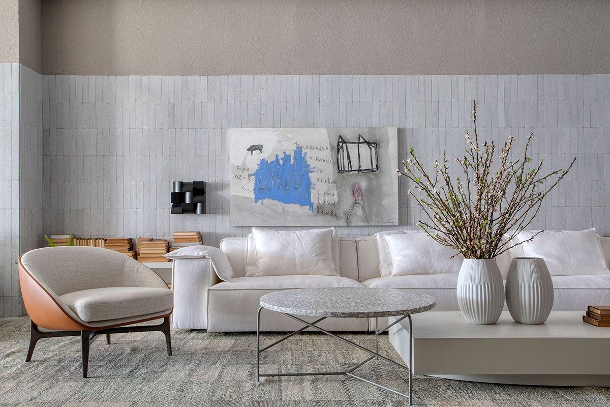 Para traduzir esse clima, a arquiteta apostou em uma decoração atemporal, com poucos móveis e objetos cuidadosamente selecionados que remetem a memória afetiva, em uma paleta de tons claros, brancos e acinzentados, com toques de preto e madeira. Os pontos de cor ficam a cargo das muitas plantas, distribuídas em vasos de diversas alturas, que conferem frescor e vida ao ambiente.