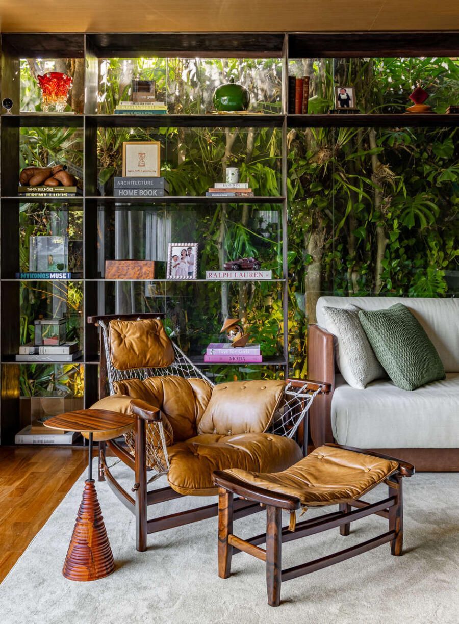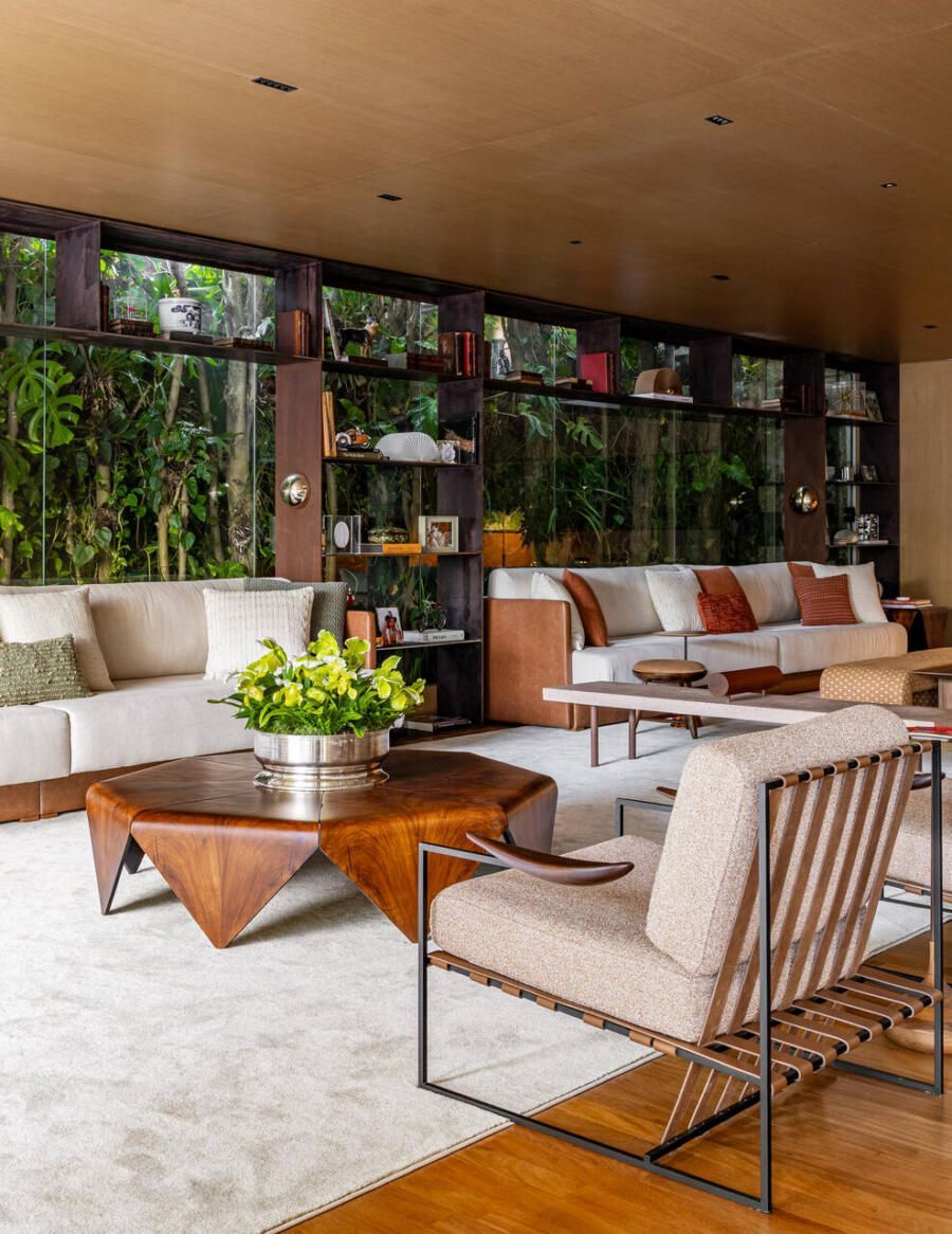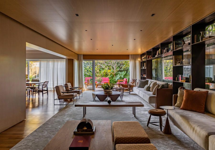 O layout se organiza em dois ambientes, living e home, dispostos de maneira simétrica e separados apenas pelo mobiliário. A estante em corten, elemento preferido da arquiteta e peça-chave do projeto, surge como um filtro elegante diante do paisagismo. Mais fina e delicada do que uma estante tradicional em madeira, ela abriga memórias da família e adiciona um toque contemporâneo a um projeto de linguagem clássica, marcado por tons terrosos, madeira e detalhes em corten.