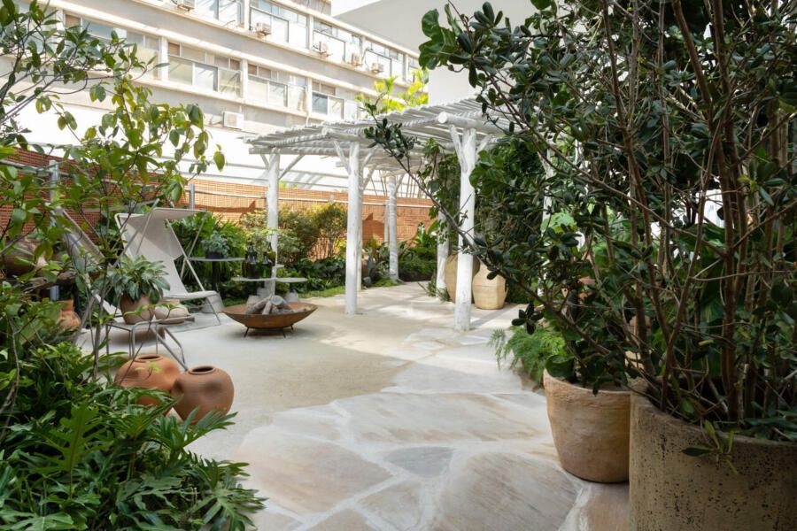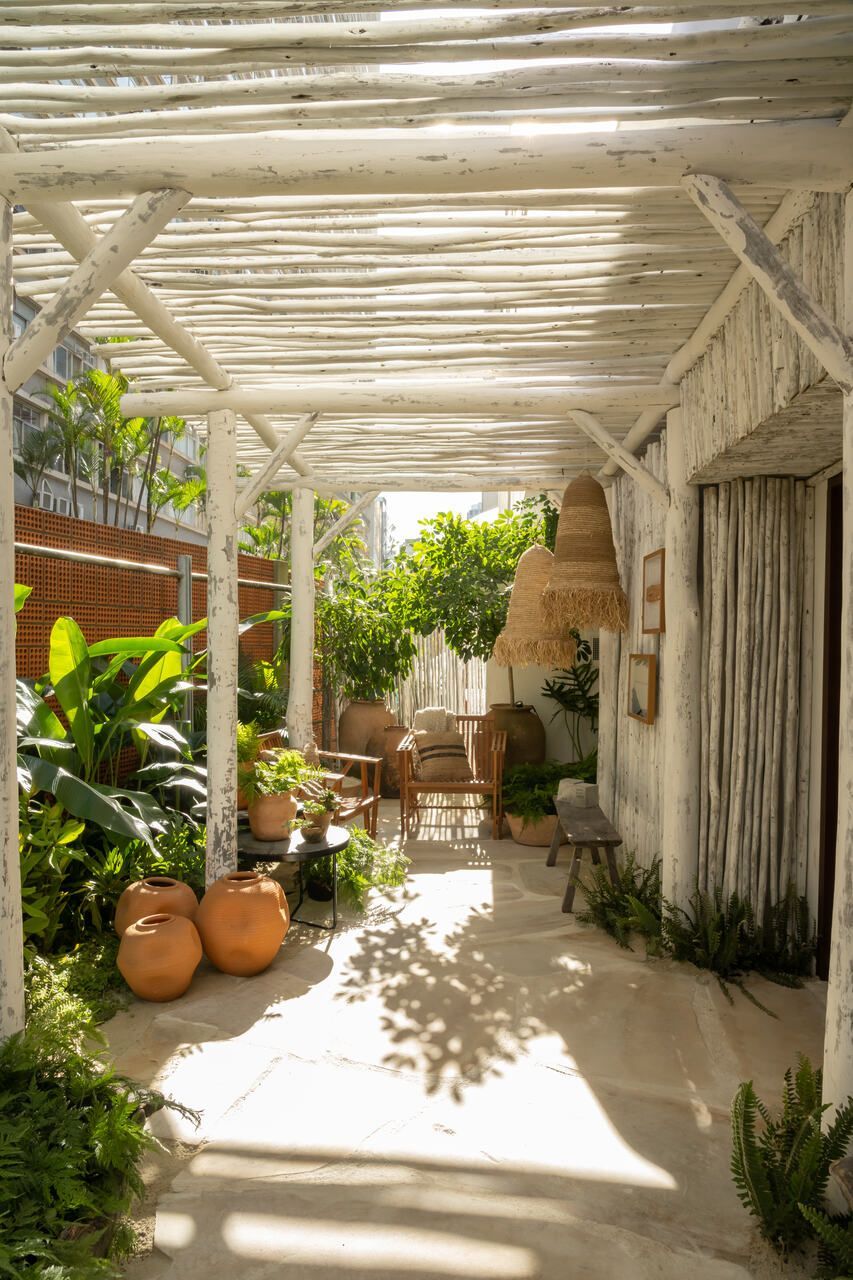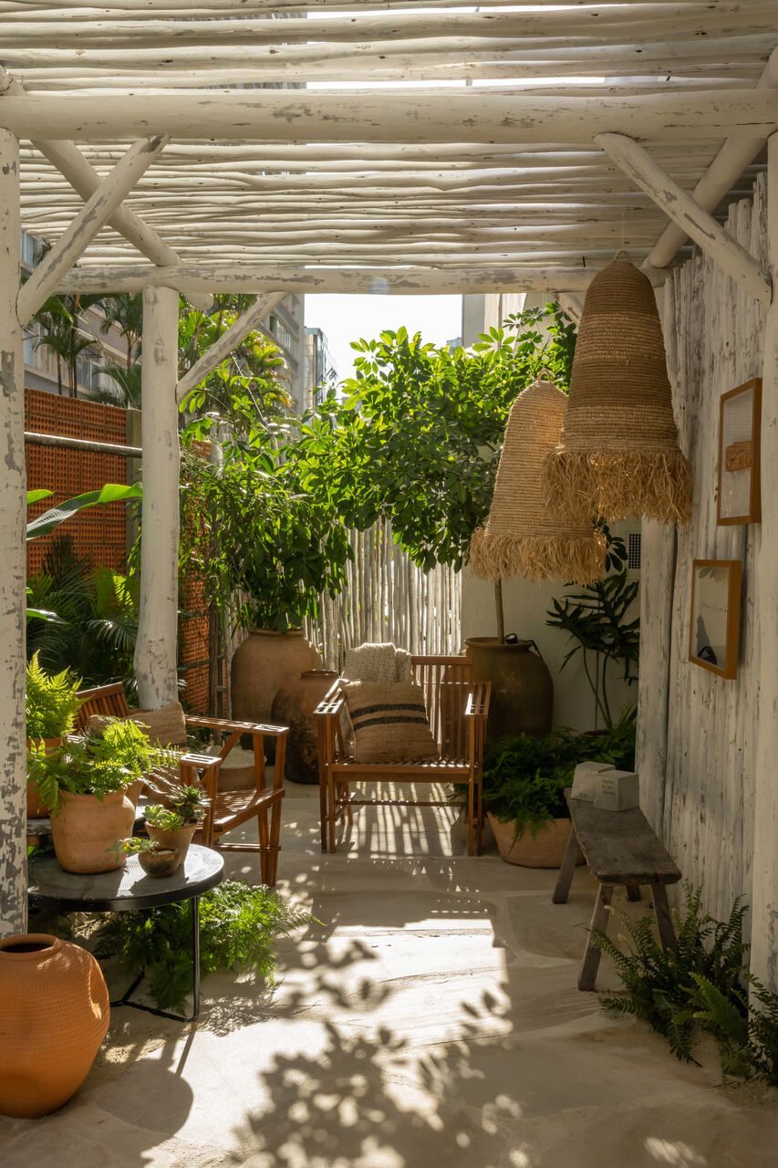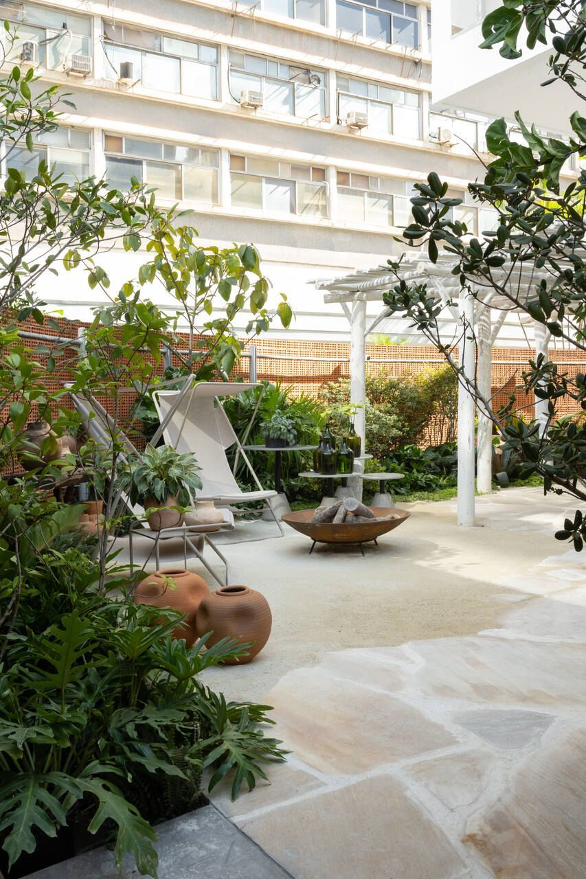 O refúgio em plena Avenida Paulista conta com biribas de eucalipto no pergolado, pedras São Tomé brutas e areia no piso em seus 110m².