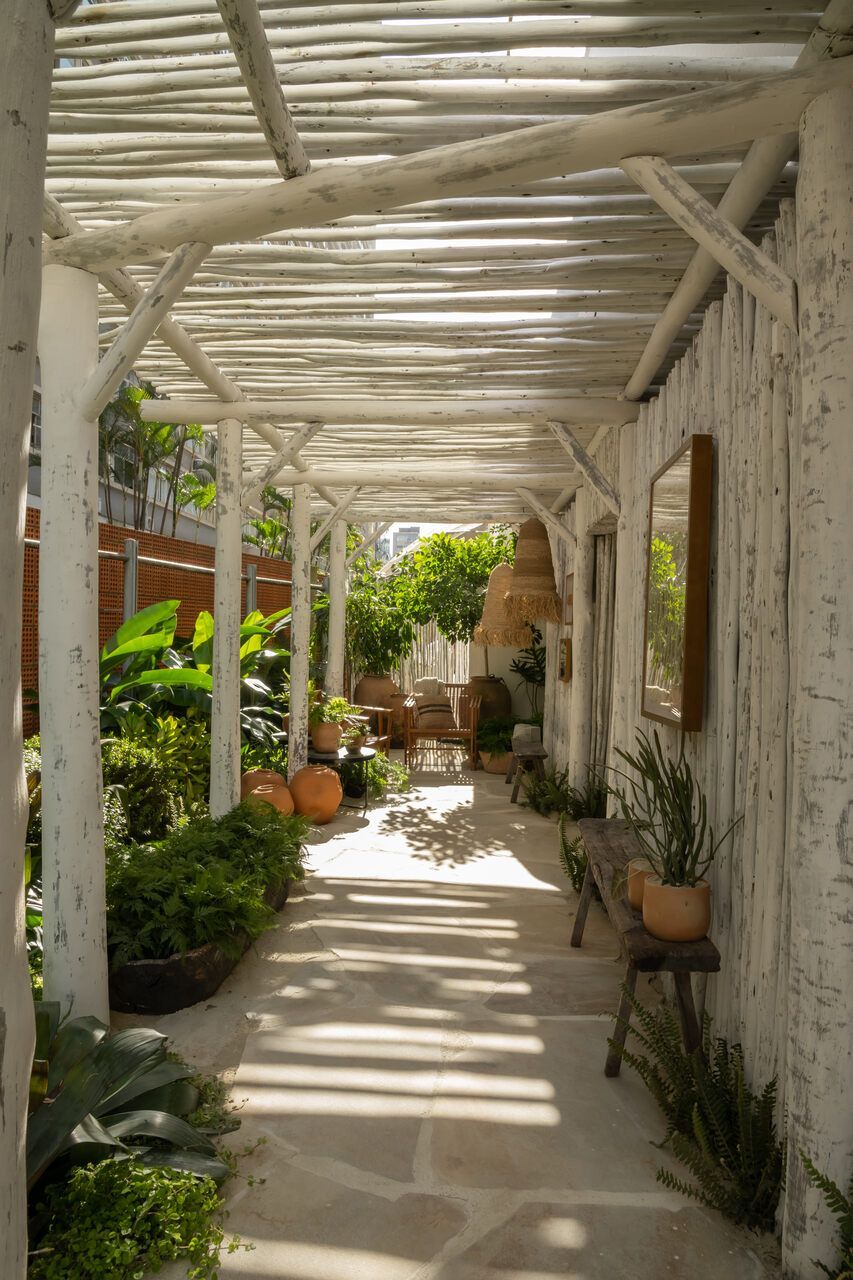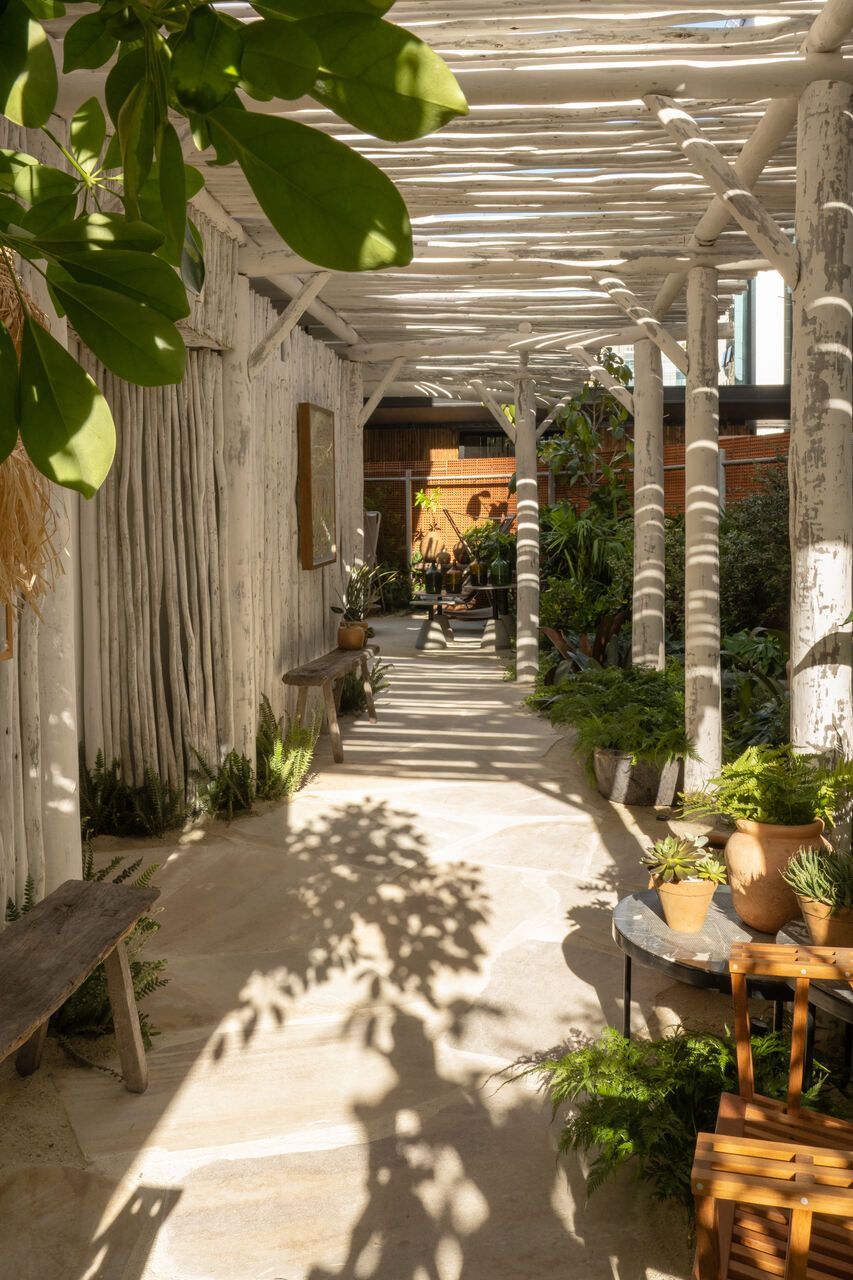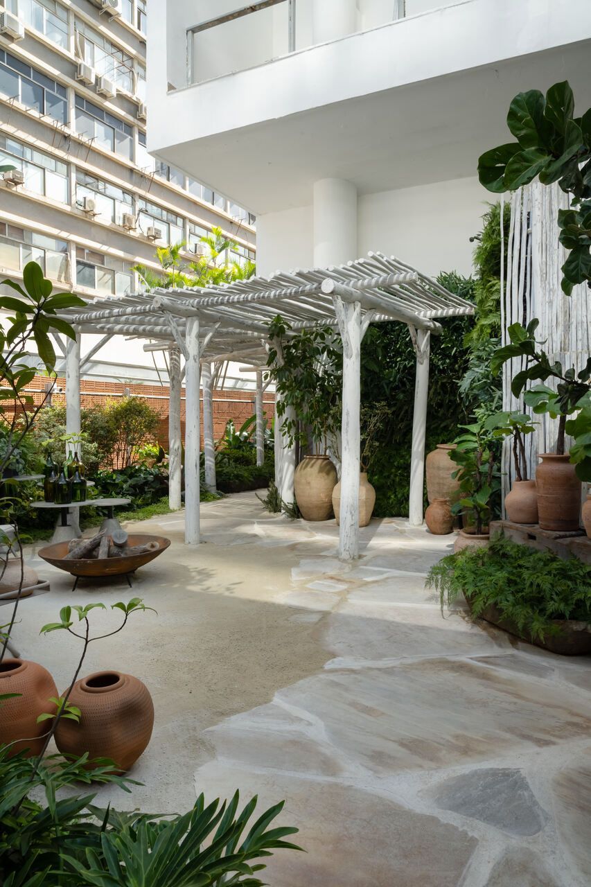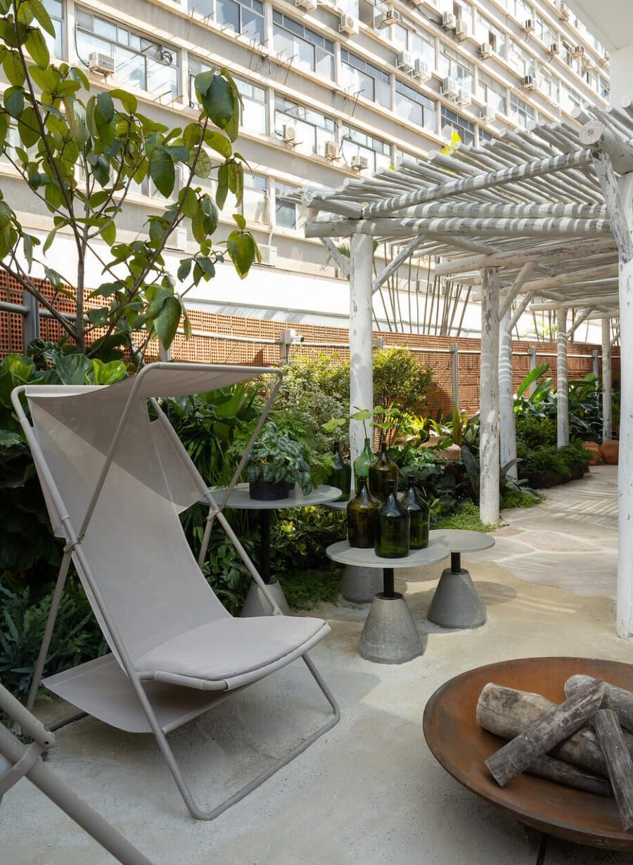 O refúgio em plena Avenida Paulista conta com biribas de eucalipto no pergolado, pedras São Tomé brutas e areia no piso em seus 110m².