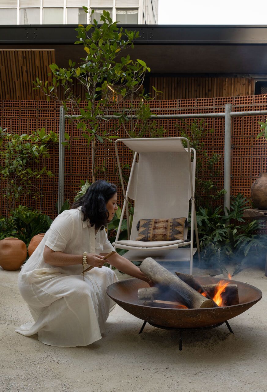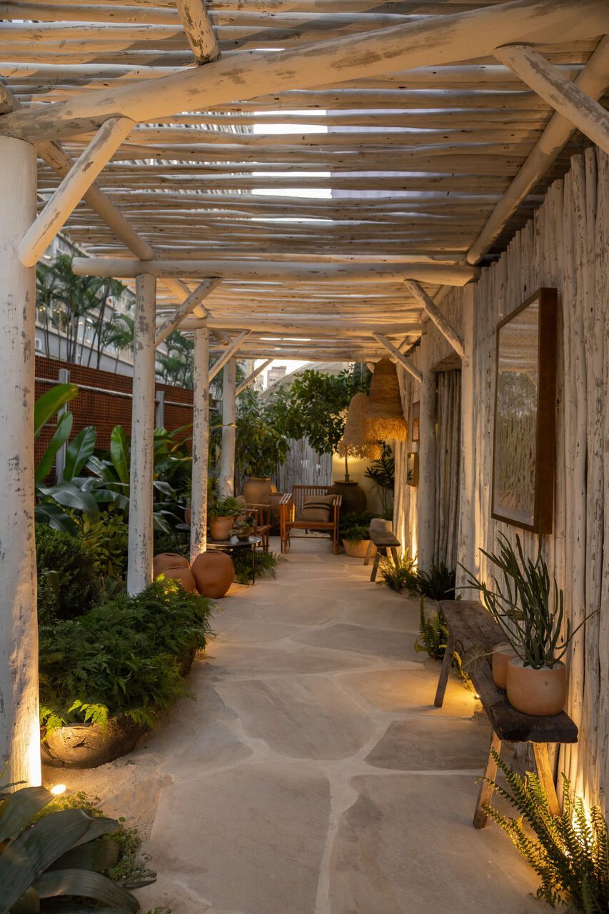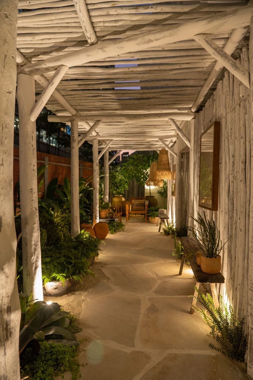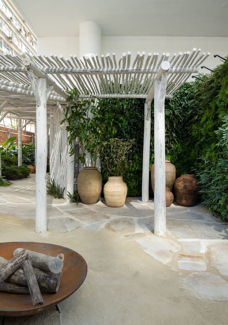 O refúgio em plena Avenida Paulista conta com biribas de eucalipto no pergolado, pedras São Tomé brutas e areia no piso em seus 110m².
