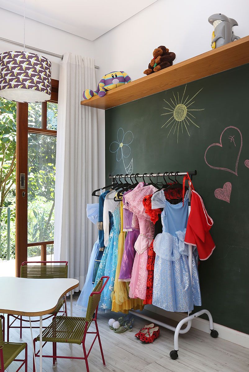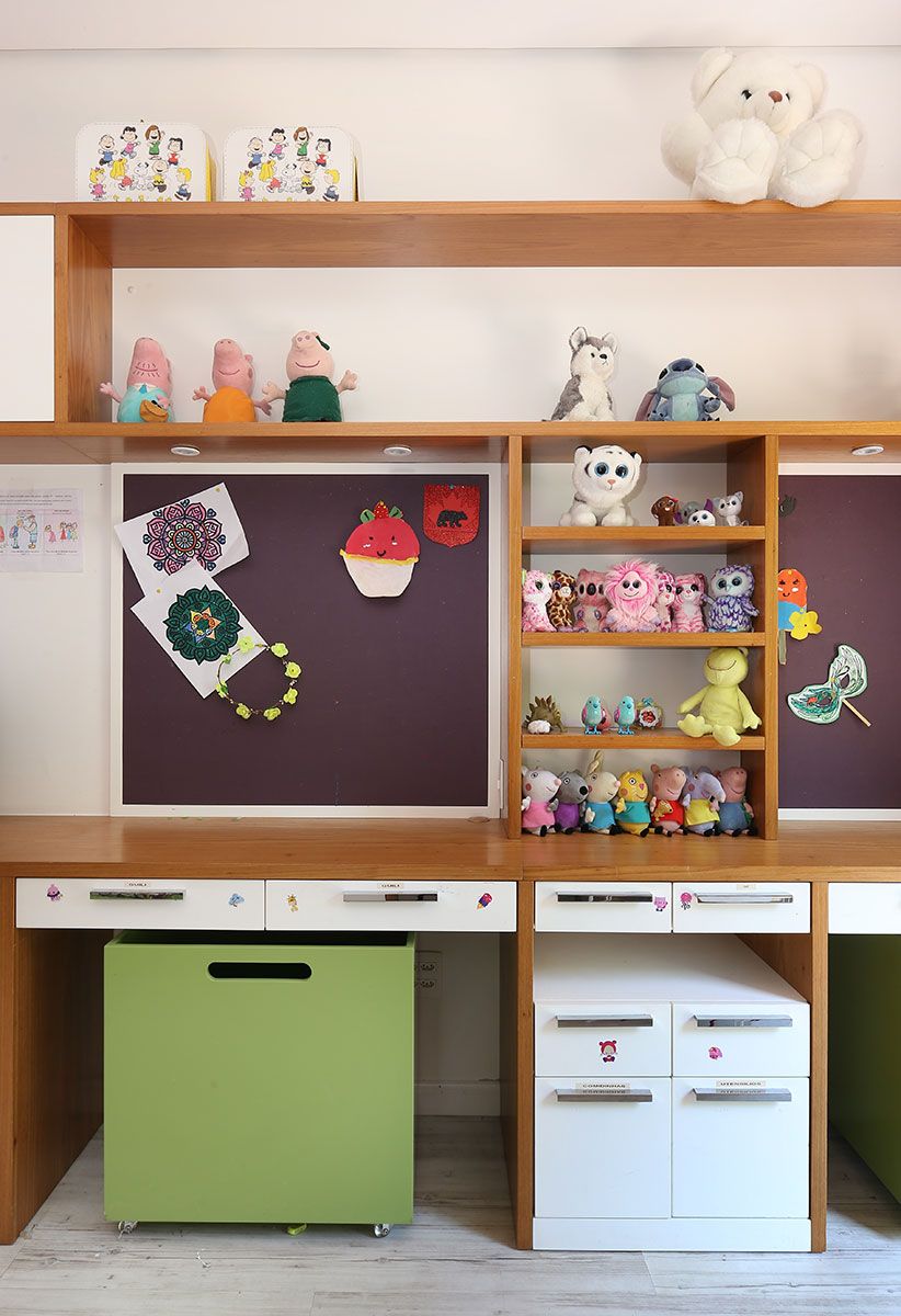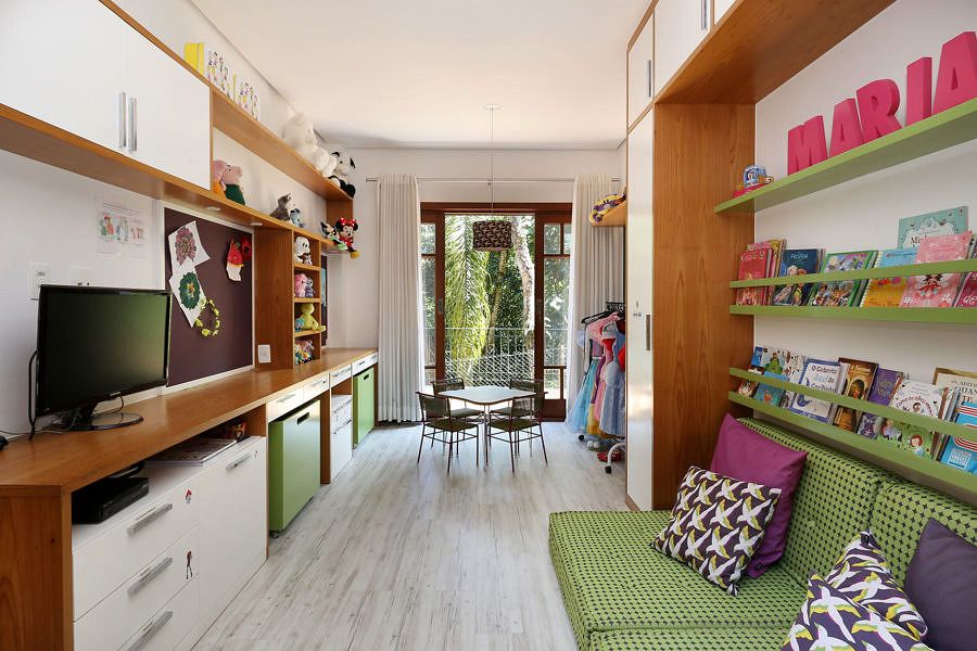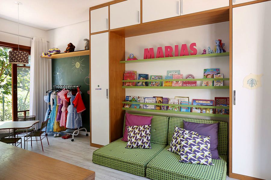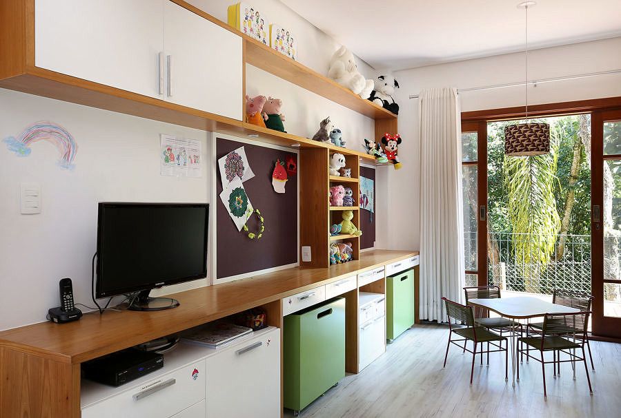 A brinquedoteca recebeu atenção especial dos decoradores, que desenharam a marcenaria especialmente para o espaço das crianças. A paleta neutra serve de base para o uso pontual do verde, evocando o universo lúdico sem exageros.