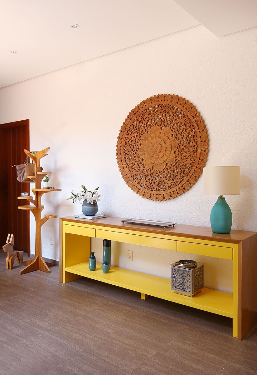 Elementos naturais, como cerâmica e madeira, estão por todos os ambientes. O hall social, cartão de visitas da morada, foi decorado com peças escolhidas a dedo, a exemplo do cabideiro Árvore Generosa (com design assinado por Pedro Useche) e do aparador Cascas (de Leonardo Garcia).