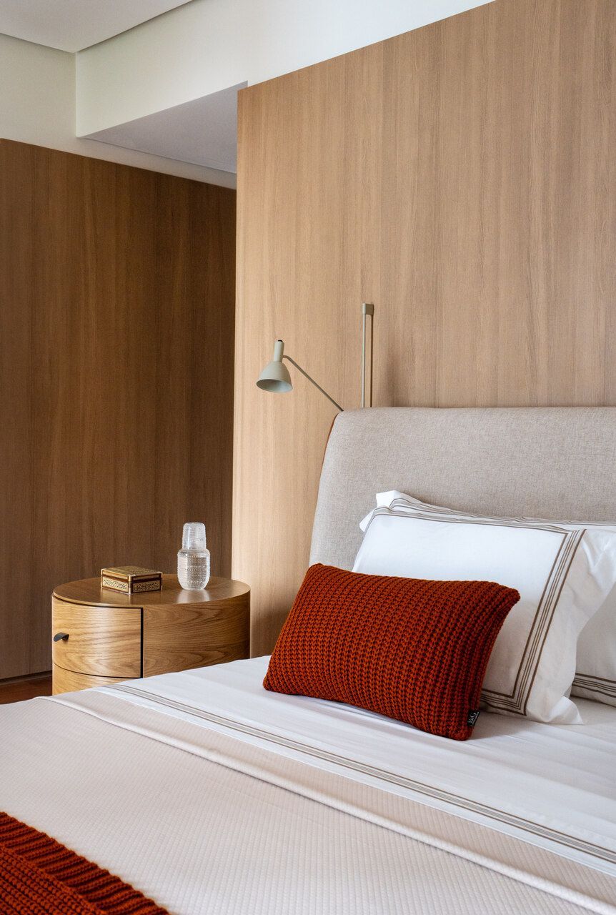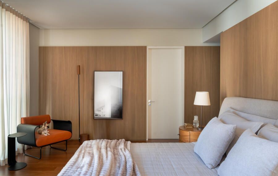 Já na decoração, peças de design assinado e marcenaria sob medida, desenhada pela própria arquiteta, dão personalidade aos ambientes. A paleta de cores valoriza os materiais naturais e aposta em tons quentes, com destaque para a madeira, além de toques pontuais de azul petróleo, vinho, verde-musgo, rosa antigo e vermelho, presentes em mobiliário e obras de arte. Entre os destaques, estão criações dos designers Luan Del Savio, Daniela Ferro, Gracia Mendes, Luisa Moysés, Salva, Alain Blatchè e Roque Frizzo.